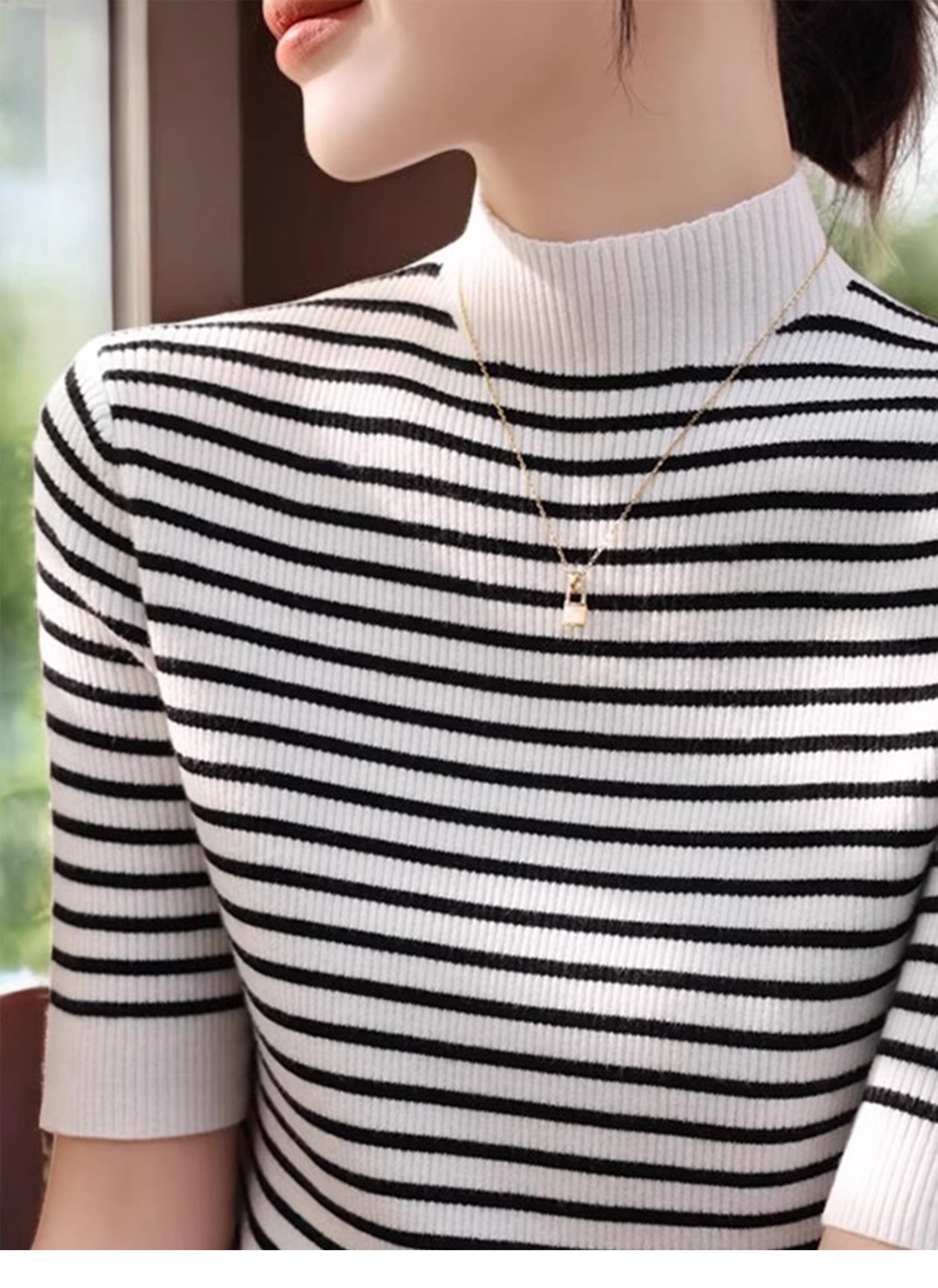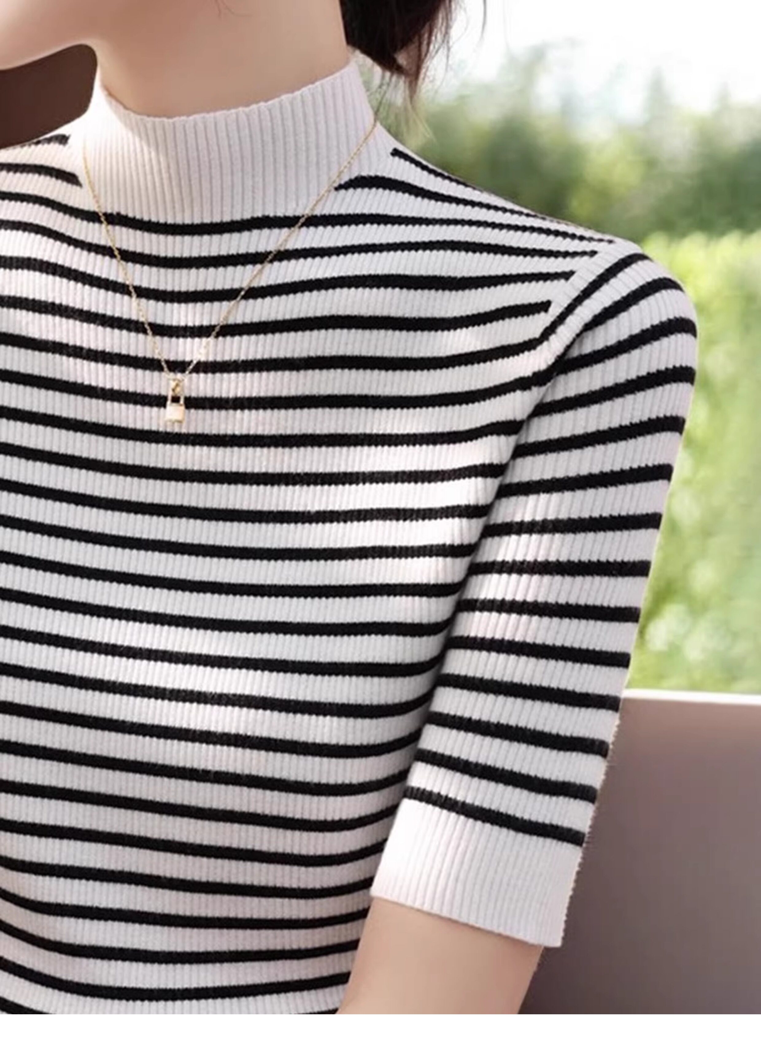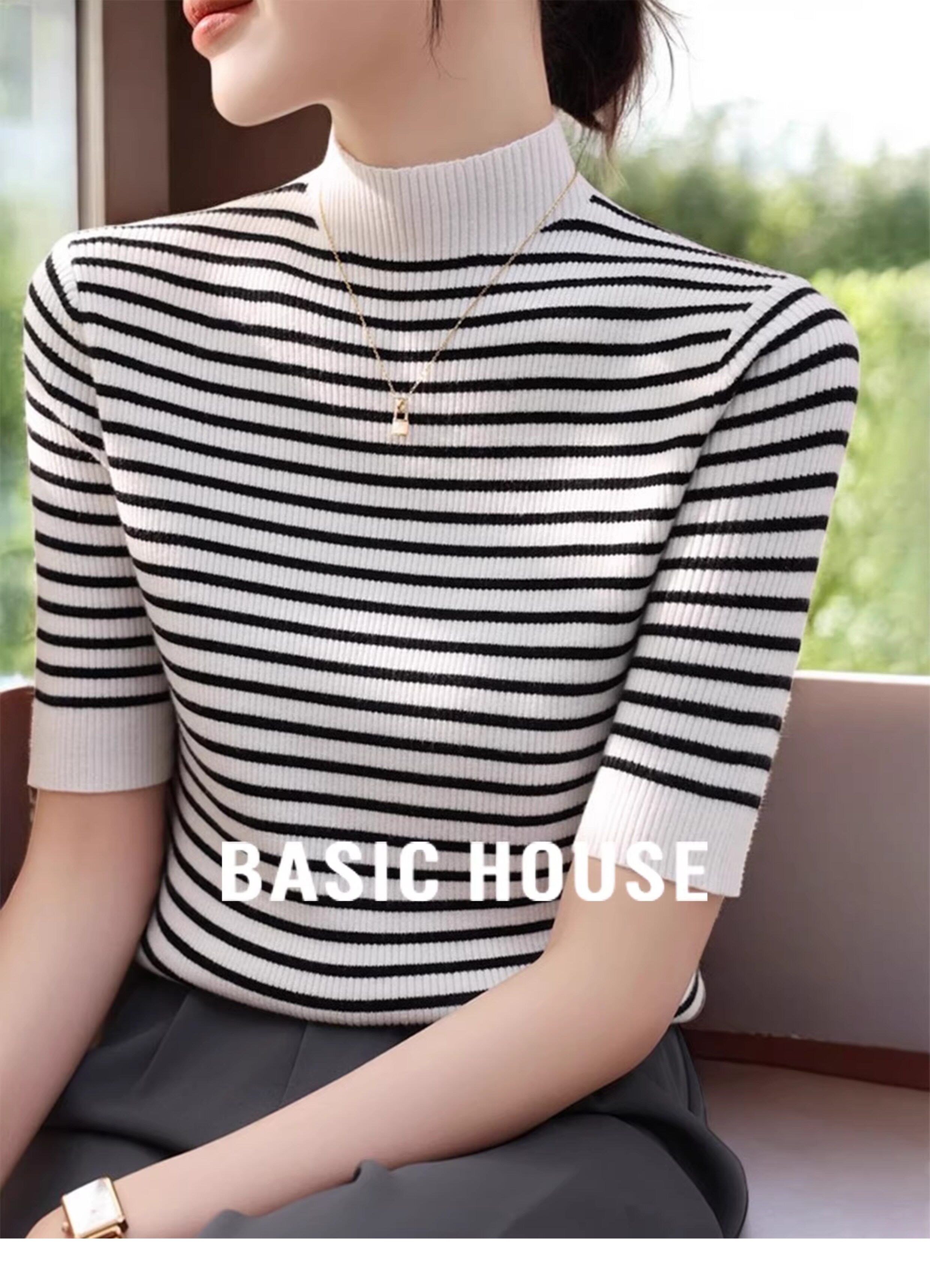 Basic House/百家好黑白條紋五分袖針織衫女春夏內搭半高領打底衫