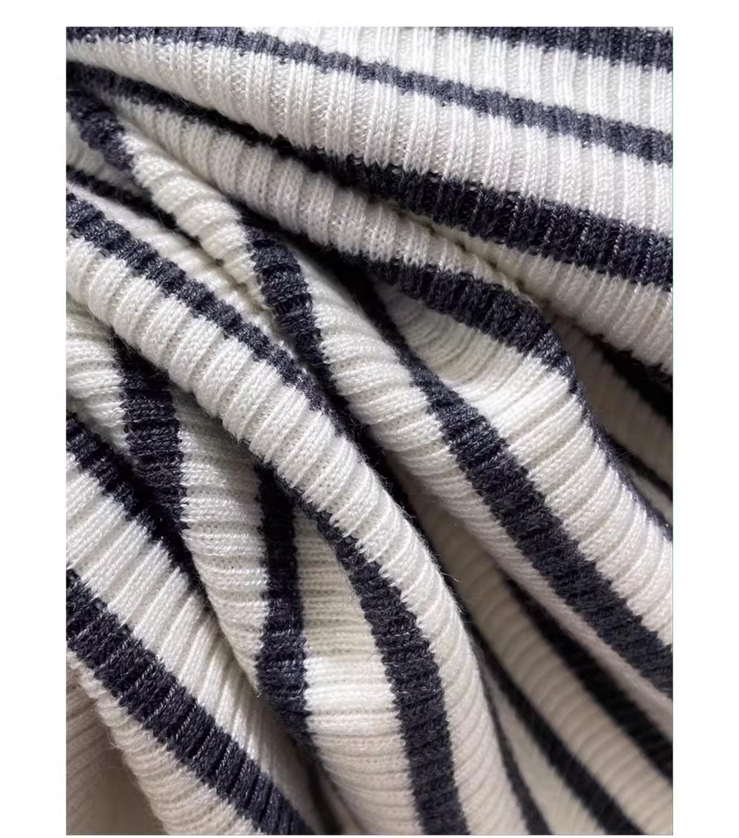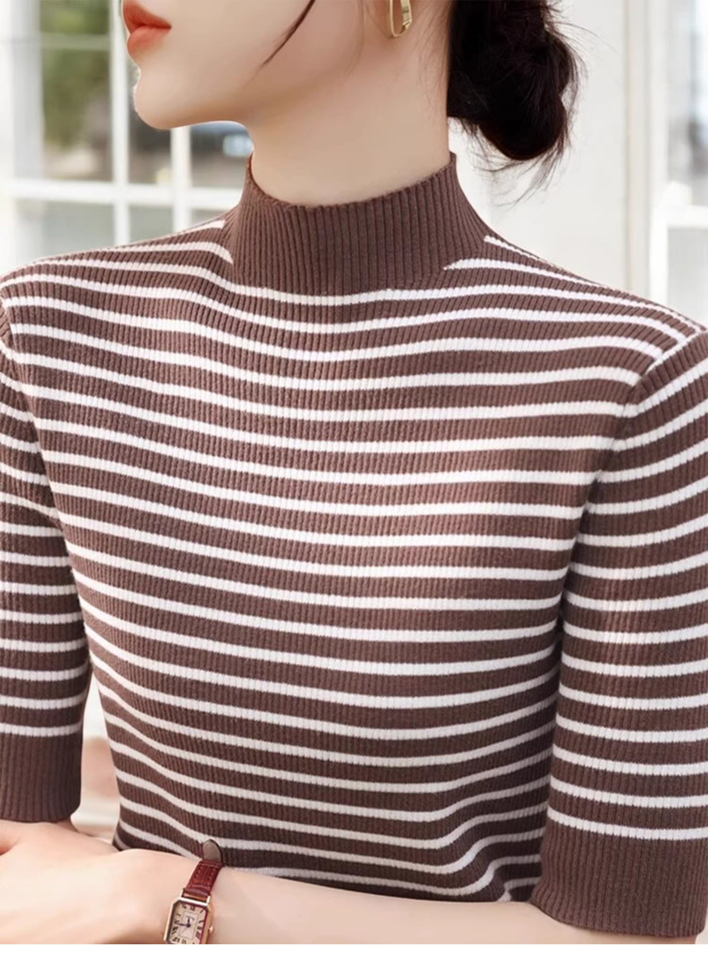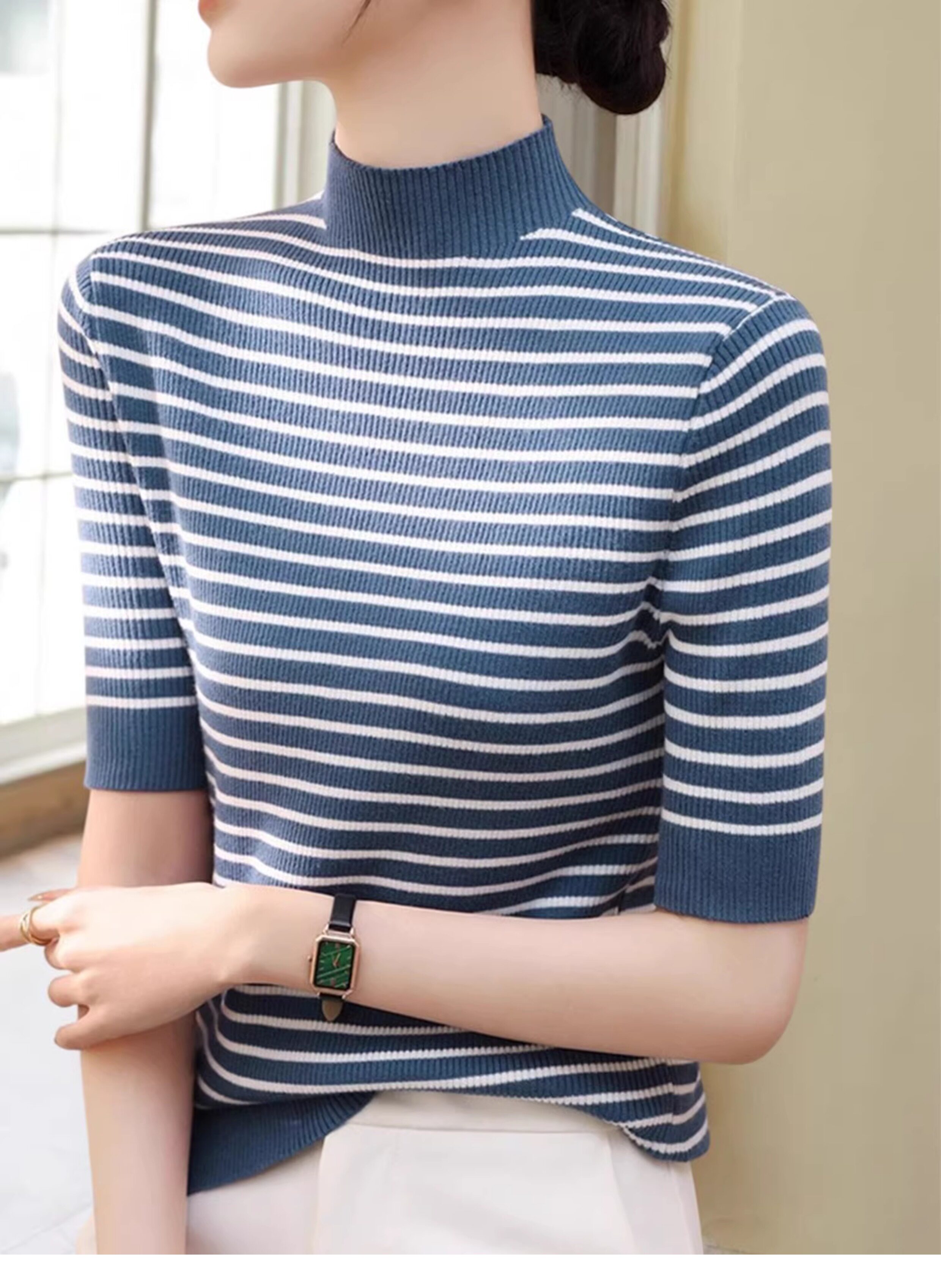 Basic House/百家好黑白條紋五分袖針織衫女春夏內搭半高領打底衫
