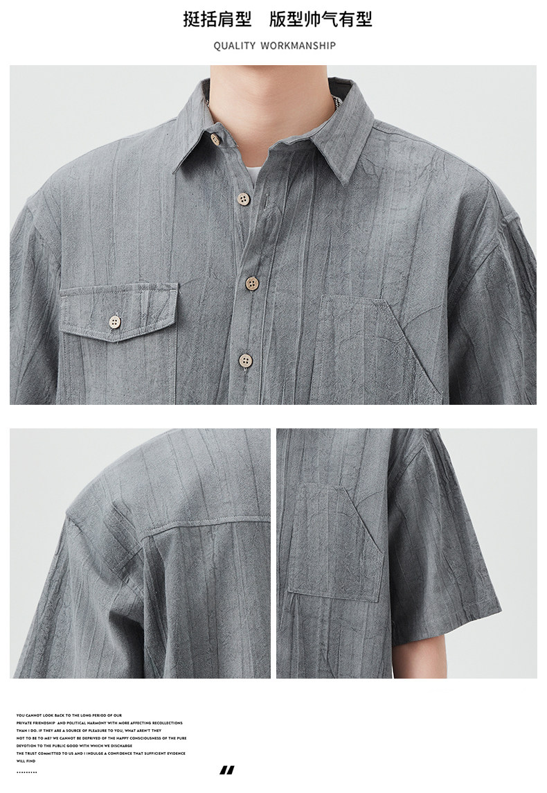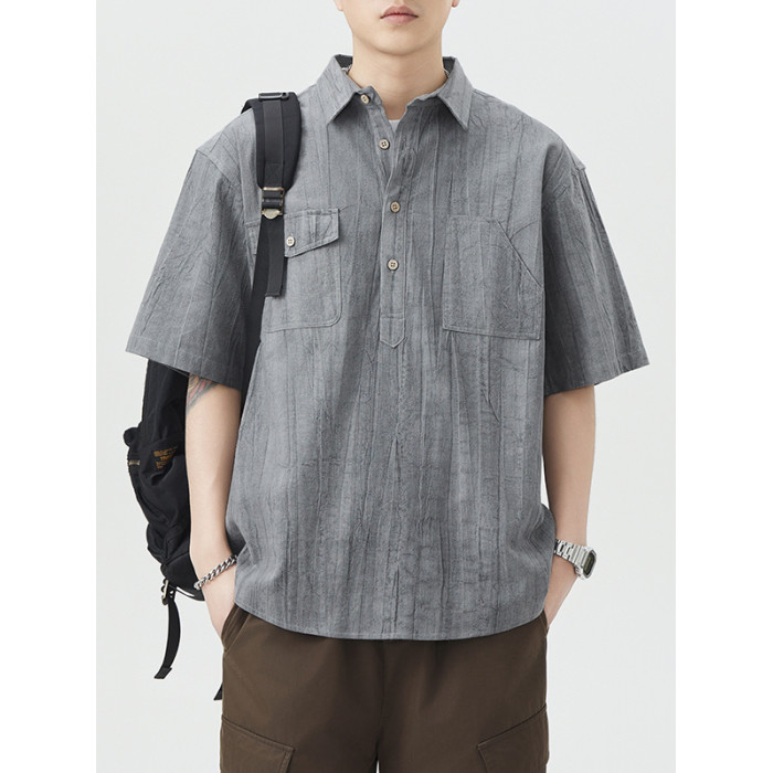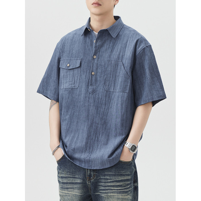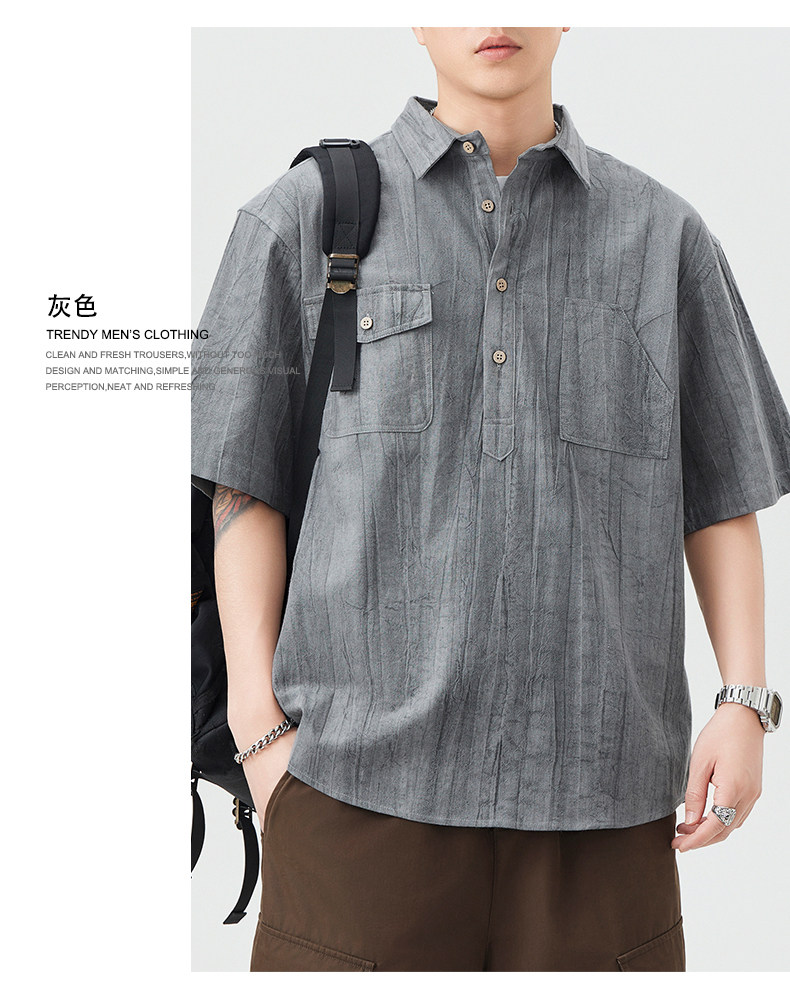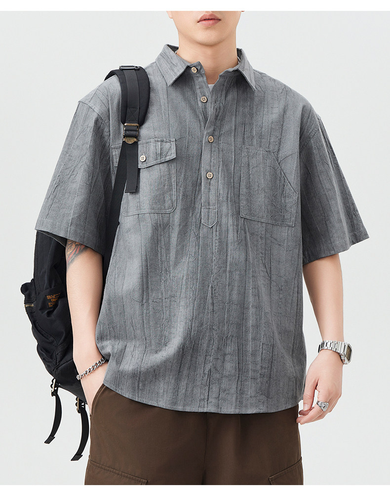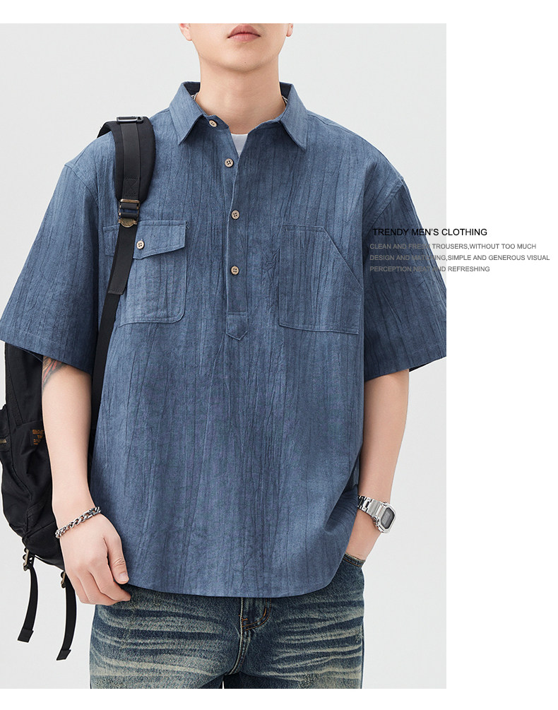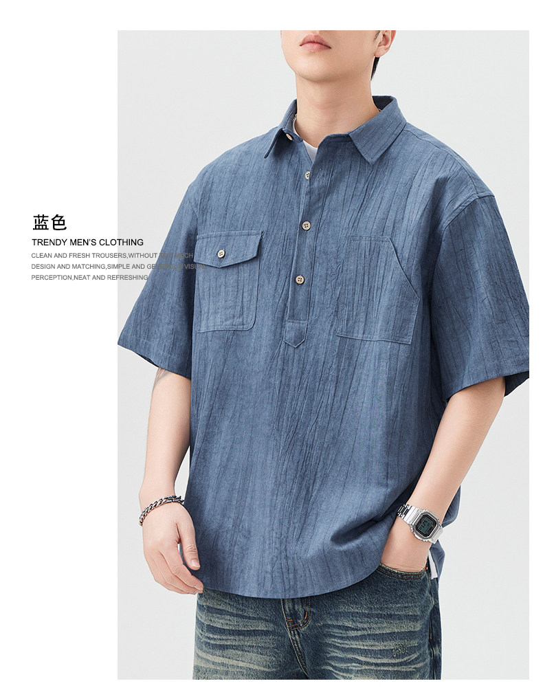 夏季棉麻復古短袖襯衫男日系薄款休閒寬鬆復古POLO領中袖襯衣美潮