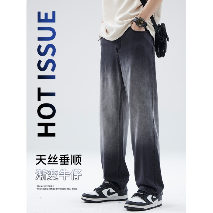 天絲牛仔褲男夏季薄款寬鬆休閒褲子男士美式高街潮流漸變直筒褲