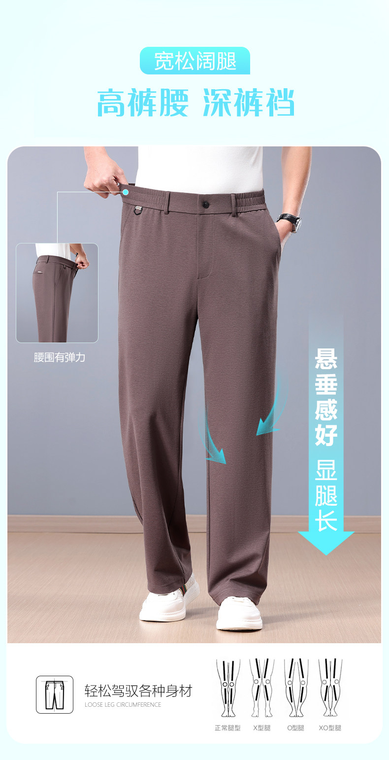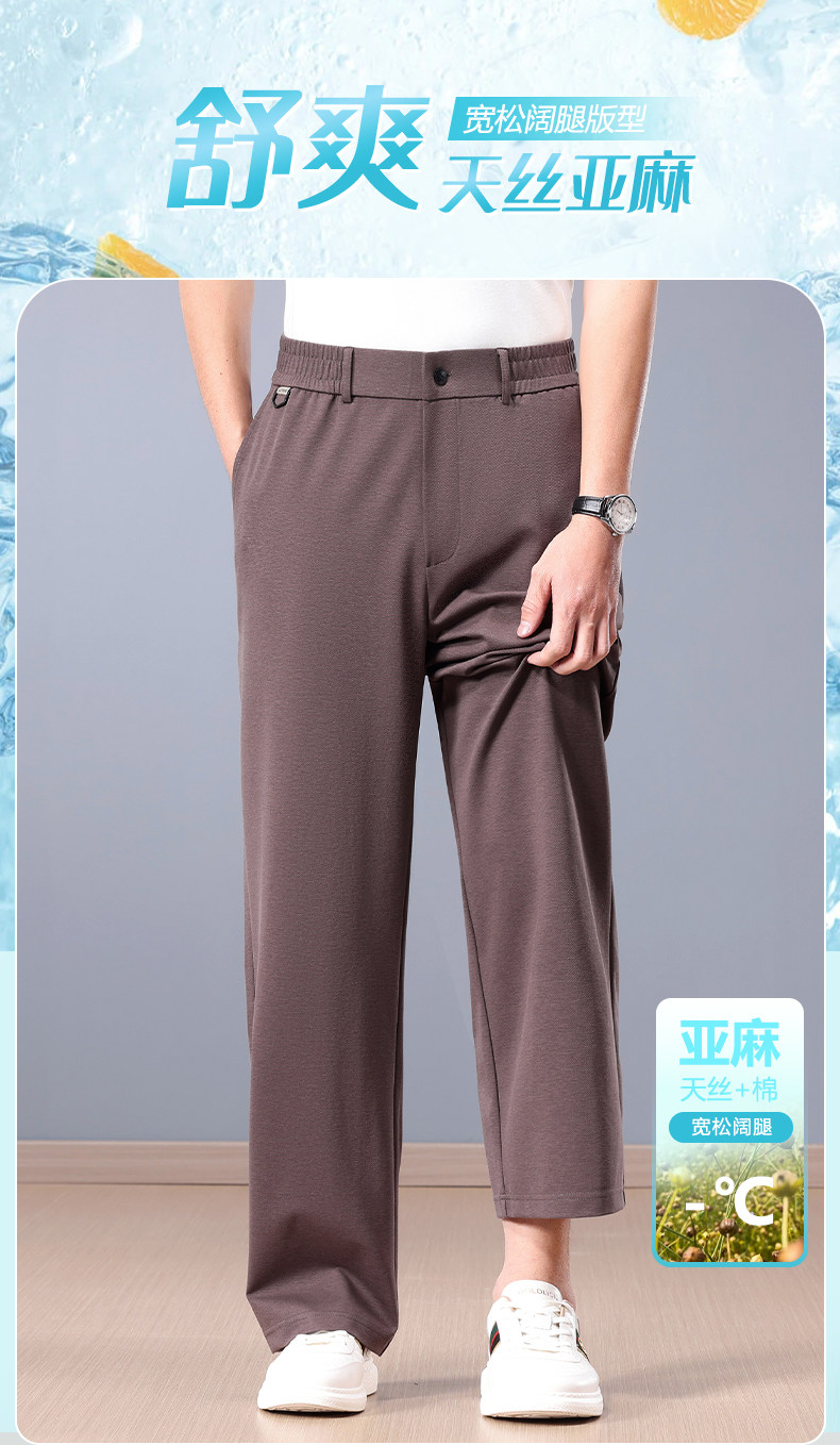 皮爾卡丹亞麻濶腿褲男士夏季薄款直筒寬鬆高腰天絲冰絲休閒長褲子
