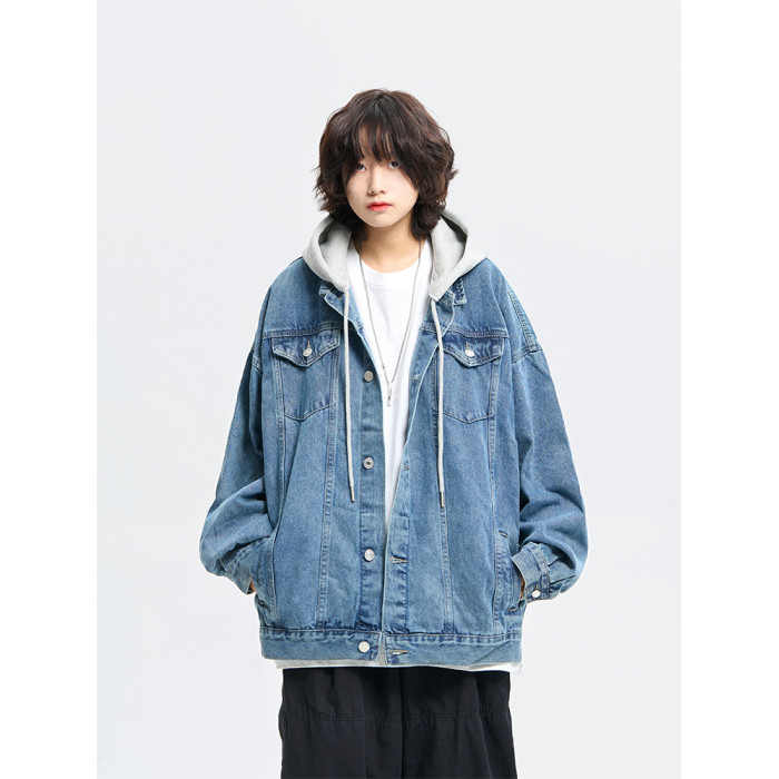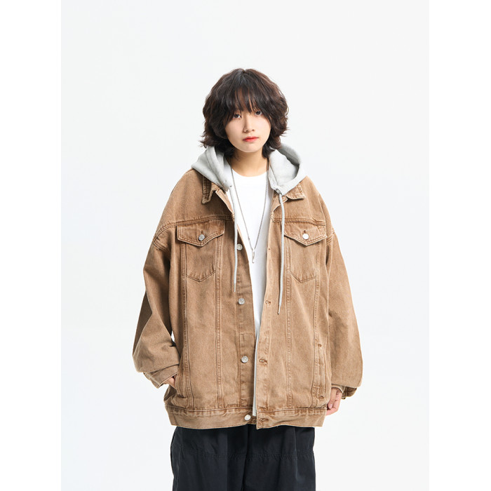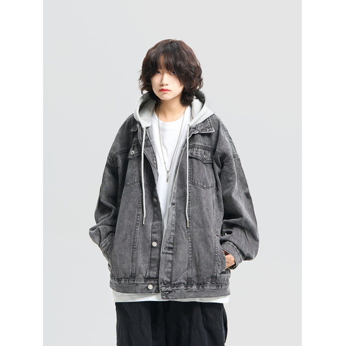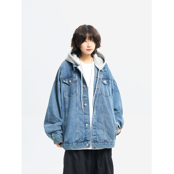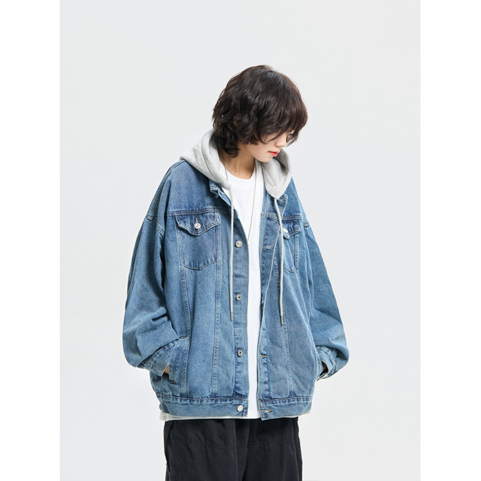 阿於呆秋冬日系假兩件水洗連帽牛仔外套男寬松休閒情侶工裝夾克女