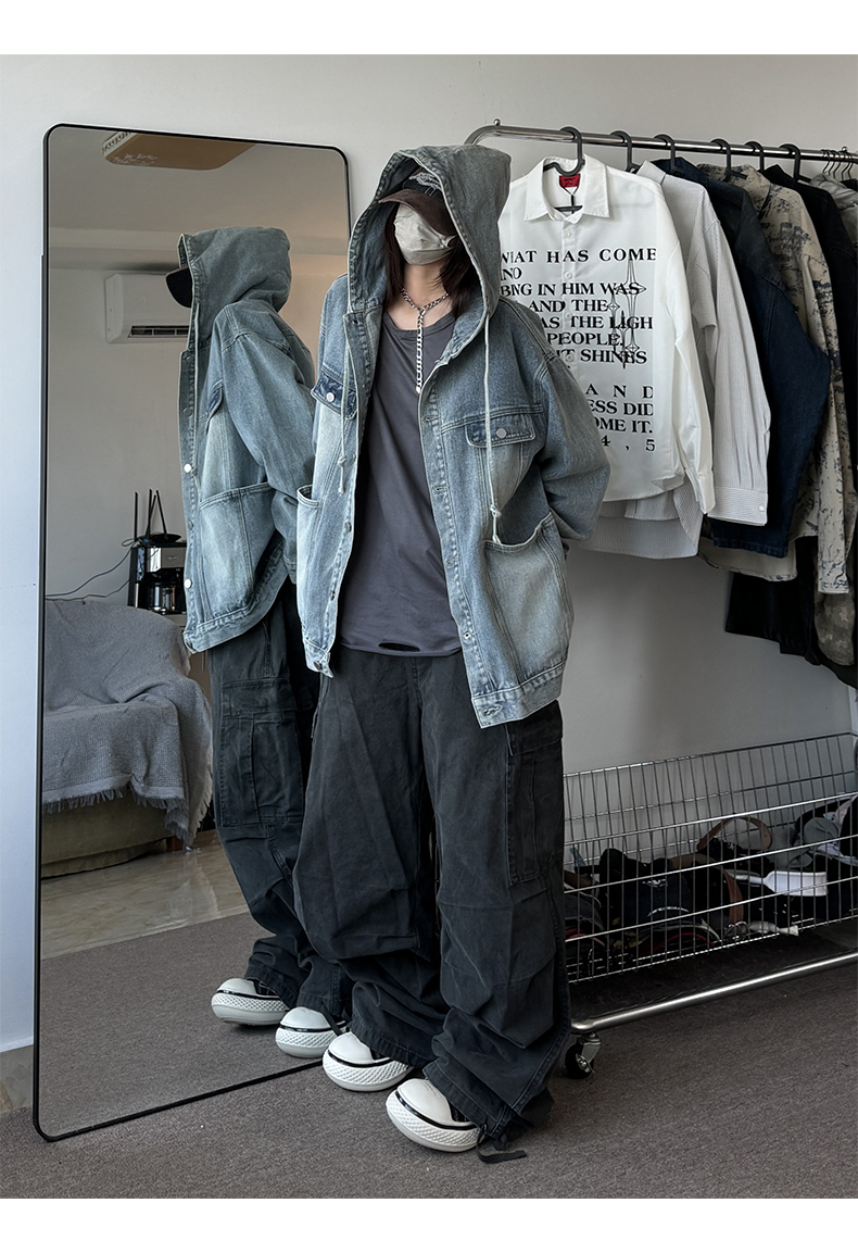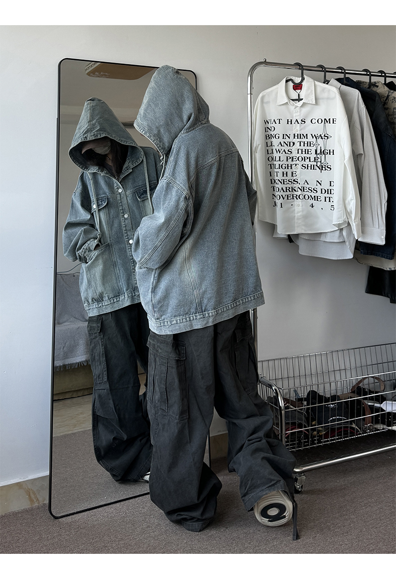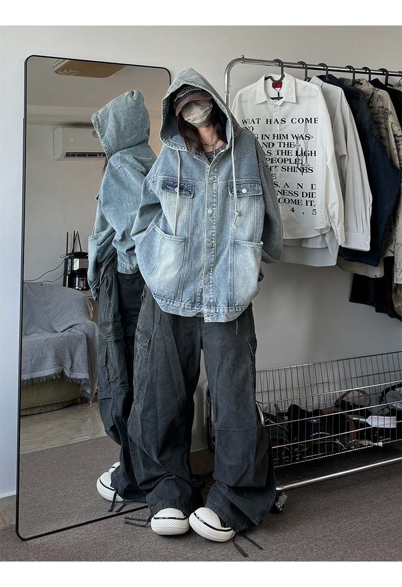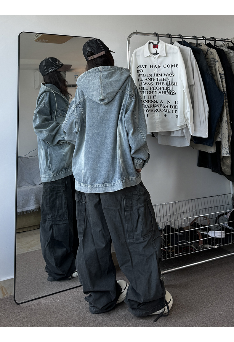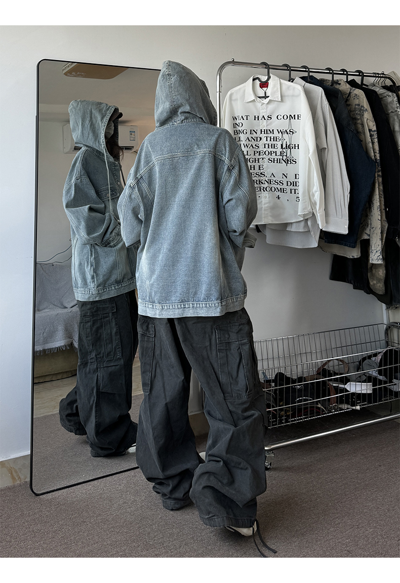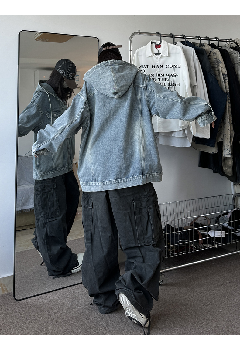 美式vintage牛仔外套男寬松連帽工裝上衣春秋季潮牌水洗休閒夾克