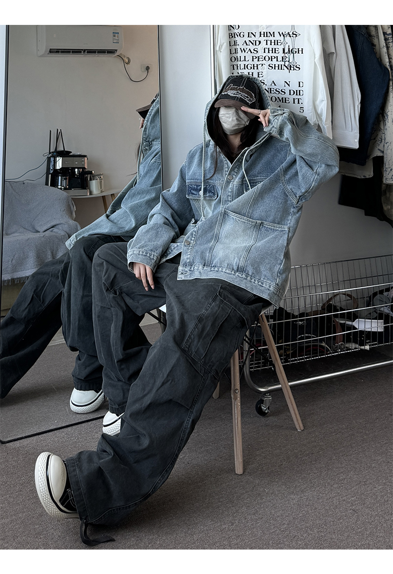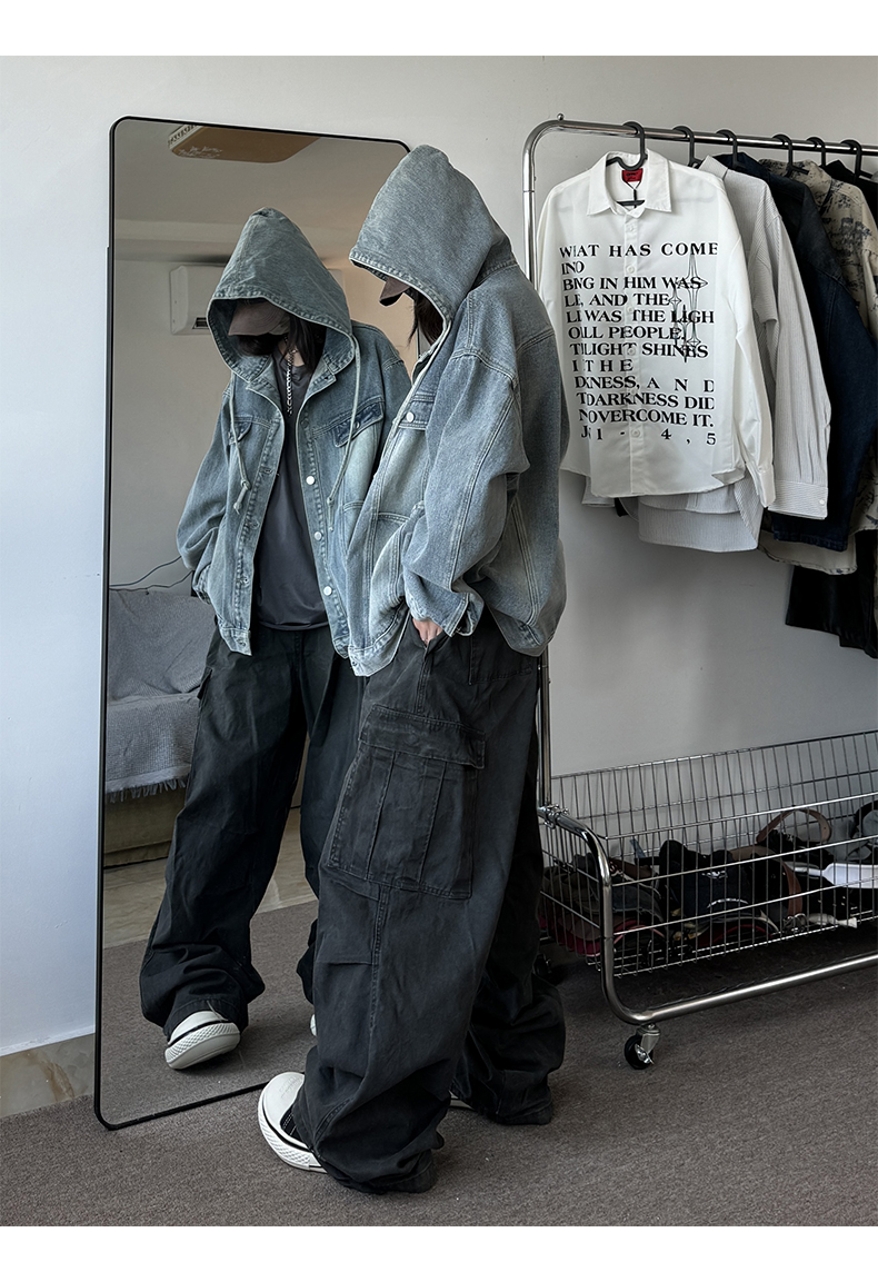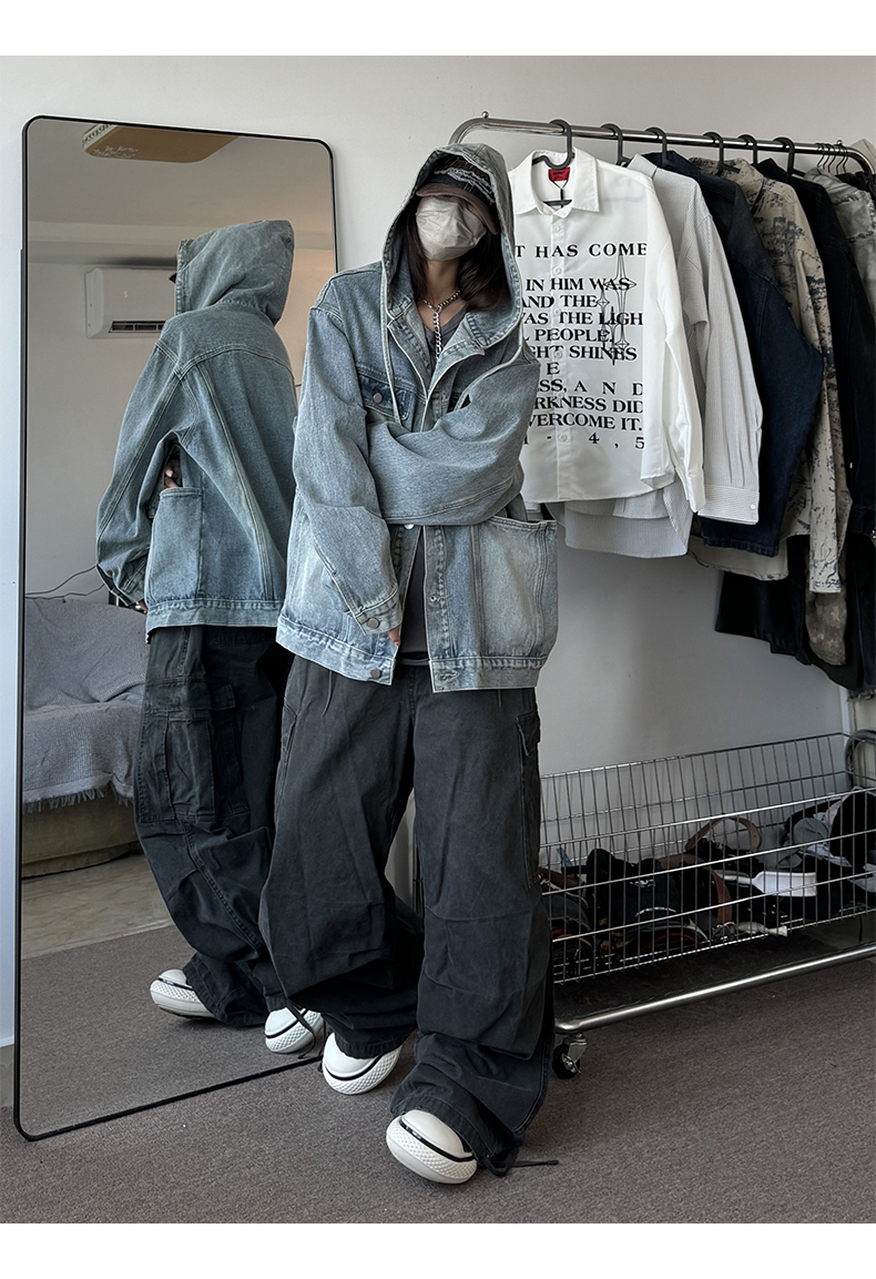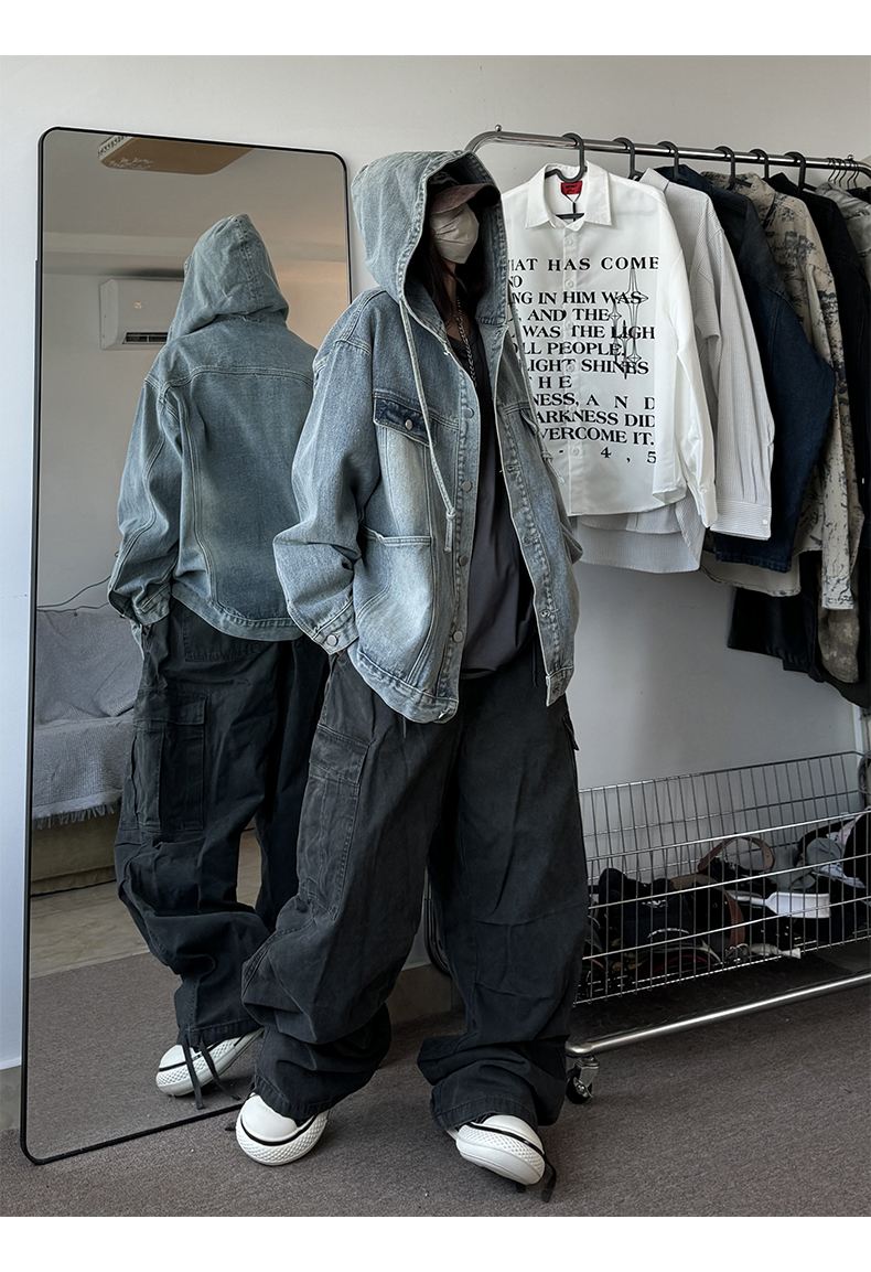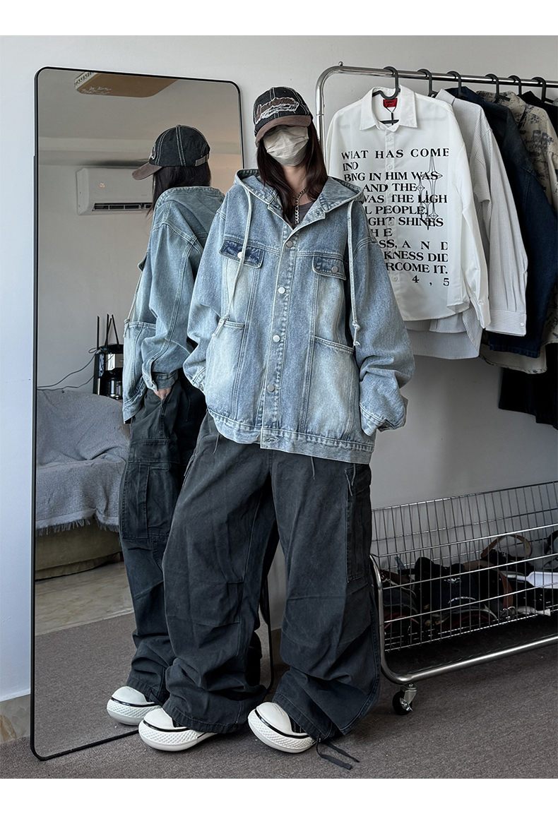 美式vintage牛仔外套男寬松連帽工裝上衣春秋季潮牌水洗休閒夾克