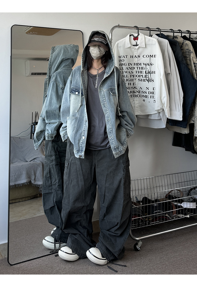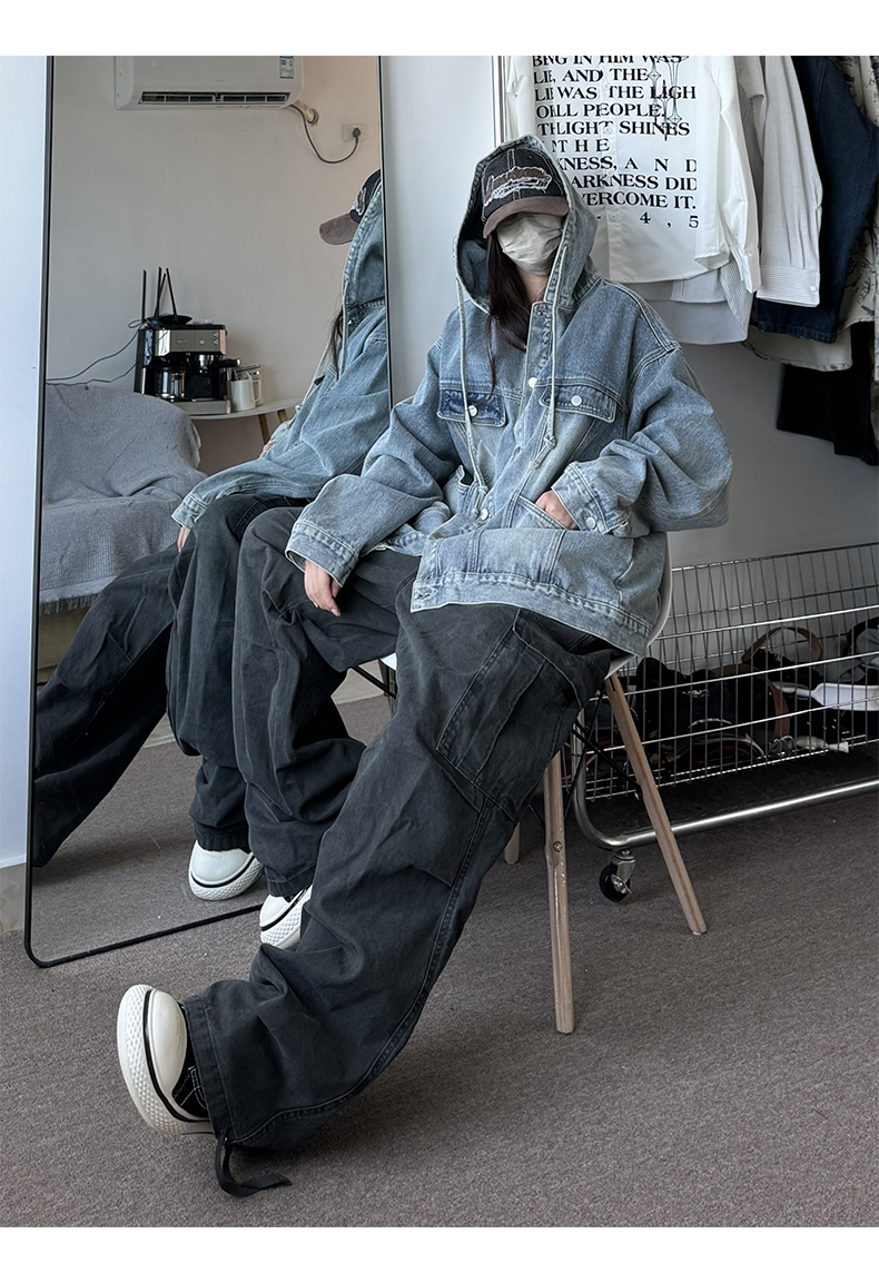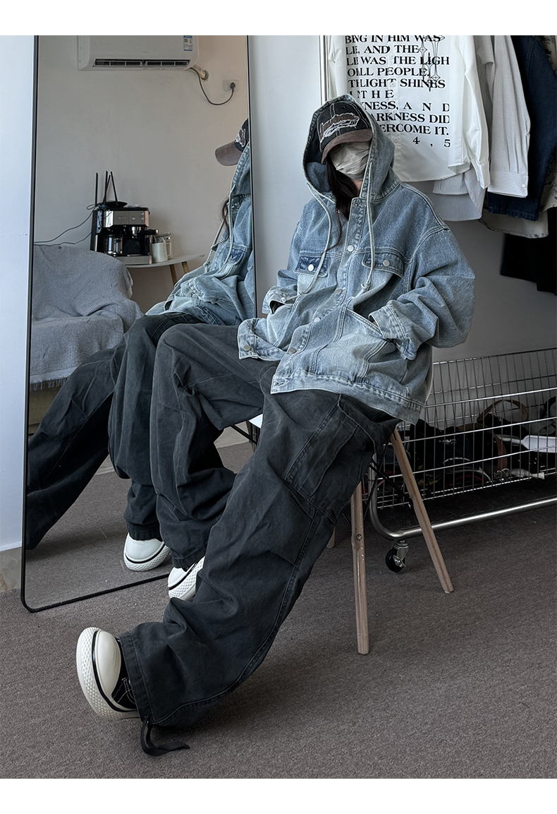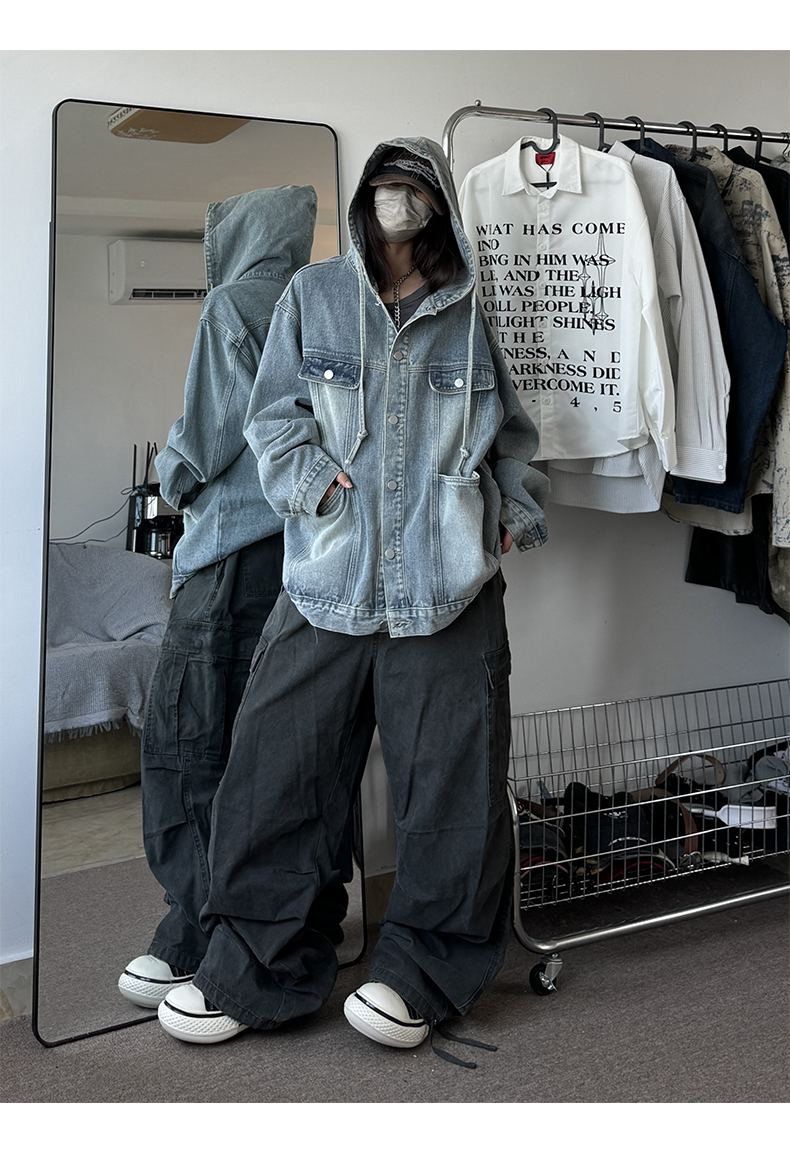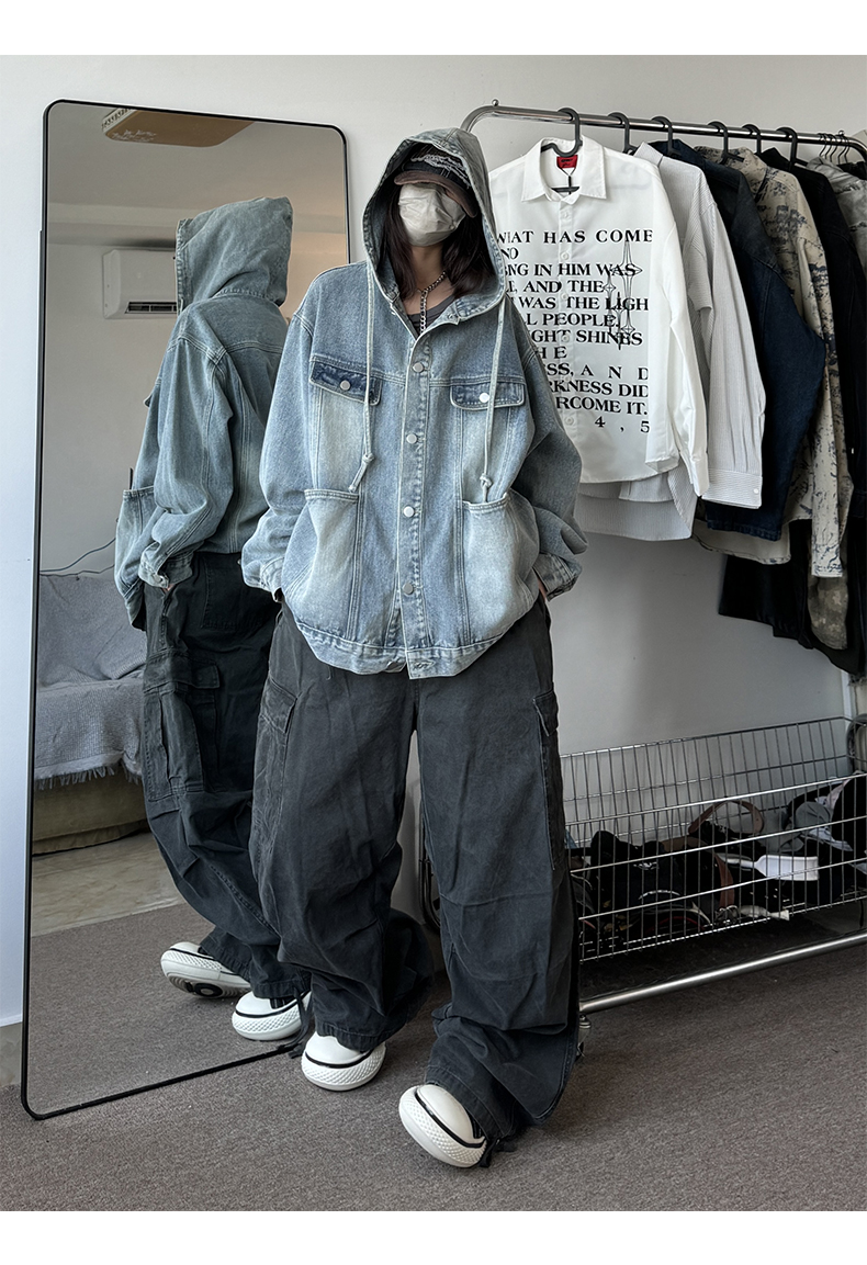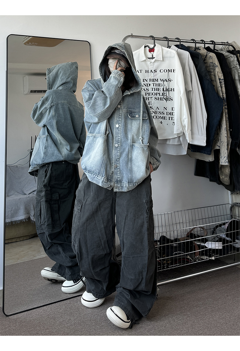 美式vintage牛仔外套男寬松連帽工裝上衣春秋季潮牌水洗休閒夾克
