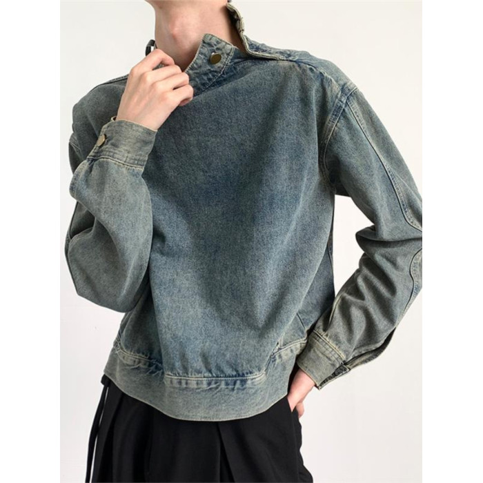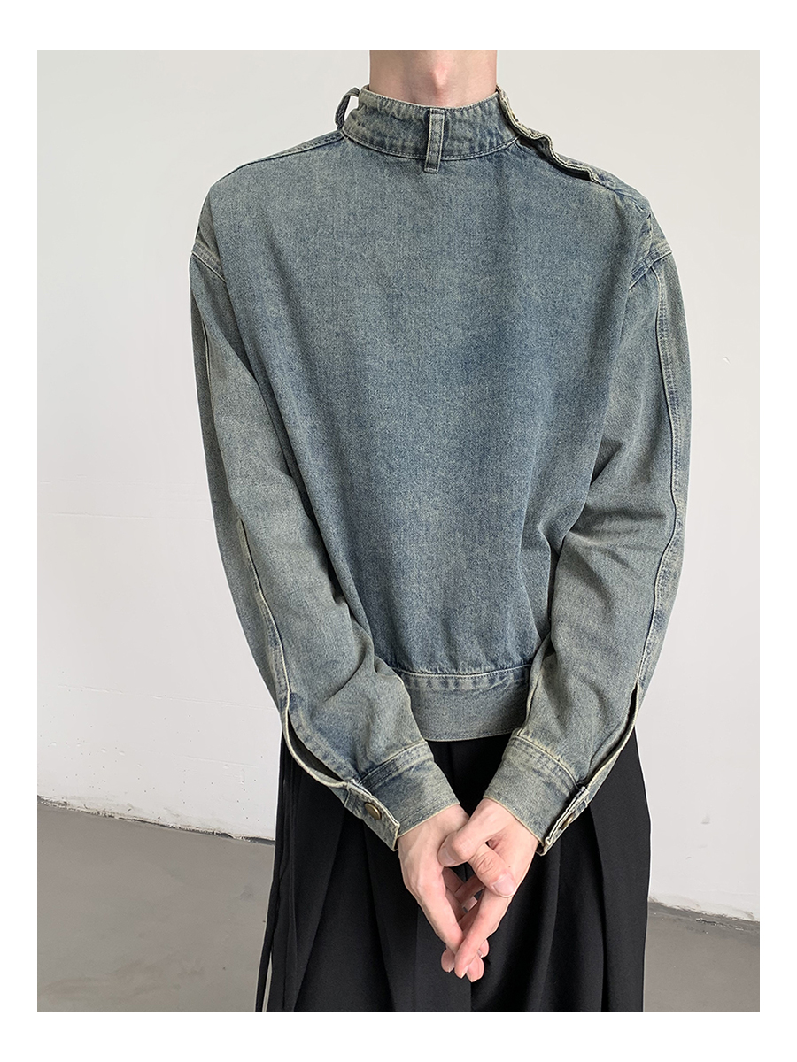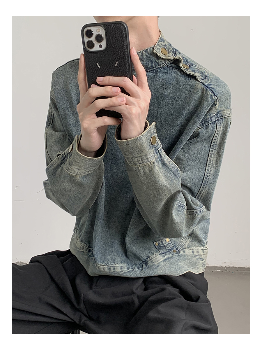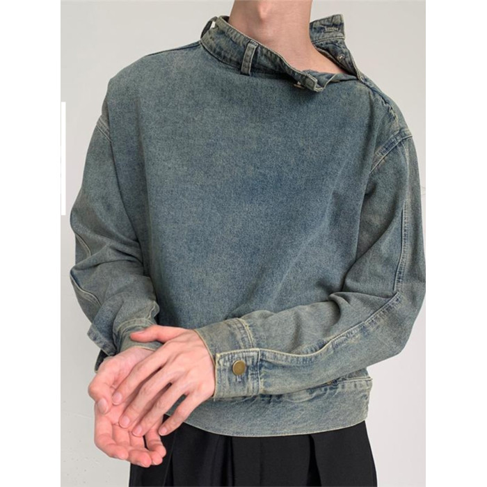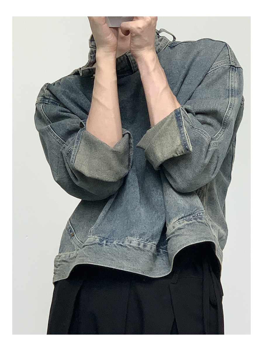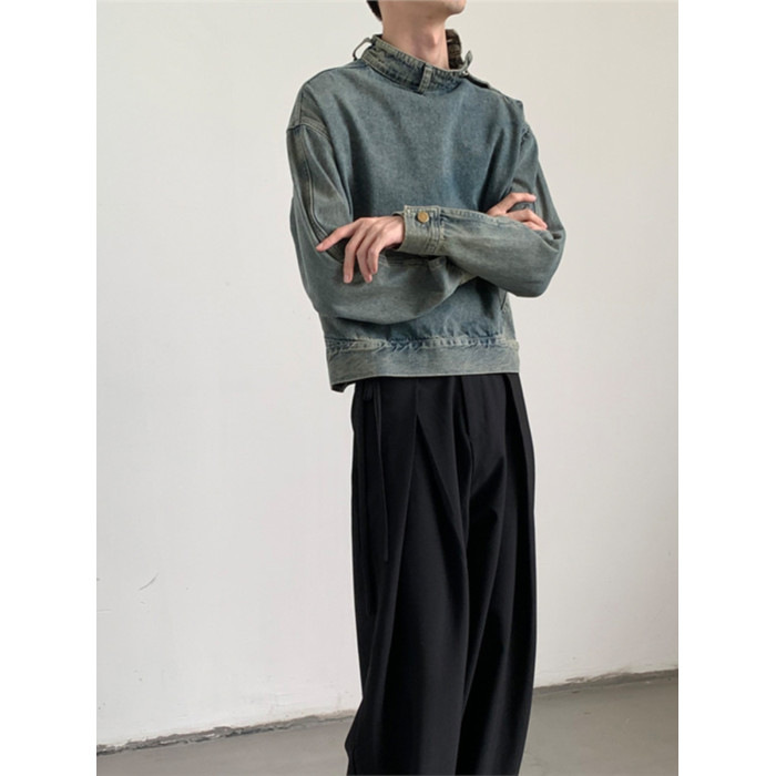 秋季新款韓版潮流休閒牛仔衛衣男寬松個性立領設計感套頭工裝夾克