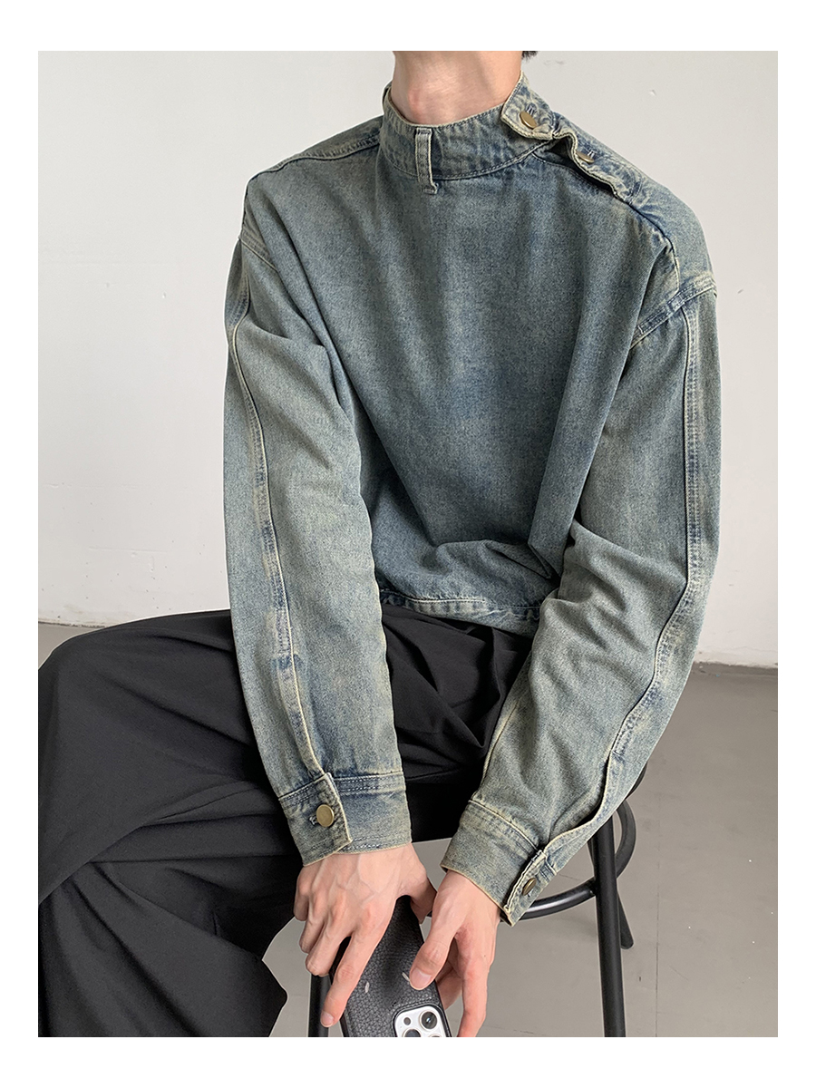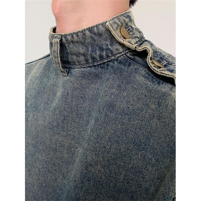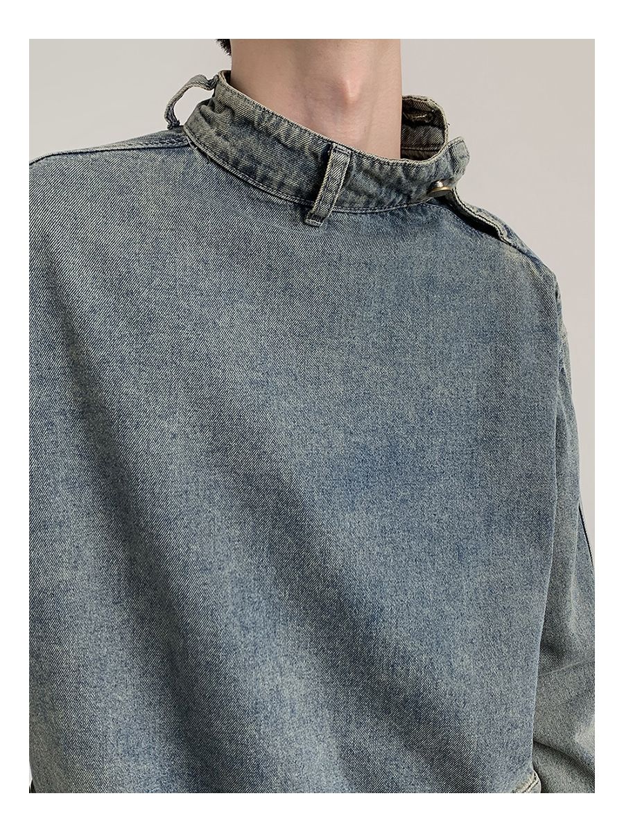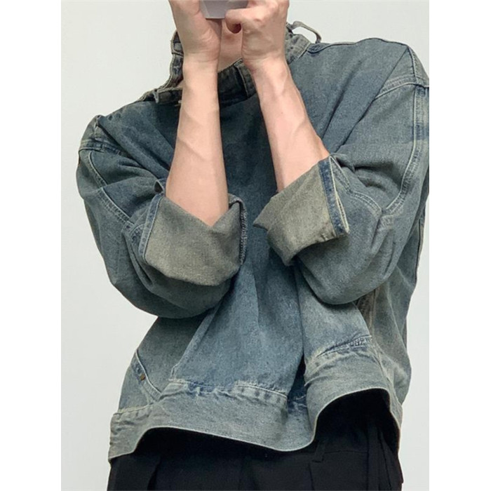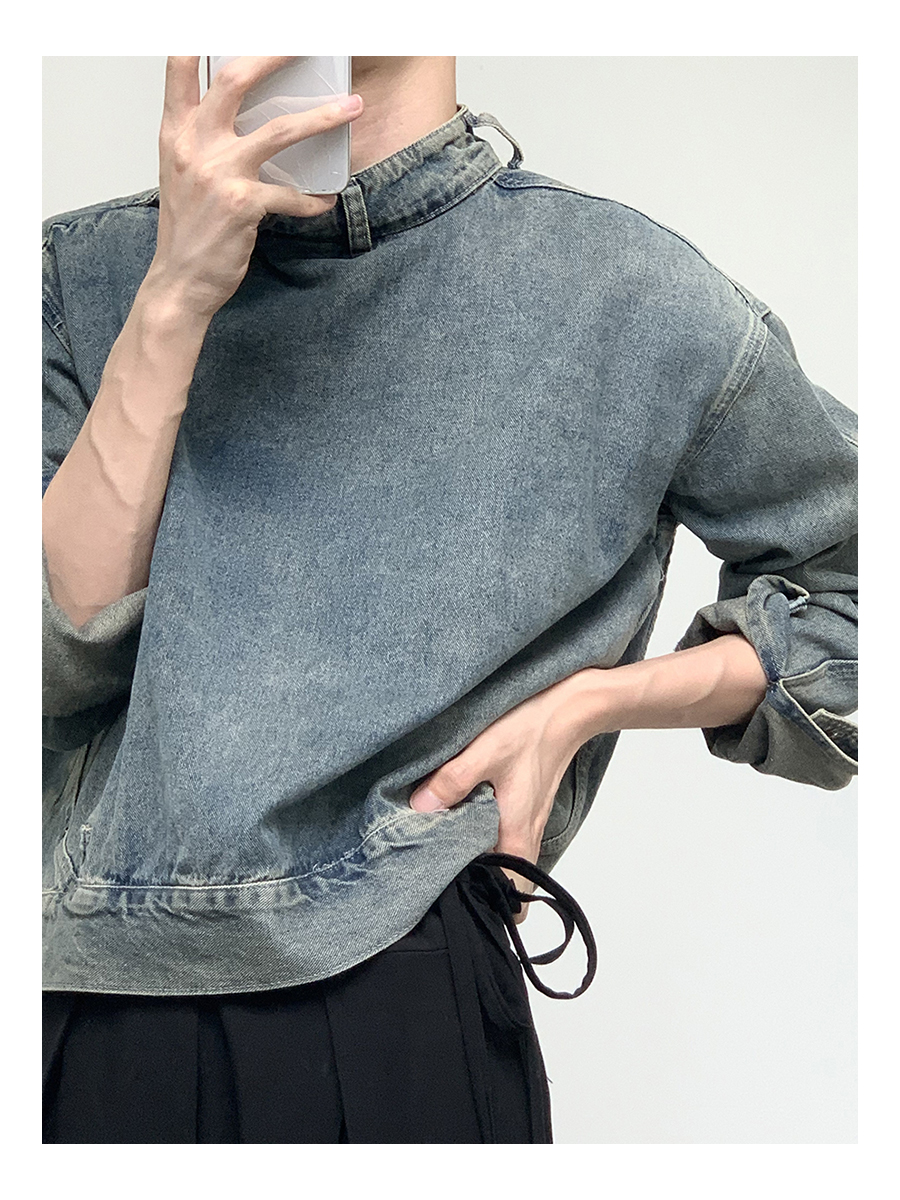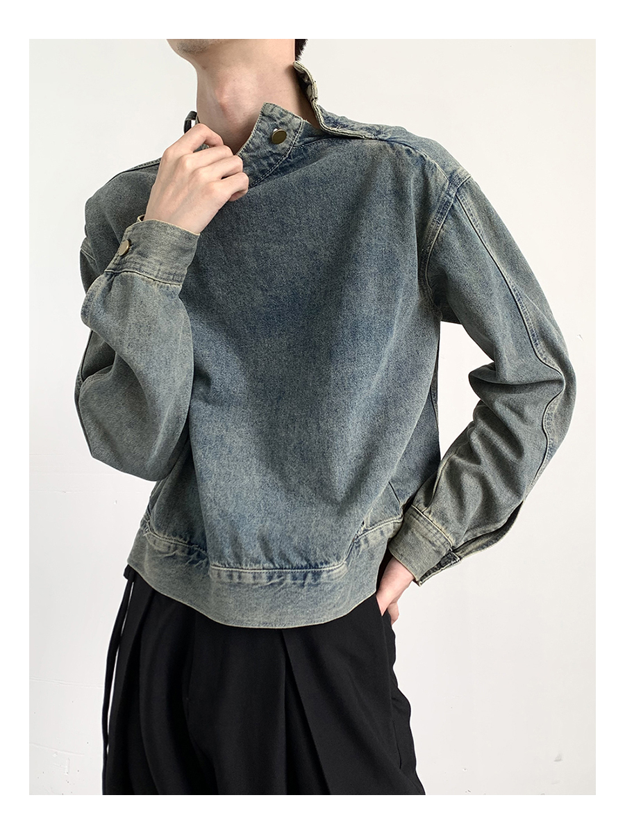 秋季新款韓版潮流休閒牛仔衛衣男寬松個性立領設計感套頭工裝夾克
