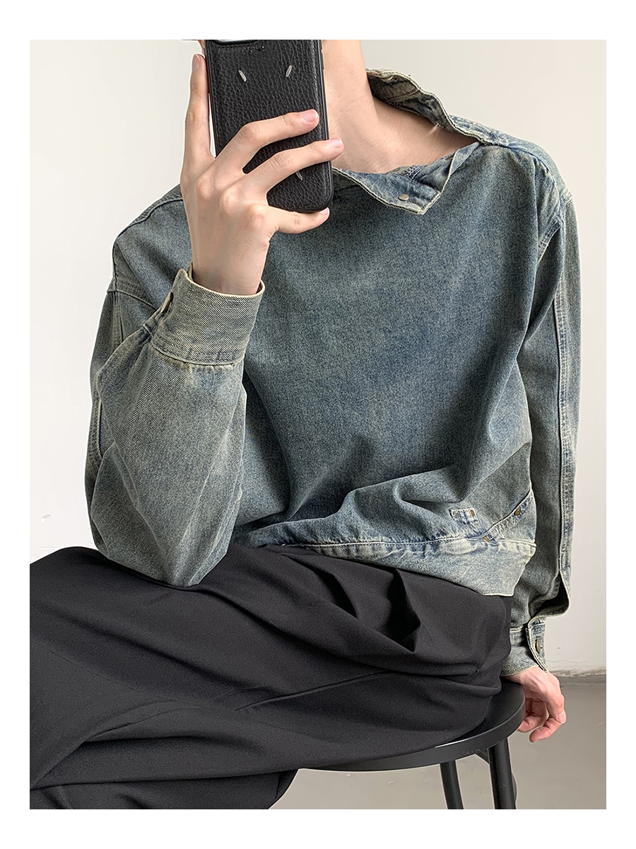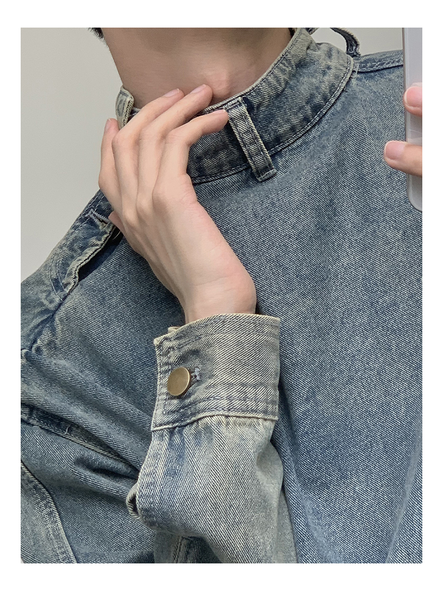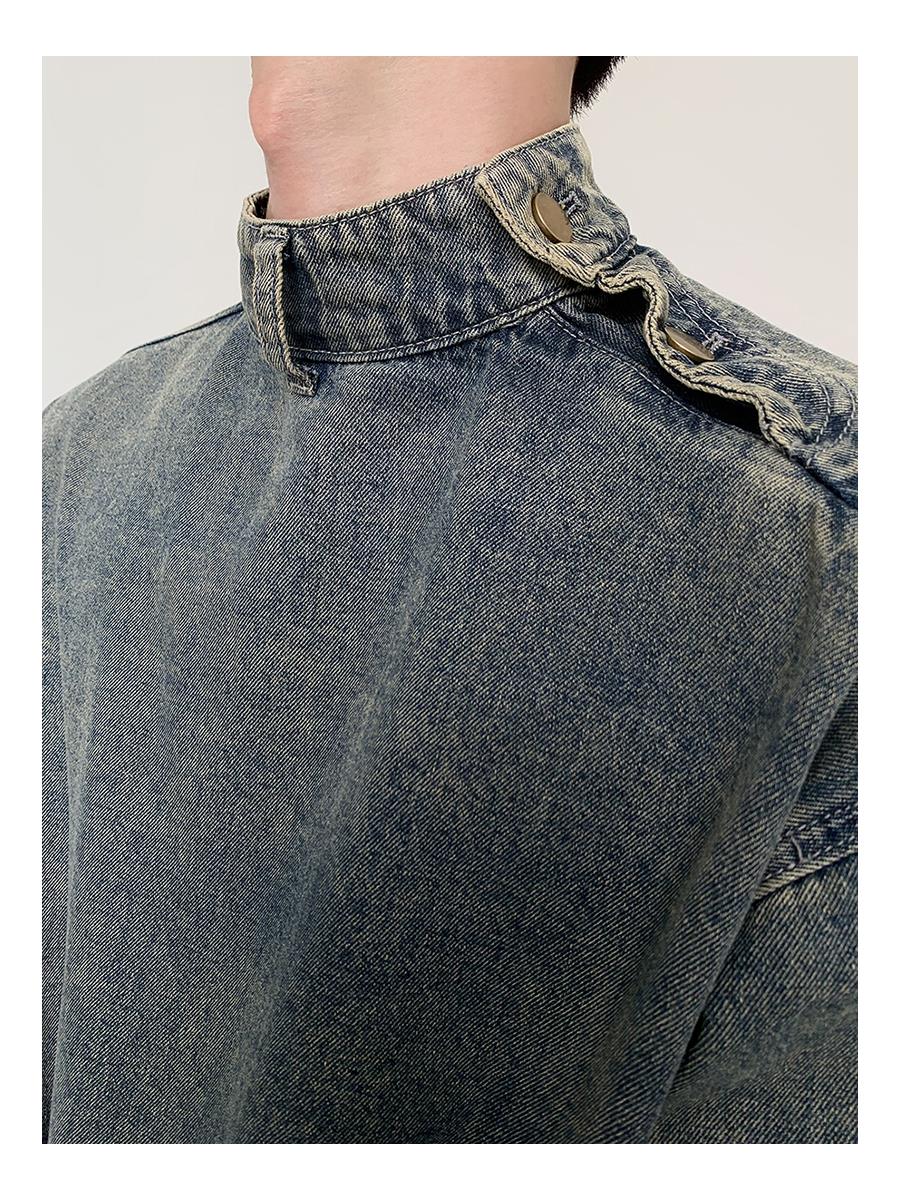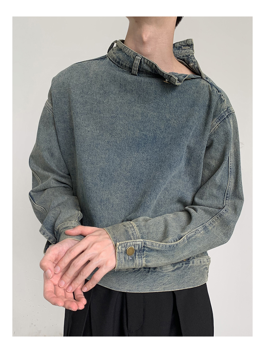 秋季新款韓版潮流休閒牛仔衛衣男寬松個性立領設計感套頭工裝夾克