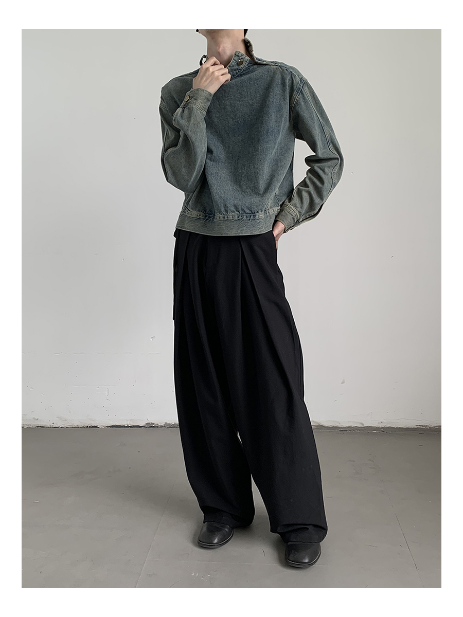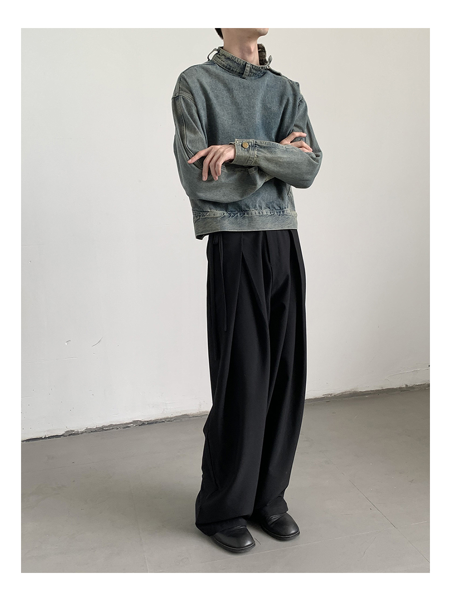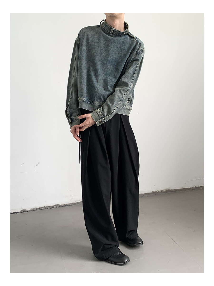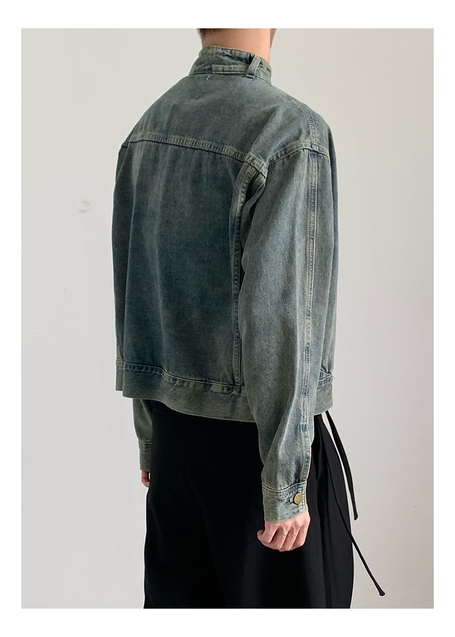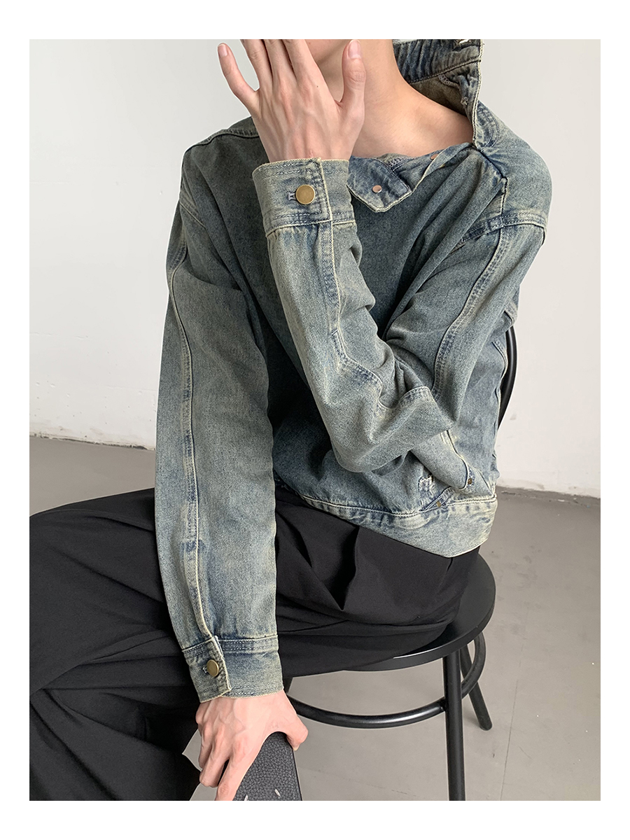 秋季新款韓版潮流休閒牛仔衛衣男寬松個性立領設計感套頭工裝夾克