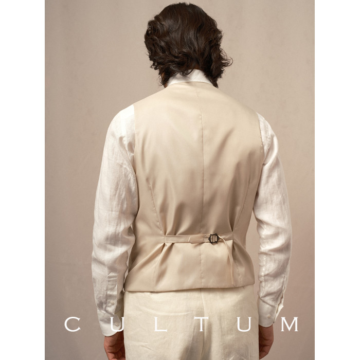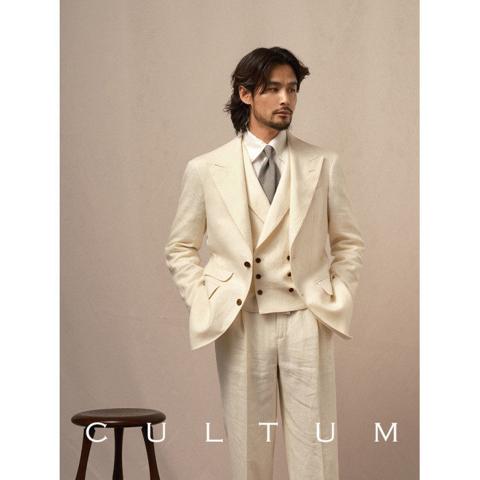 CULTUM100%法國重磅亞麻戧駁領雙排釦西裝馬甲男紳士休閒馬夾西服