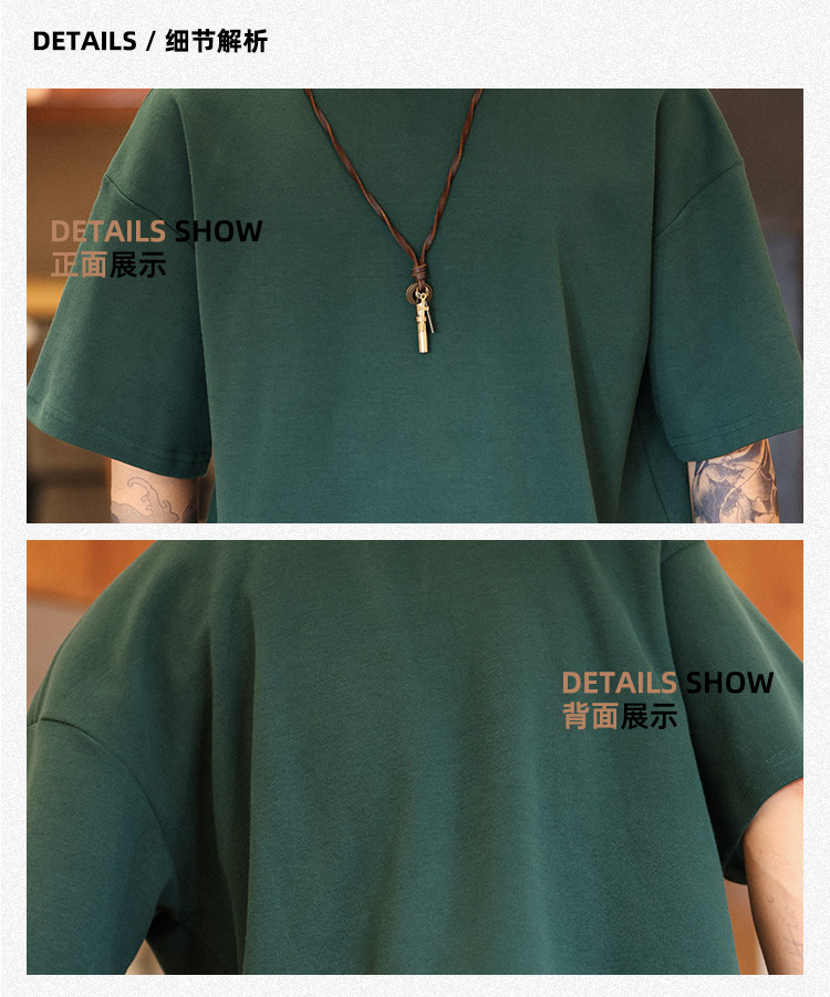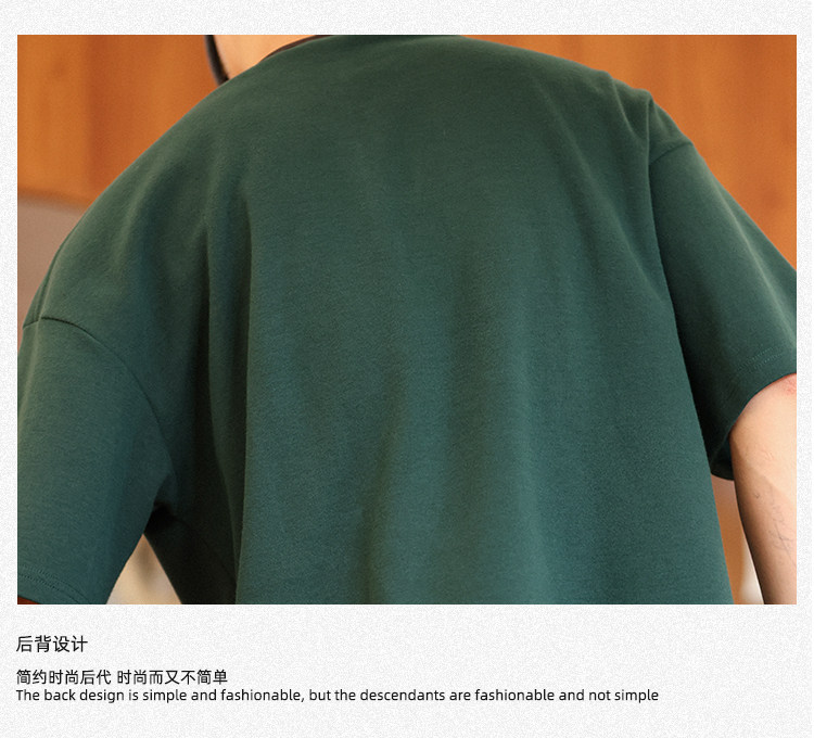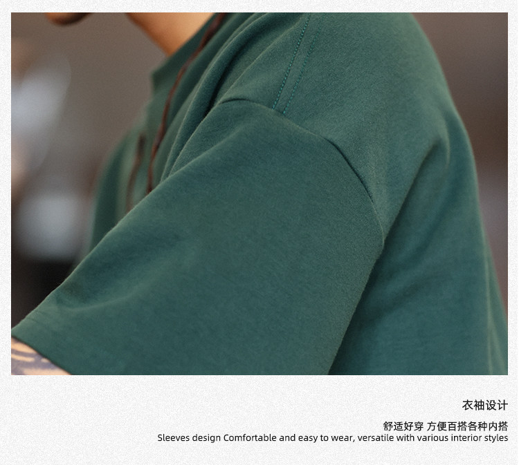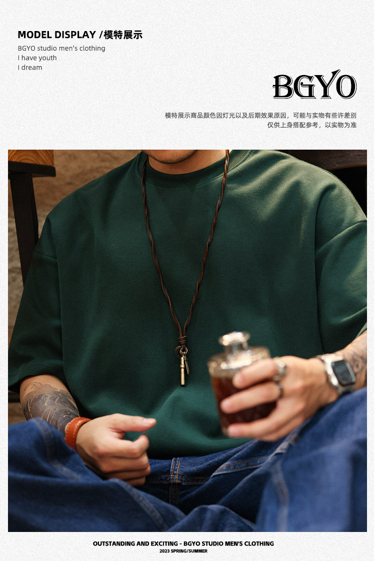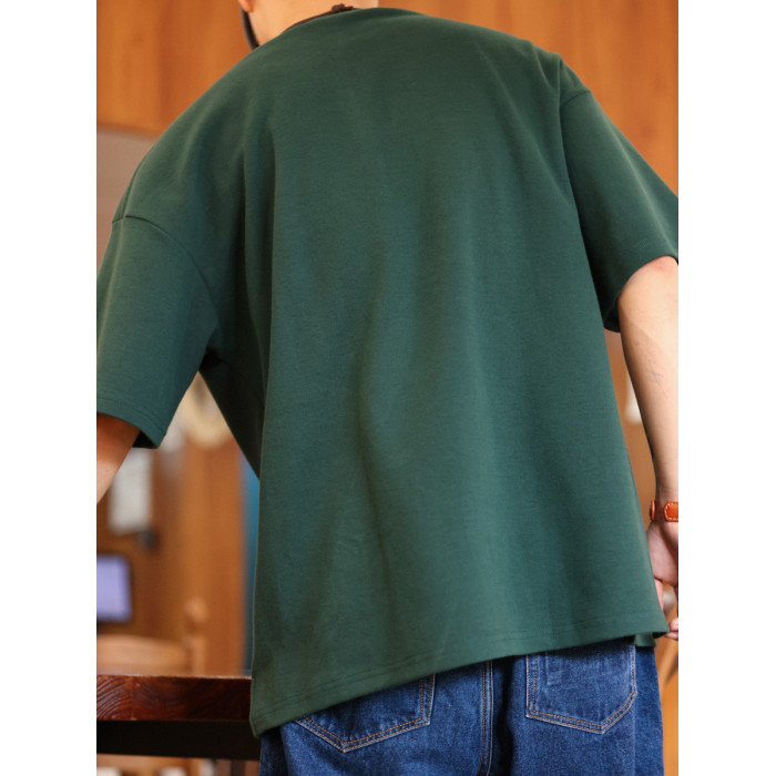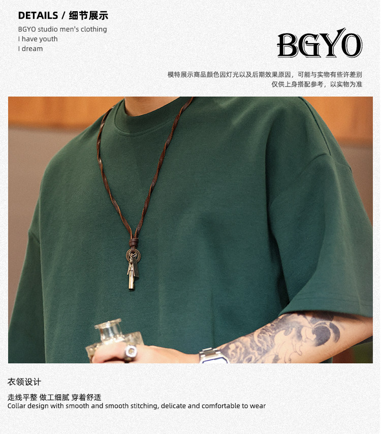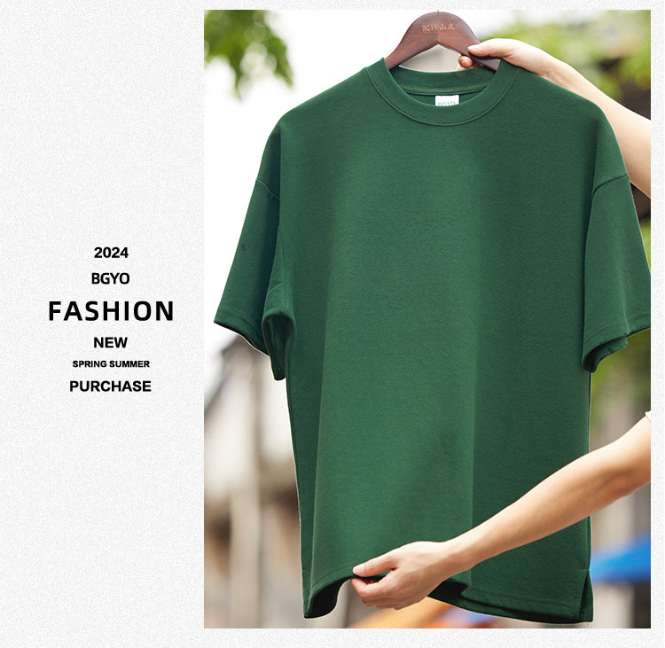 BGYO 美式重磅休閒短袖T恤男女寬松305G墨綠色圓領開叉落肩袖TEE
