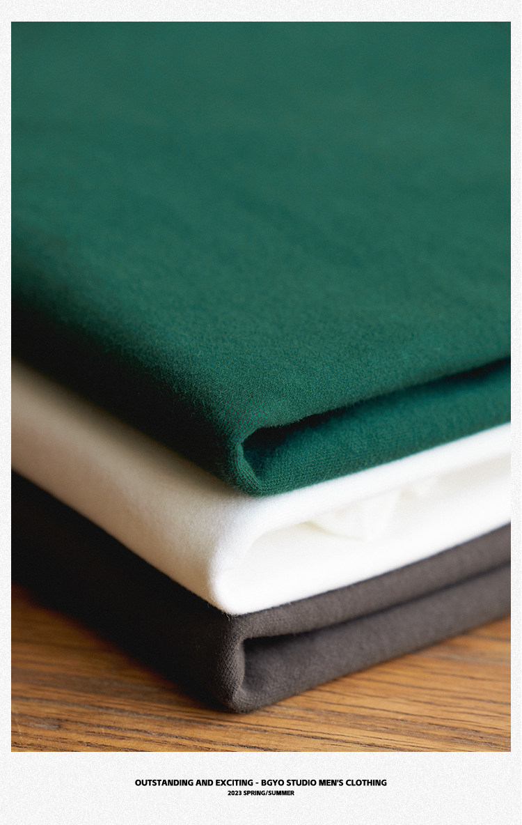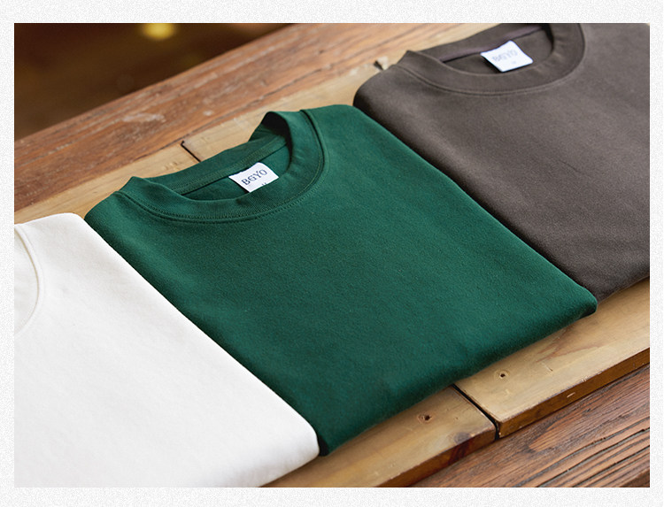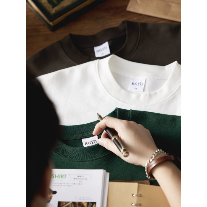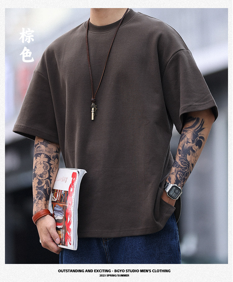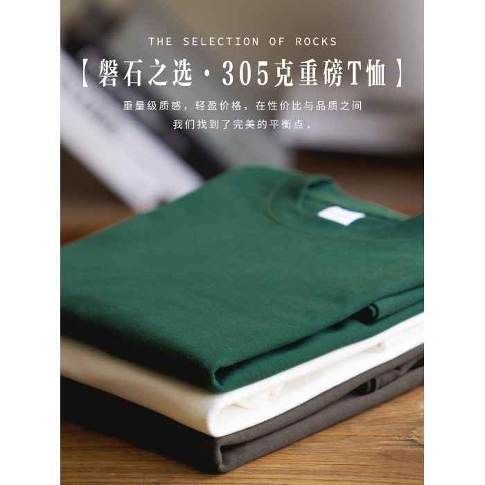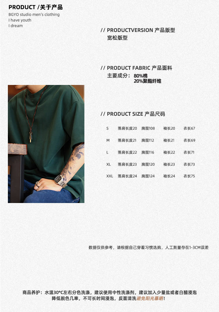 BGYO 美式重磅休閒短袖T恤男女寬松305G墨綠色圓領開叉落肩袖TEE