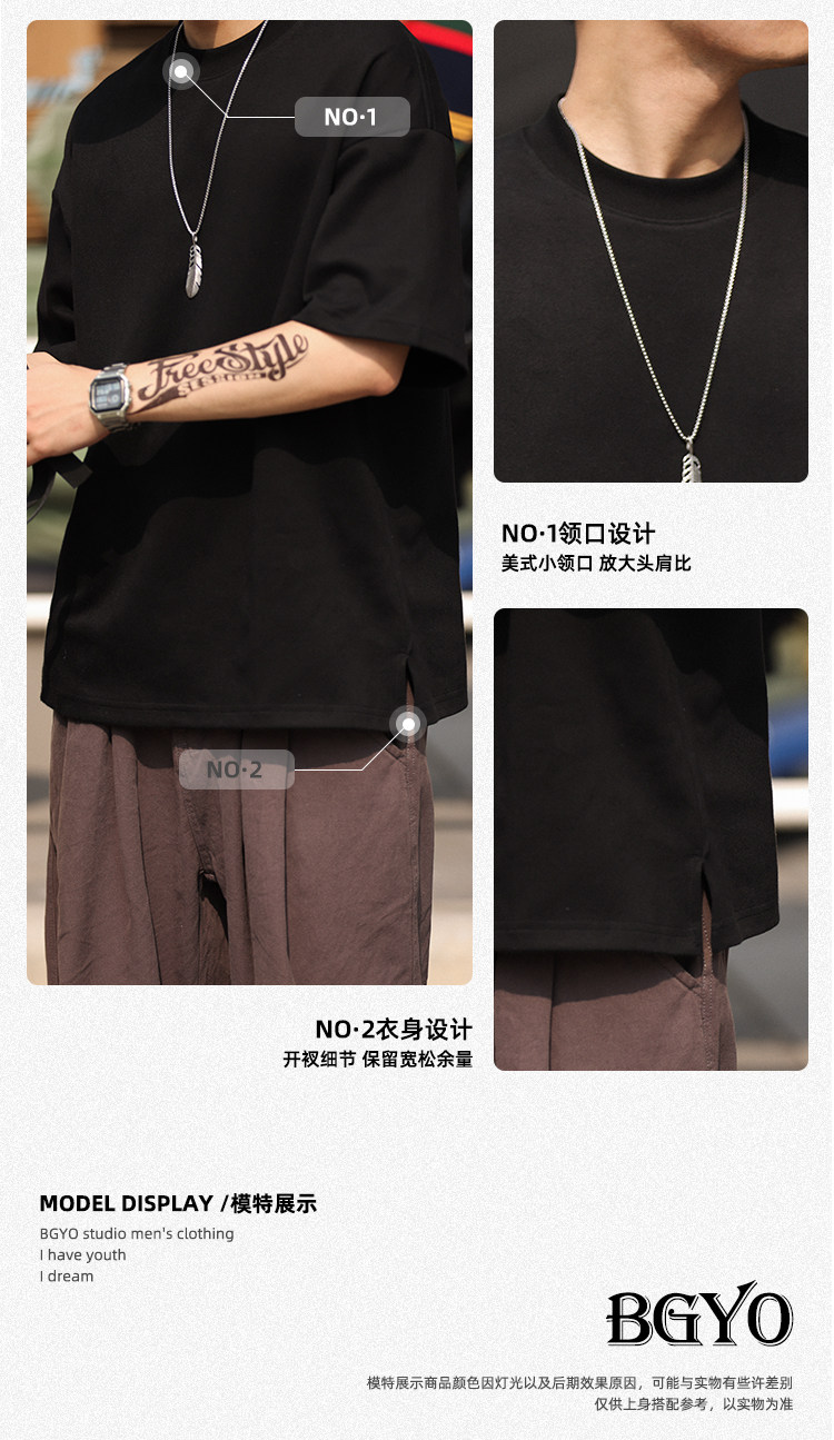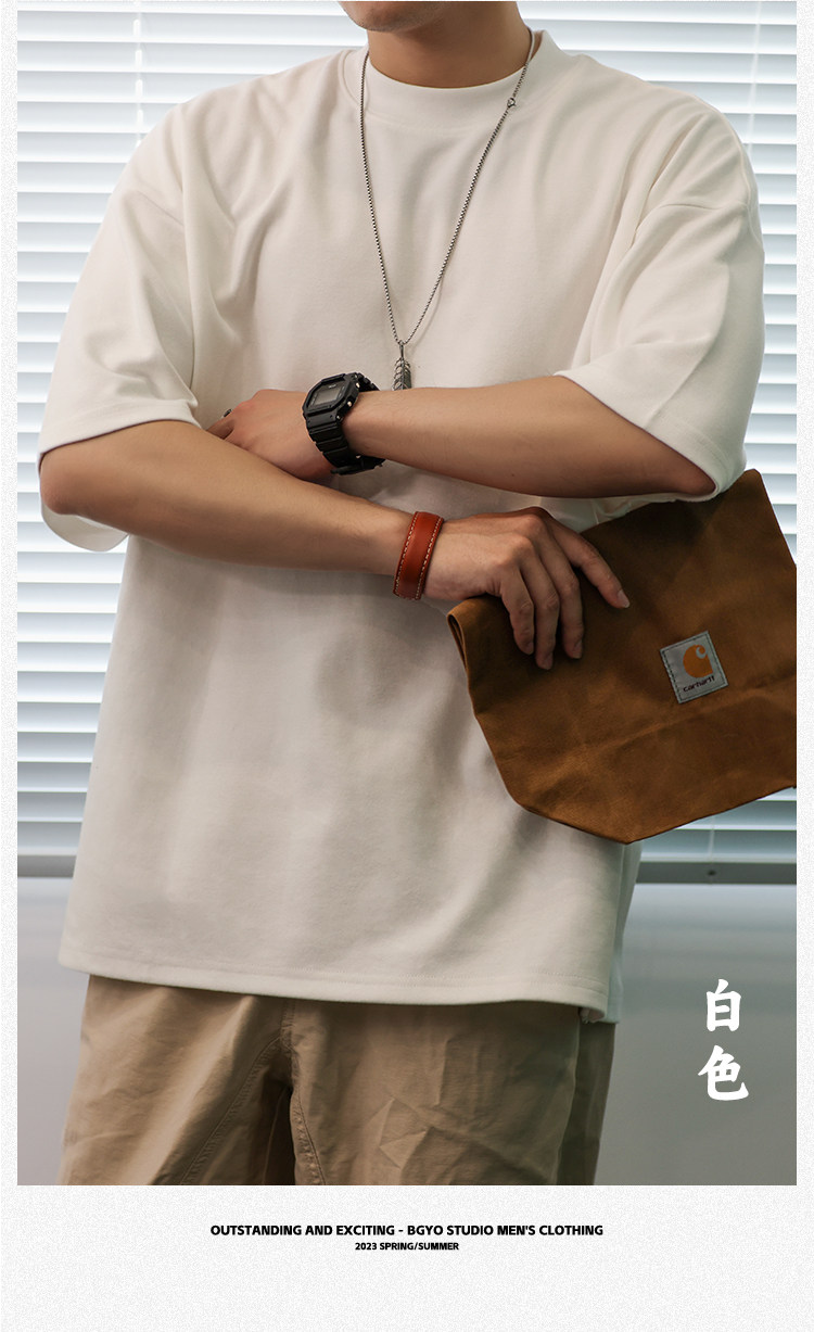BGYO 300G重磅小領口短袖T恤男寬鬆落肩袖純色日系簡約五分袖打底