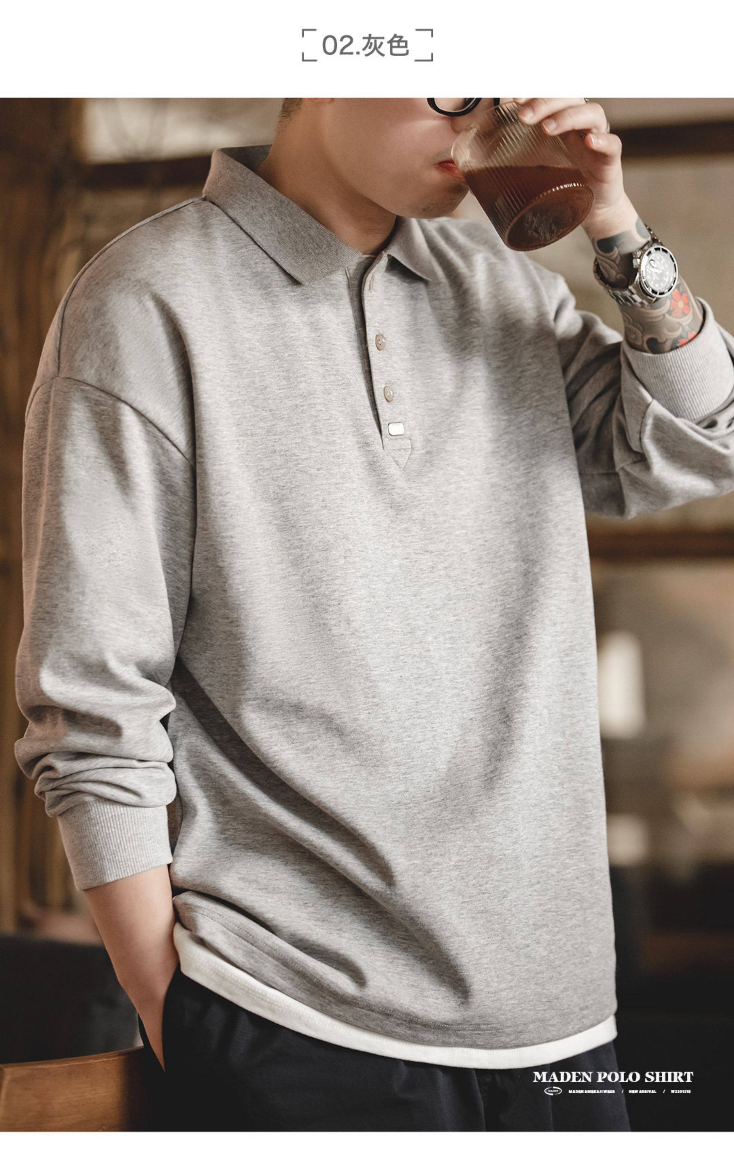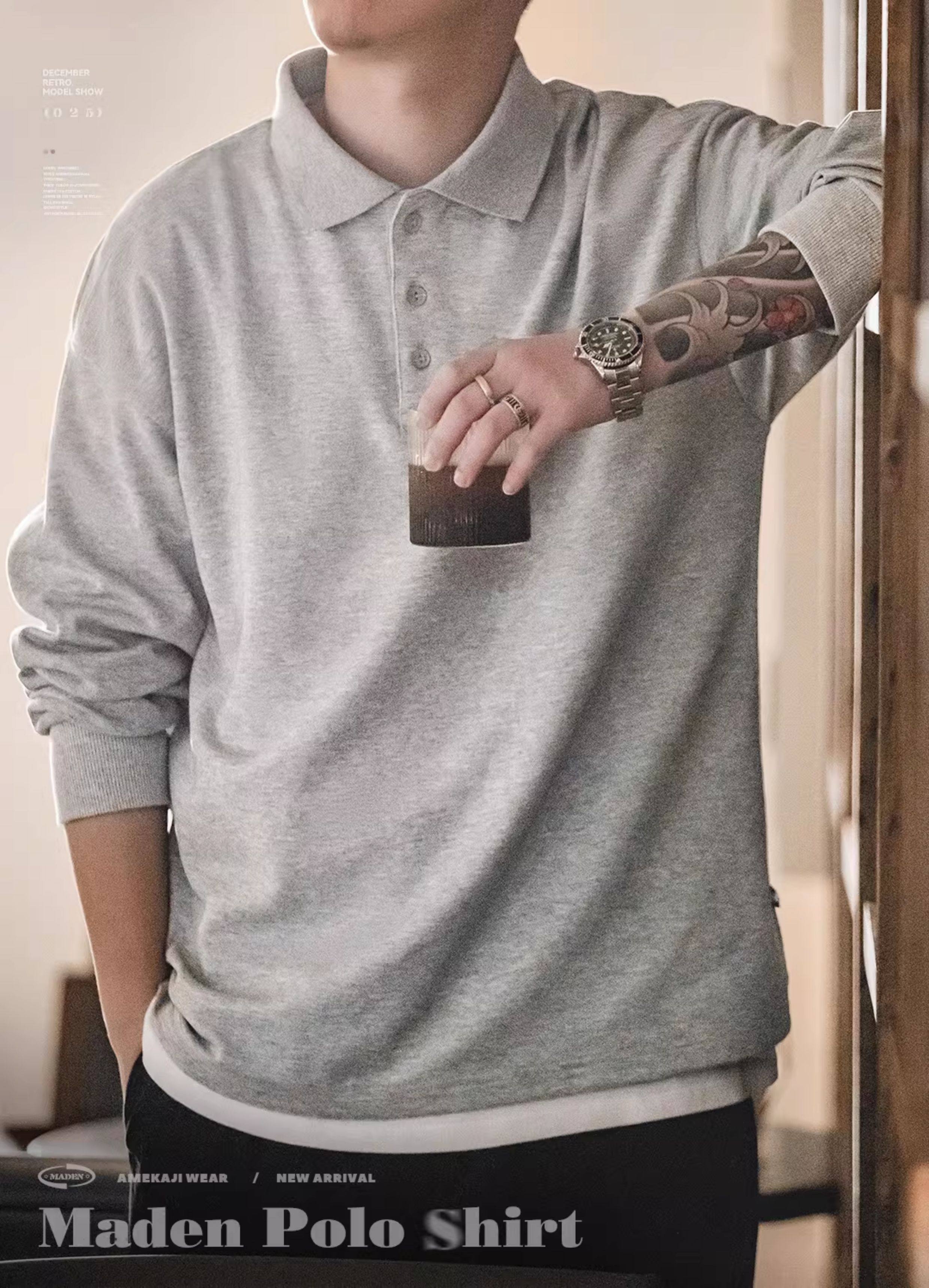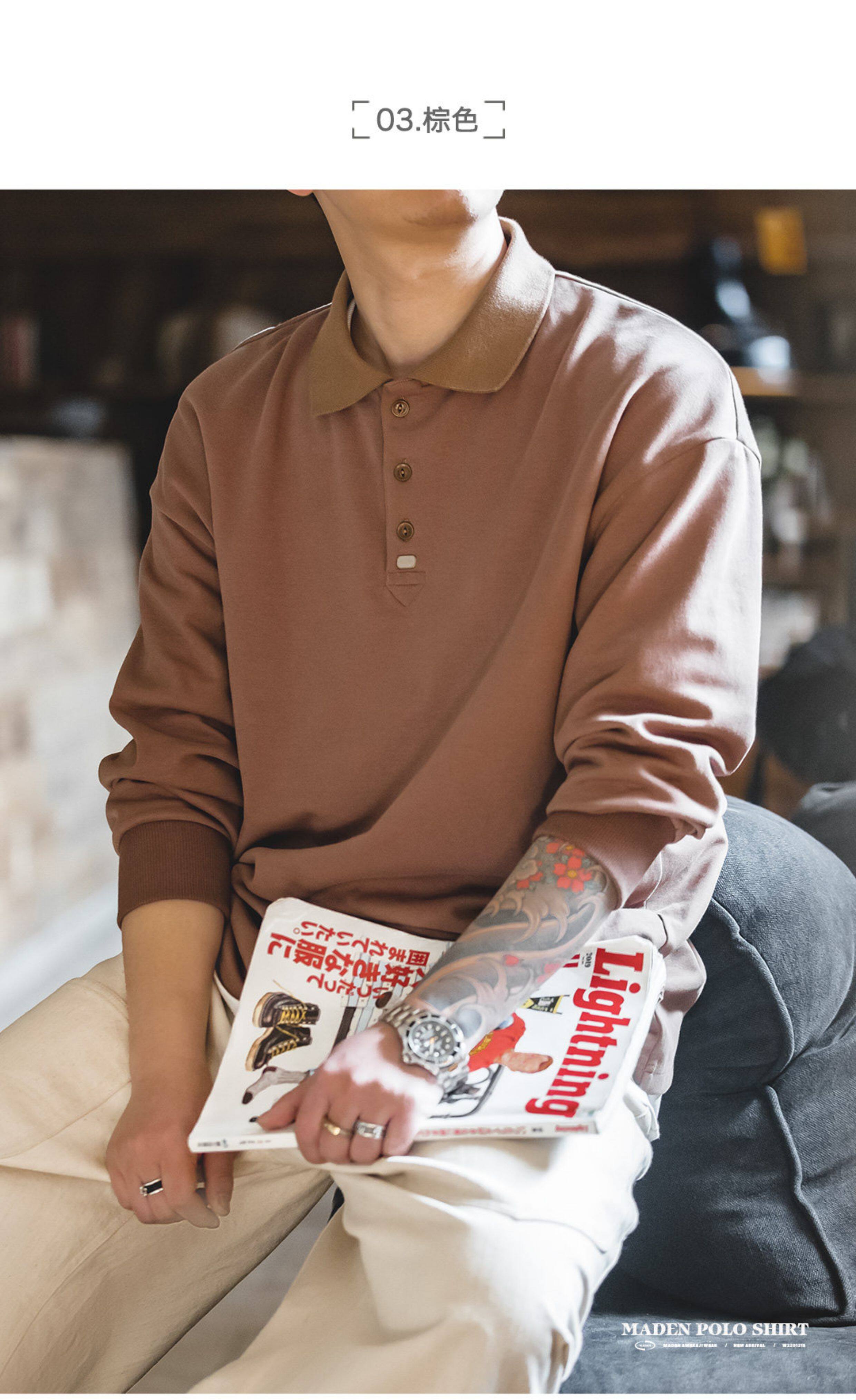 馬登工裝 美式復古基礎款長袖polo衫純色寬鬆百搭打底繙領T恤男秋