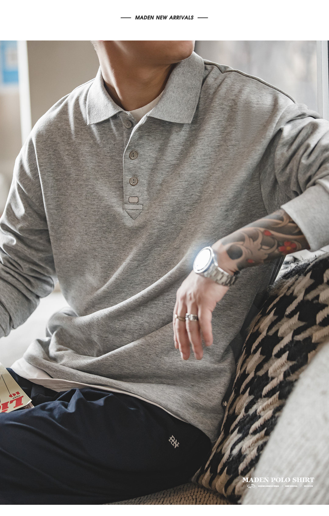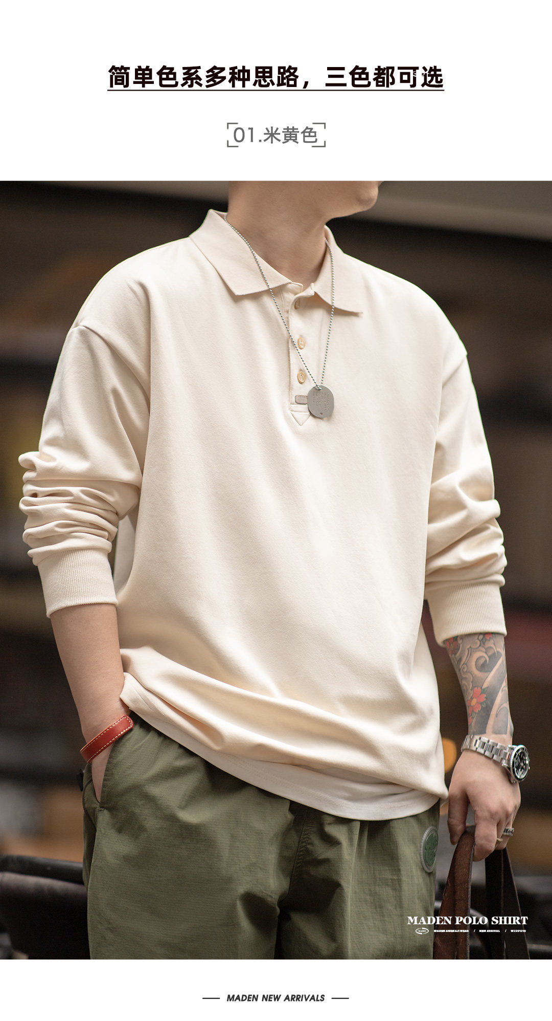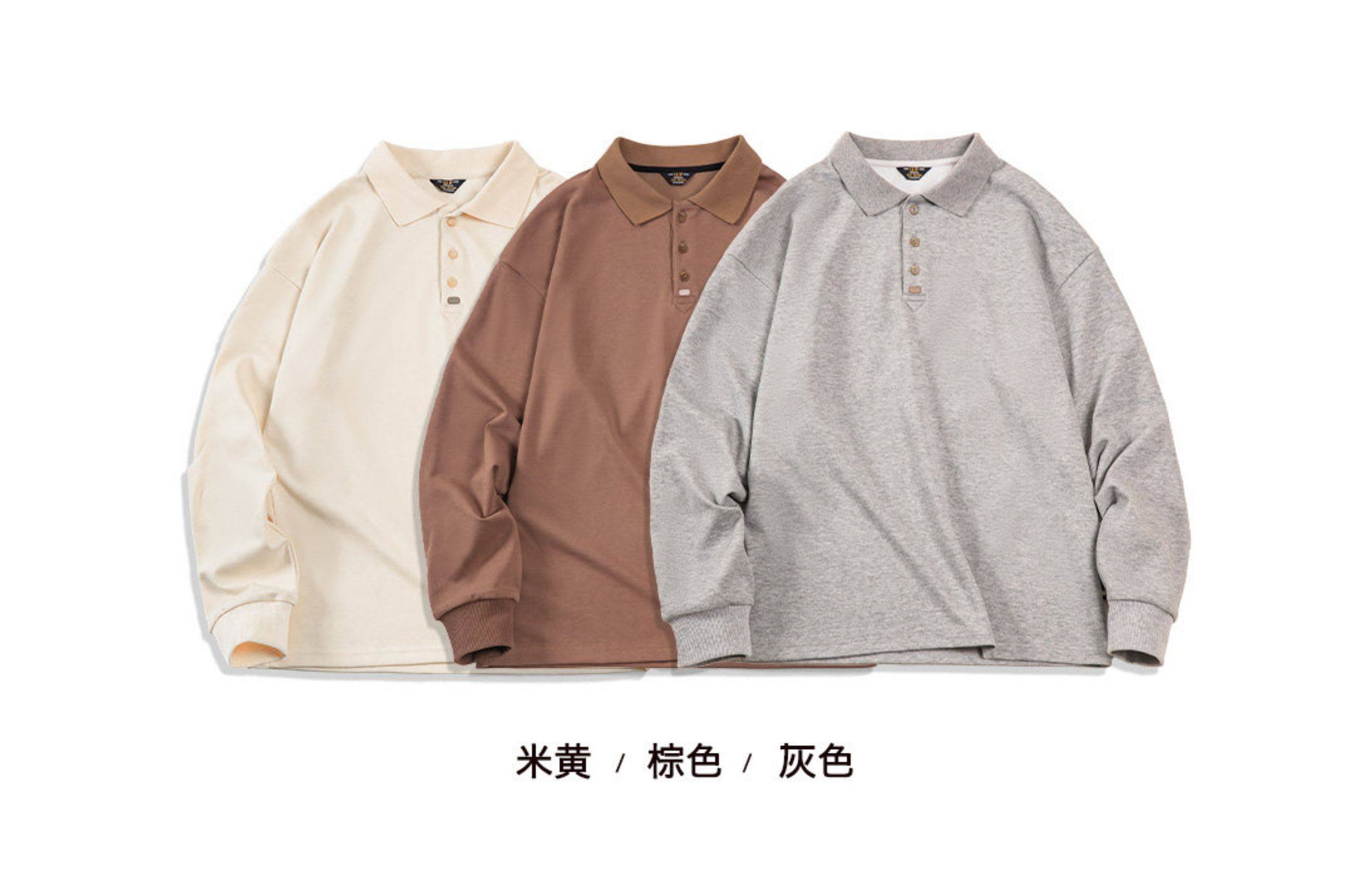 馬登工裝 美式復古基礎款長袖polo衫純色寬鬆百搭打底繙領T恤男秋