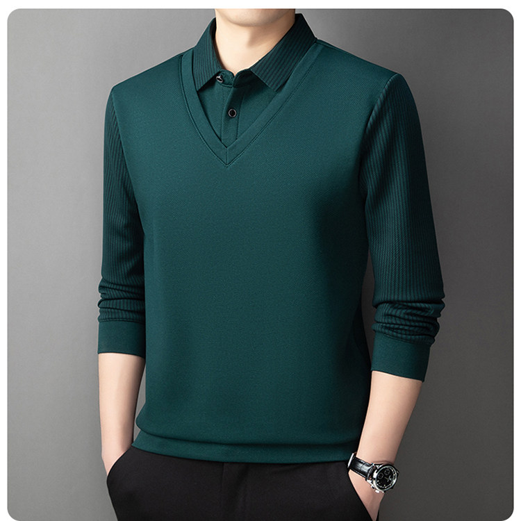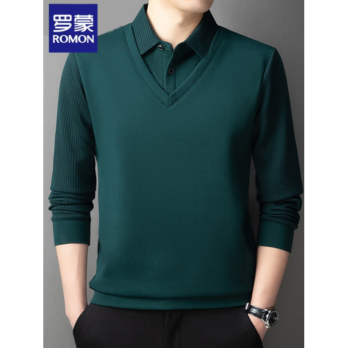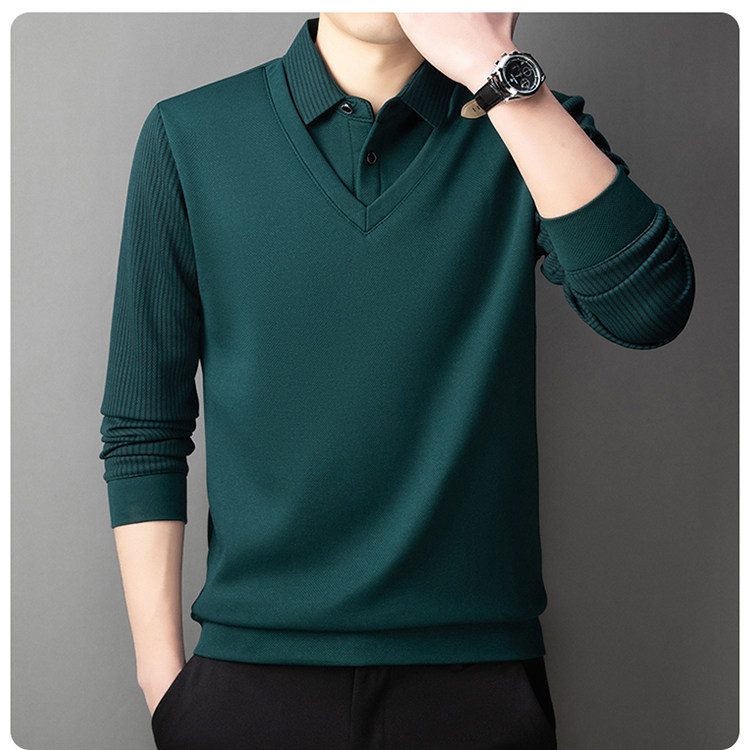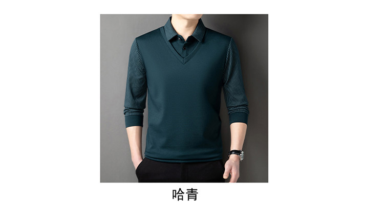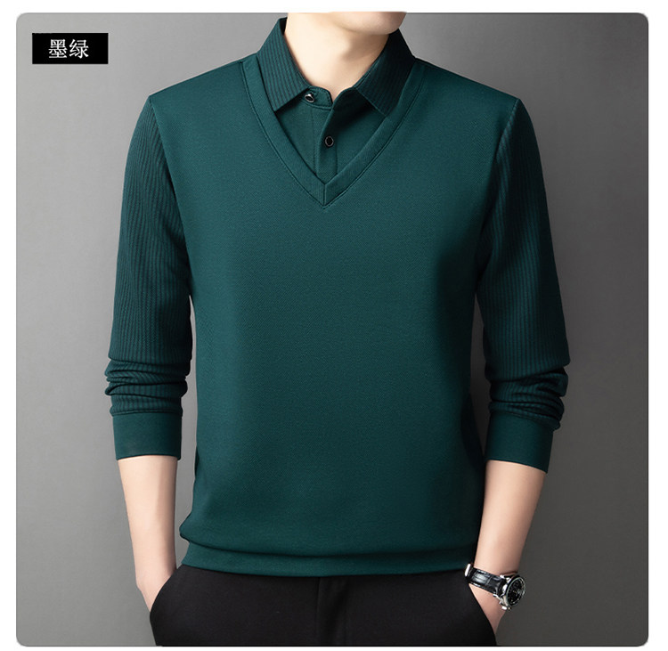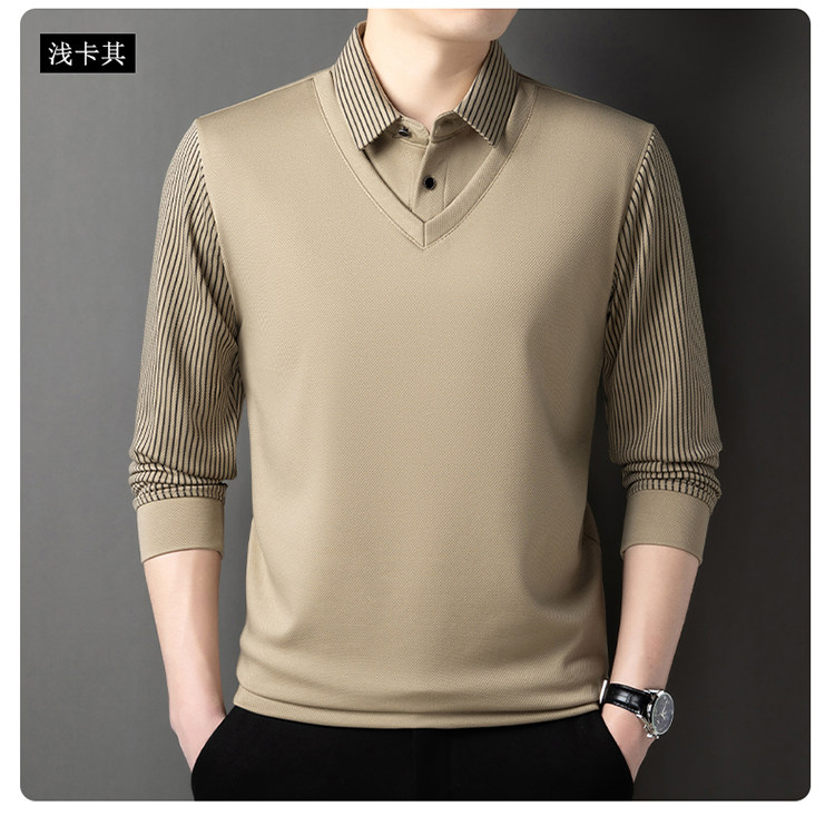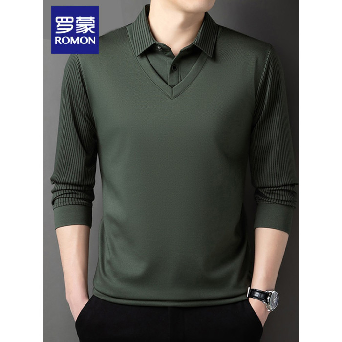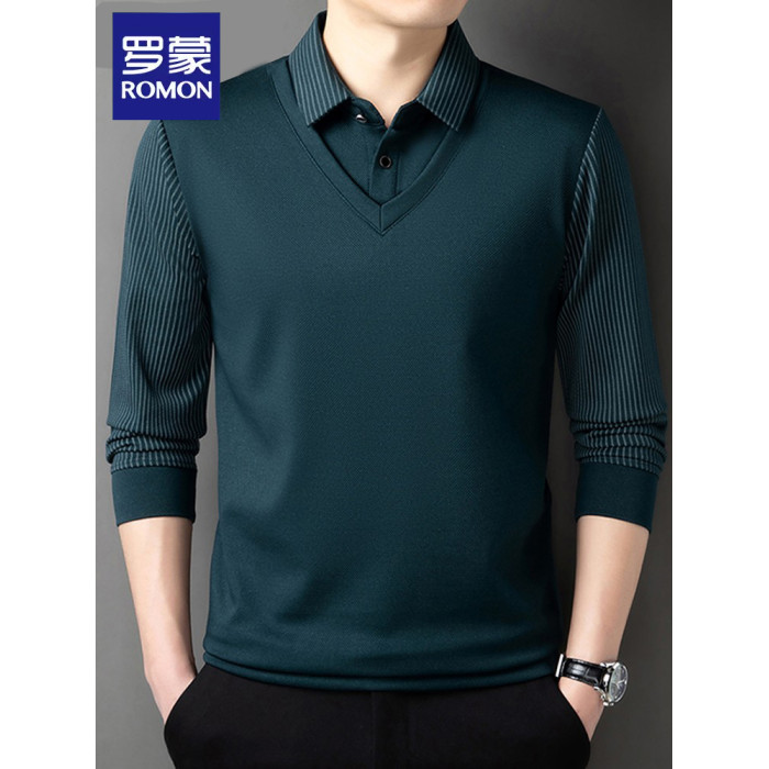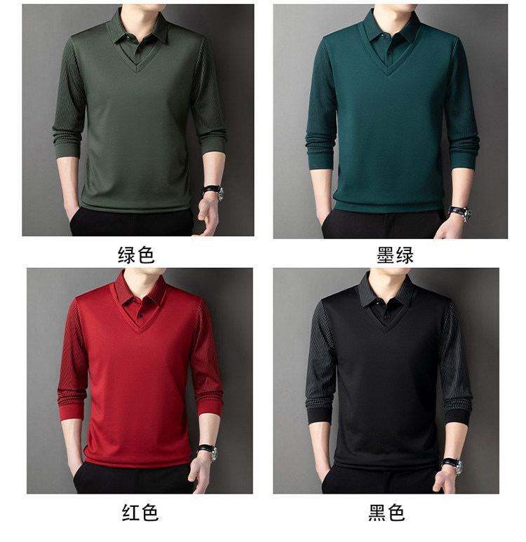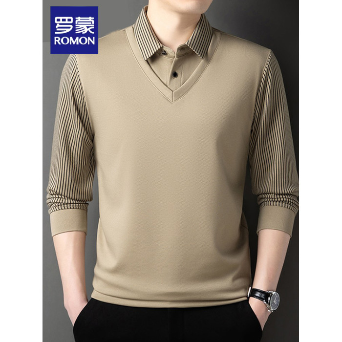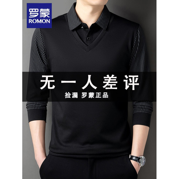 羅矇假兩件男士長袖t恤秋冬季新款爸爸裝休閒翻領上衣打底衫男