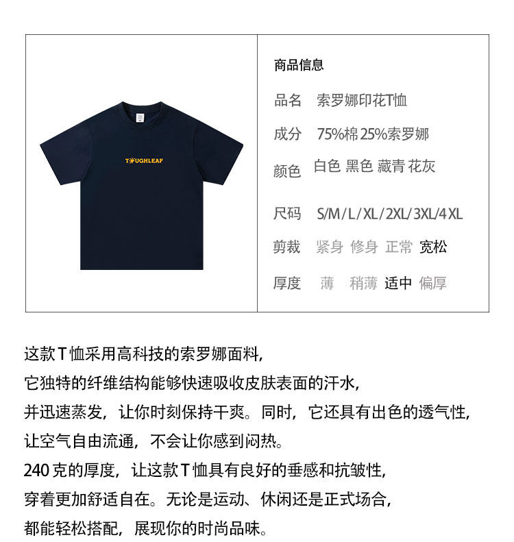 toughleaf(涼感防曬) 基礎印花索羅娜t恤男速乾寬松情侶短袖