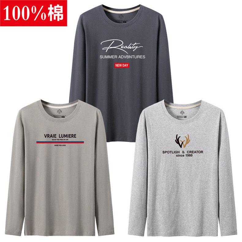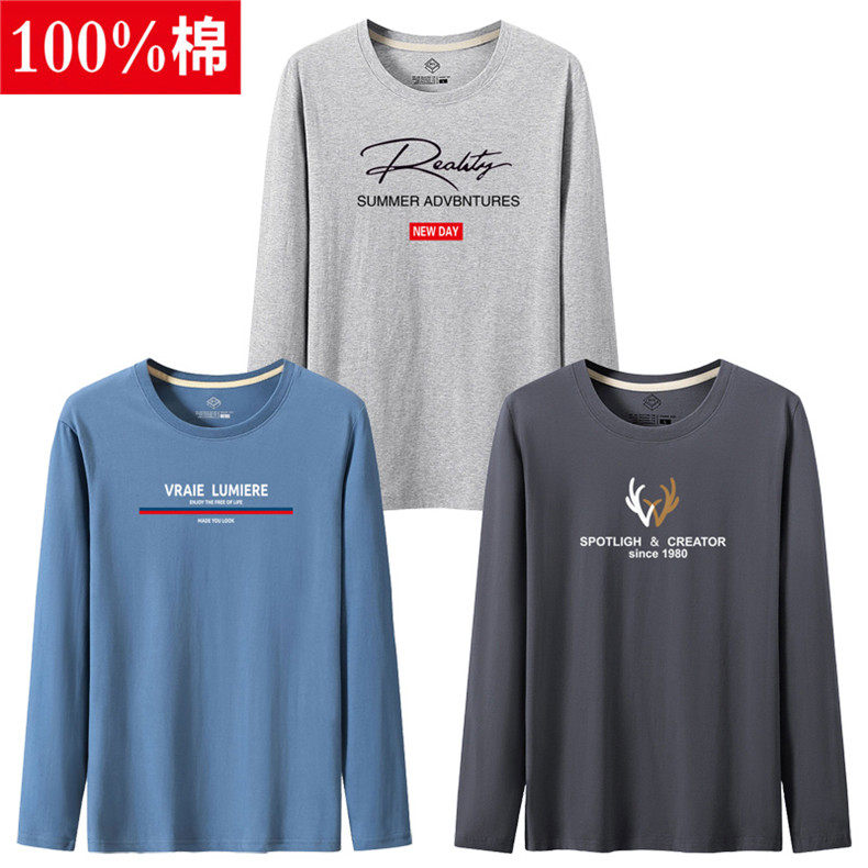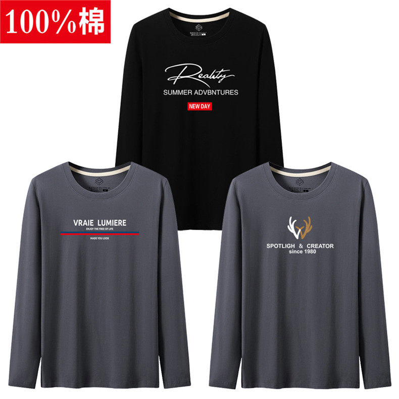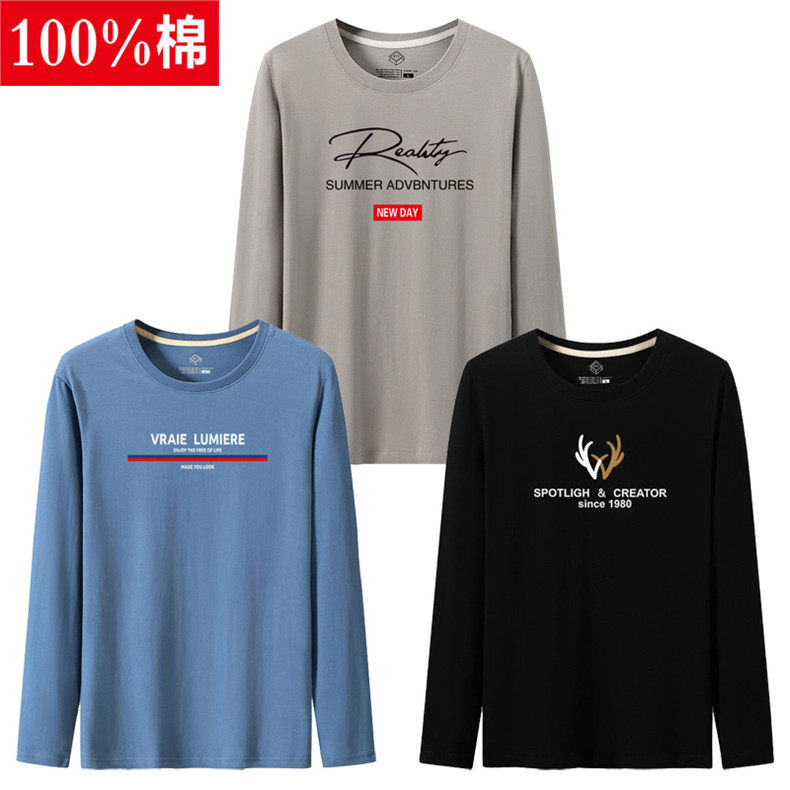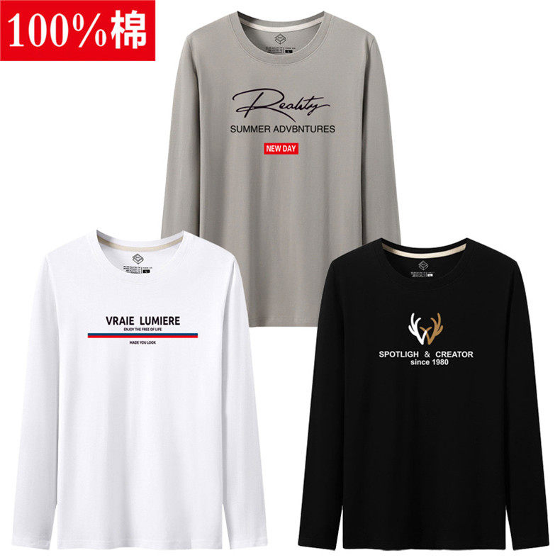 3件】純棉t恤男長袖寬松圓領薄款潮流個性體恤秋衣全棉打底衫男潮