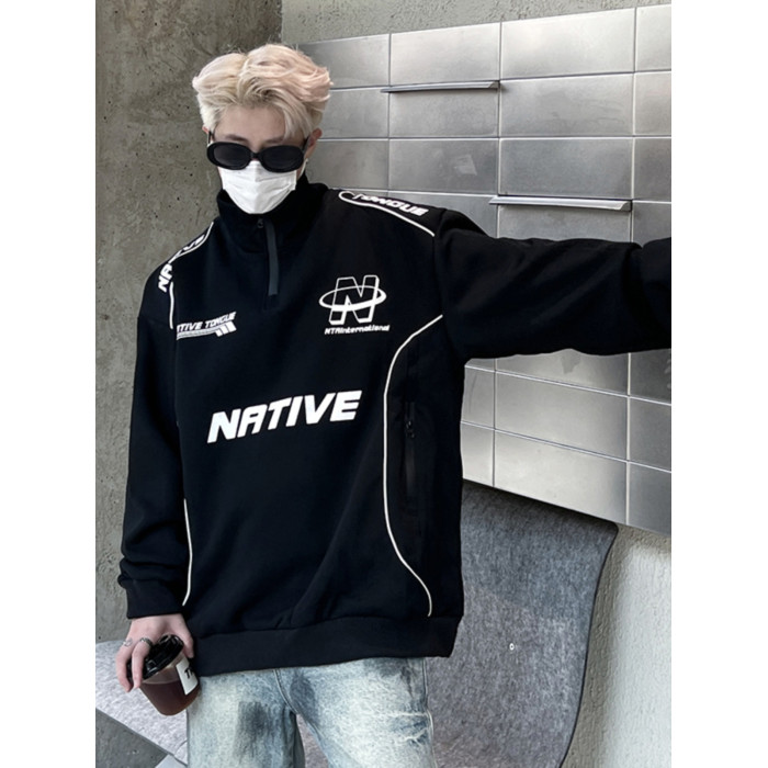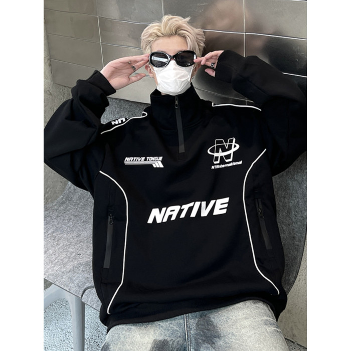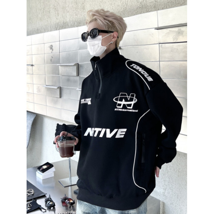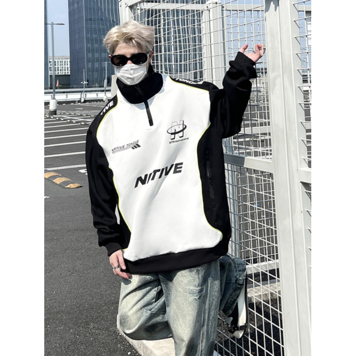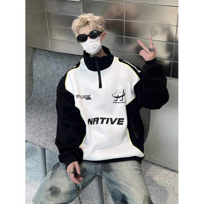 立領衛衣男秋冬情侶馬甲重磅硬挺拼接上衣潮高街半拉鍊賽車服外套