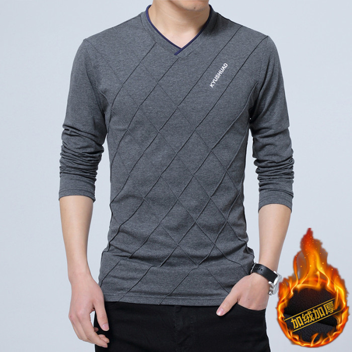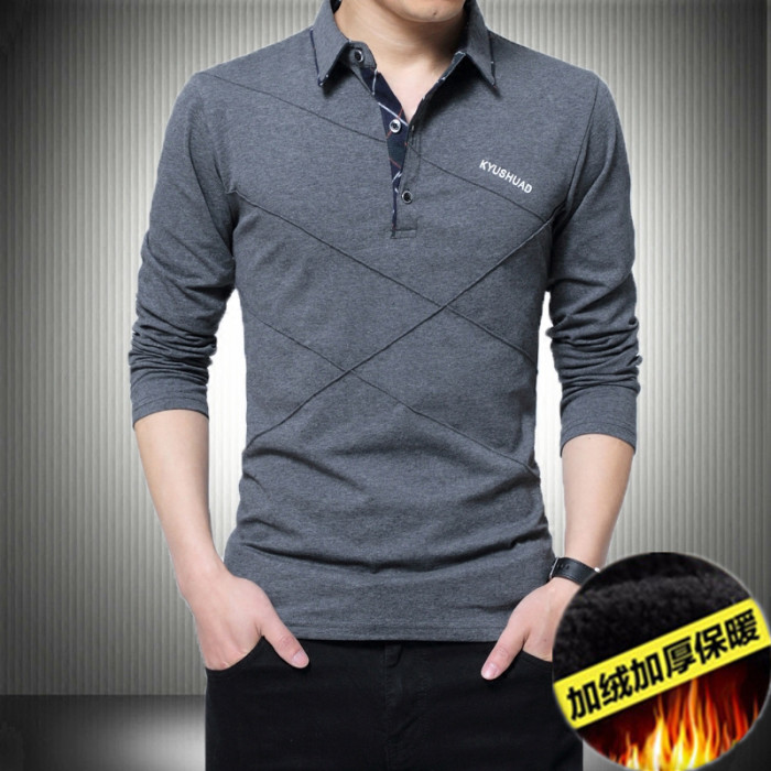 2025款秋冬男士繙領長袖T恤貼身純棉加絨內穿搭深灰色打底小衫5XL