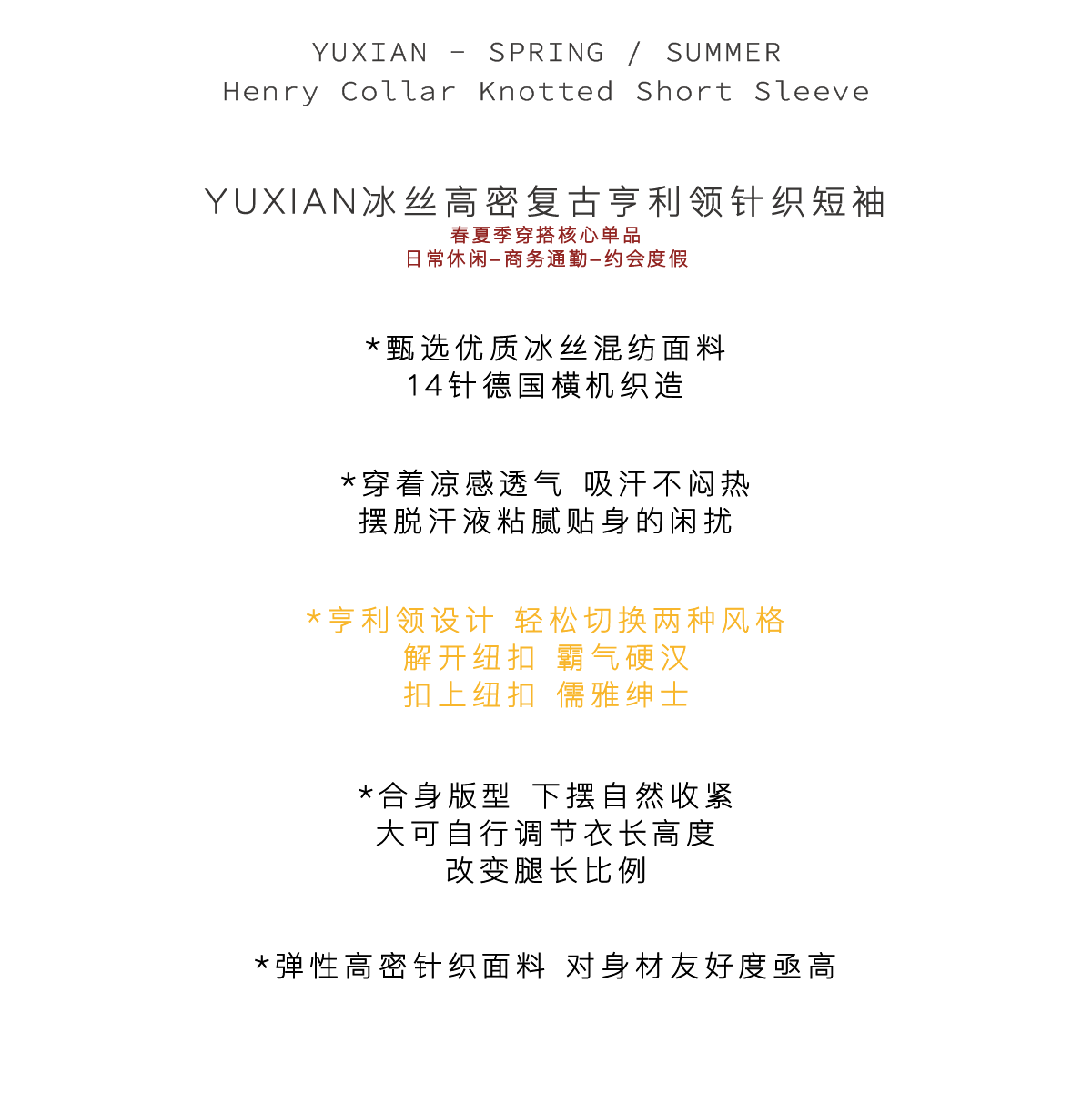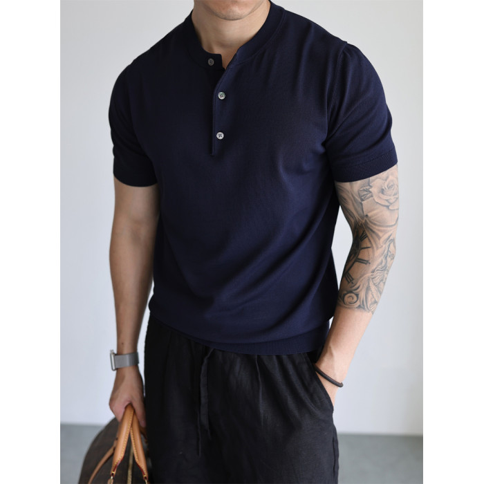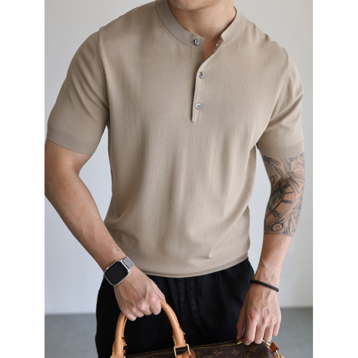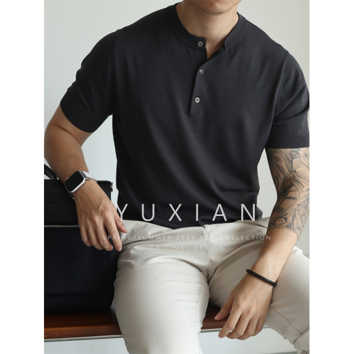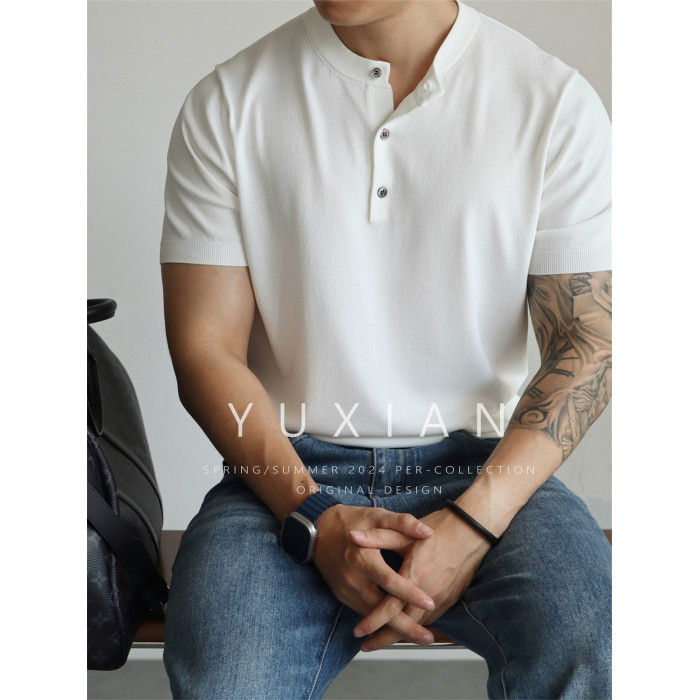 YUXIAN美式亨利領純色涼感復古針織短袖T恤春夏冰絲高密彈力男士