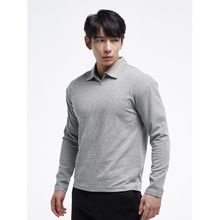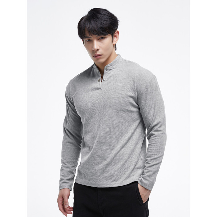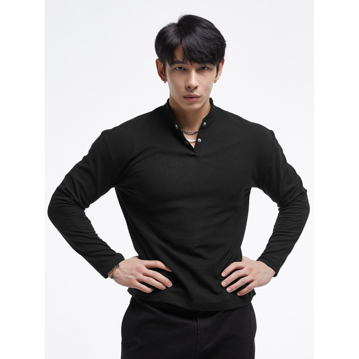 秋冬新款t恤新中式亨利領長袖polo衫簡約純色健身男士上衣
