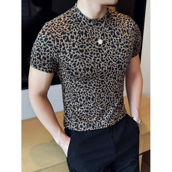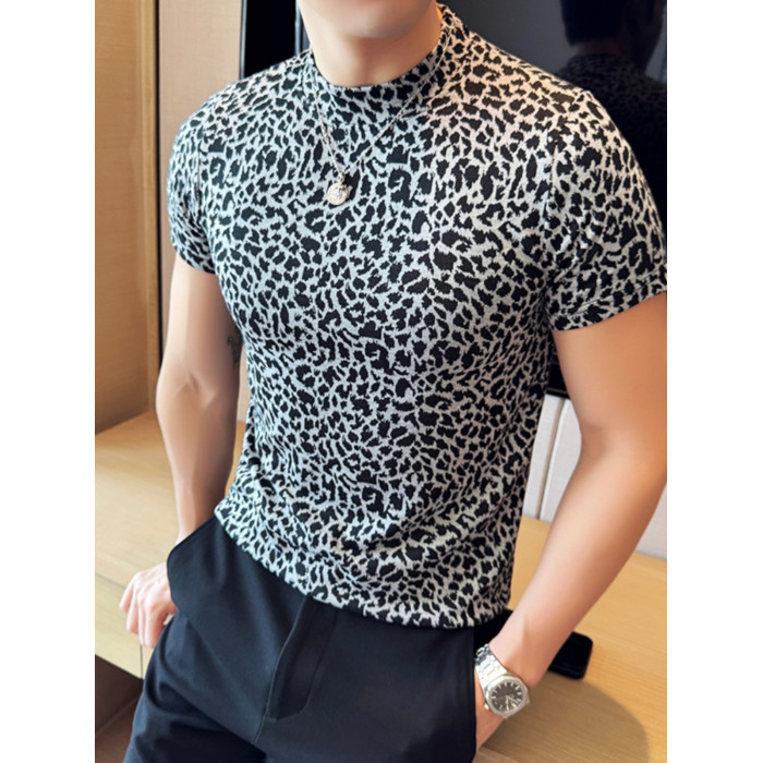 香港彈力純棉中領個性豹紋男t恤短袖2025韓版修身半高領體恤上衣