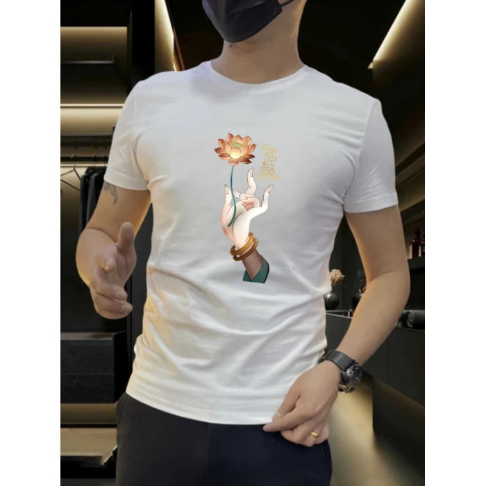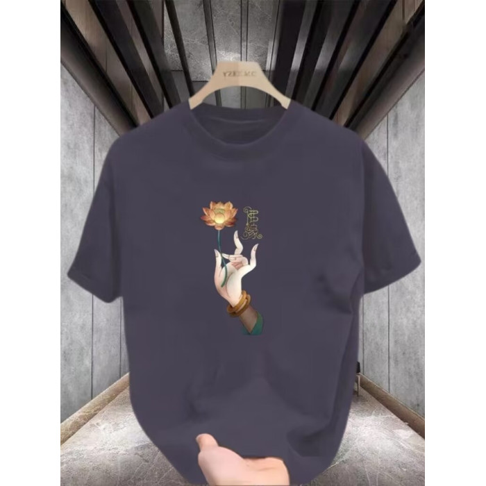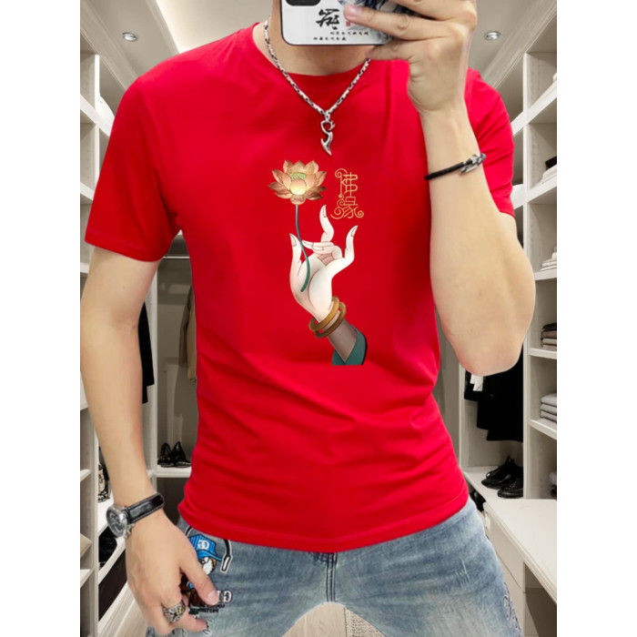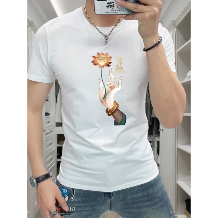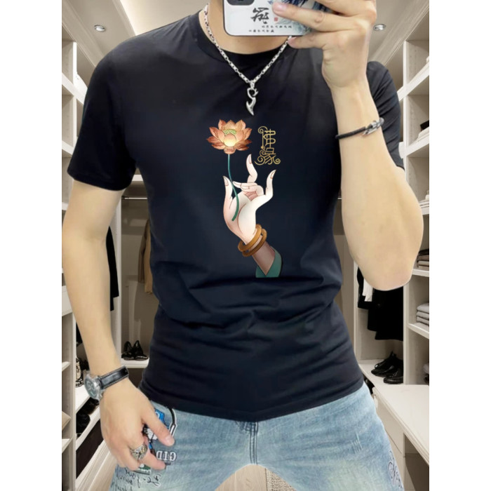 國潮彿系蓮花印花高級感冰絲光棉短袖男T恤夏季修身圓領彈力上衣