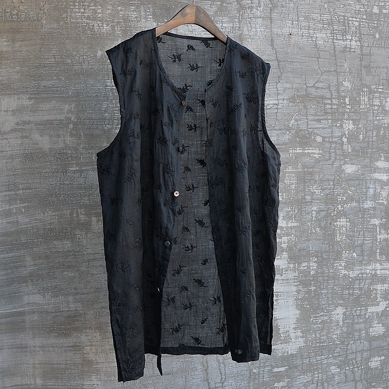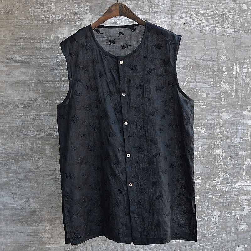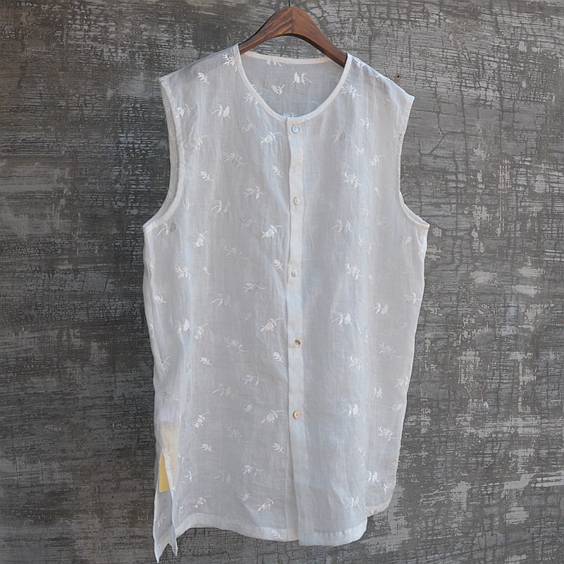 夏季男士背心t恤汗衫無袖寬鬆風刺綉苧麻中長混搭時尚流行帥