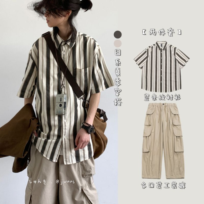 黑白條紋襯衫+杏色工裝褲-【二件】