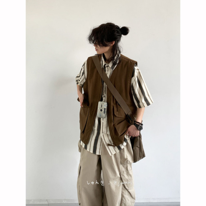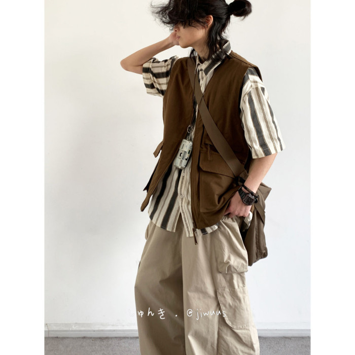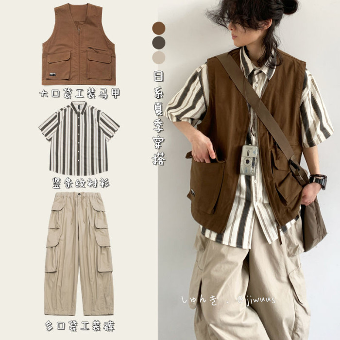 棕色馬甲+黑白條紋襯衫+杏色工裝褲-【三件】