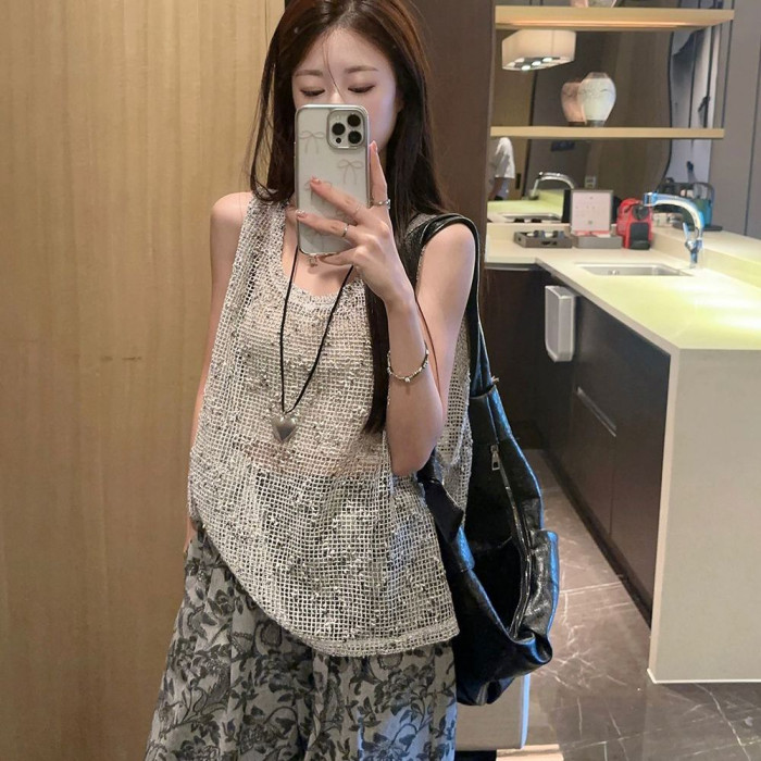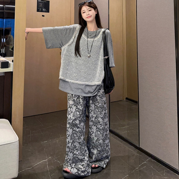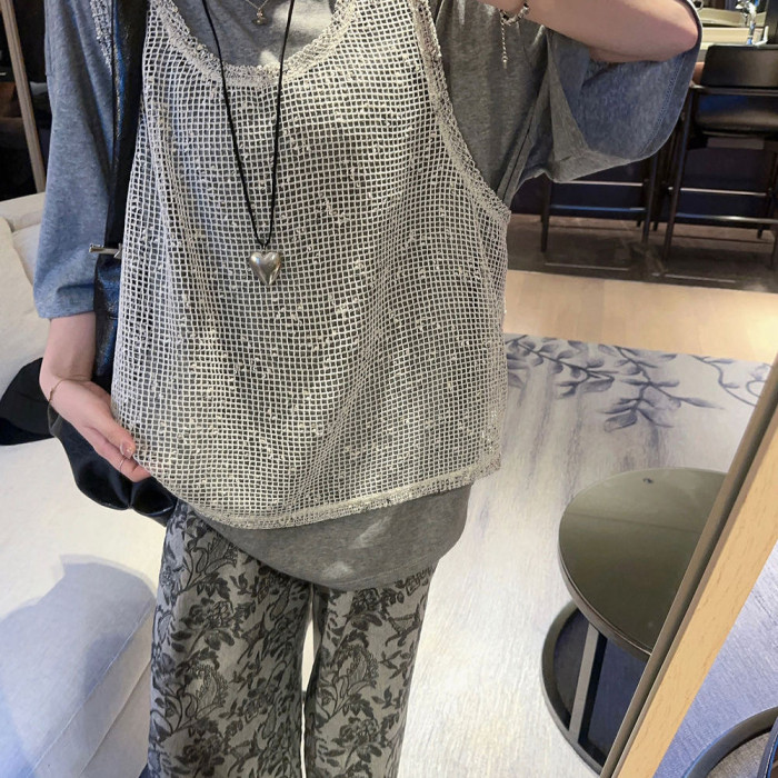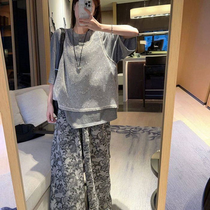 特大碼300斤高級感休閒套裝男女裝夏季鏤空網格馬甲短袖T恤休閒褲