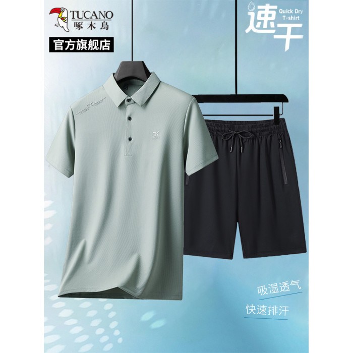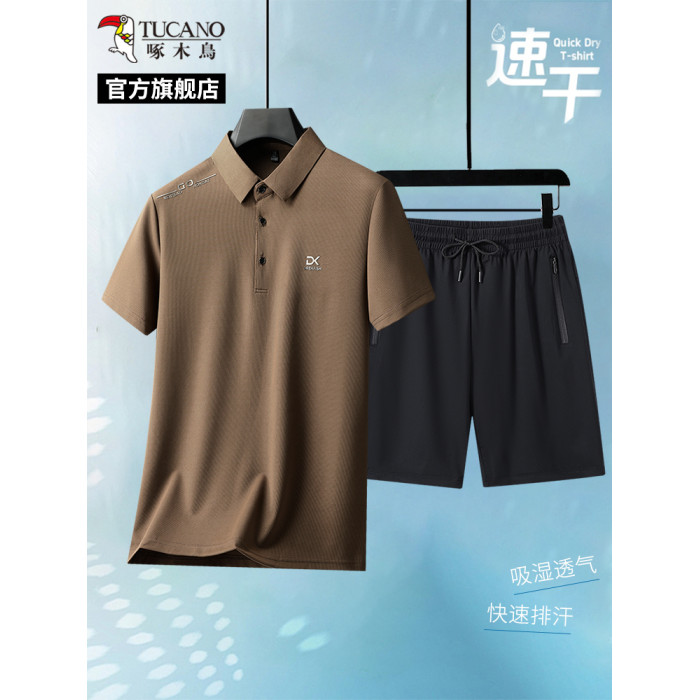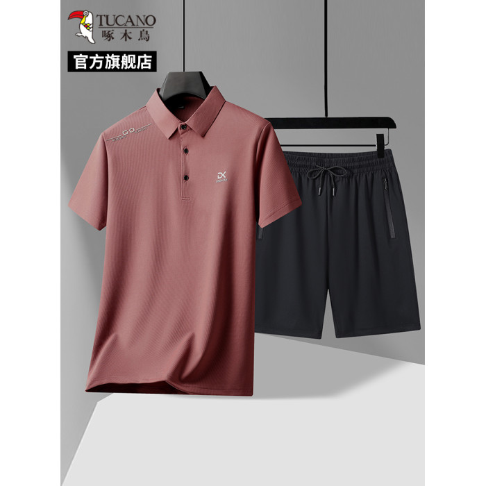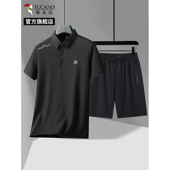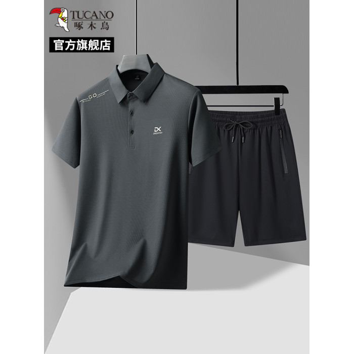 啄木鳥官方2025新款爸爸夏季冰絲休閒套裝POLO衫薄款男士短袖t恤C
