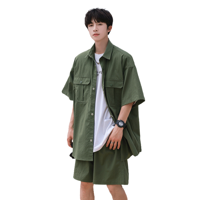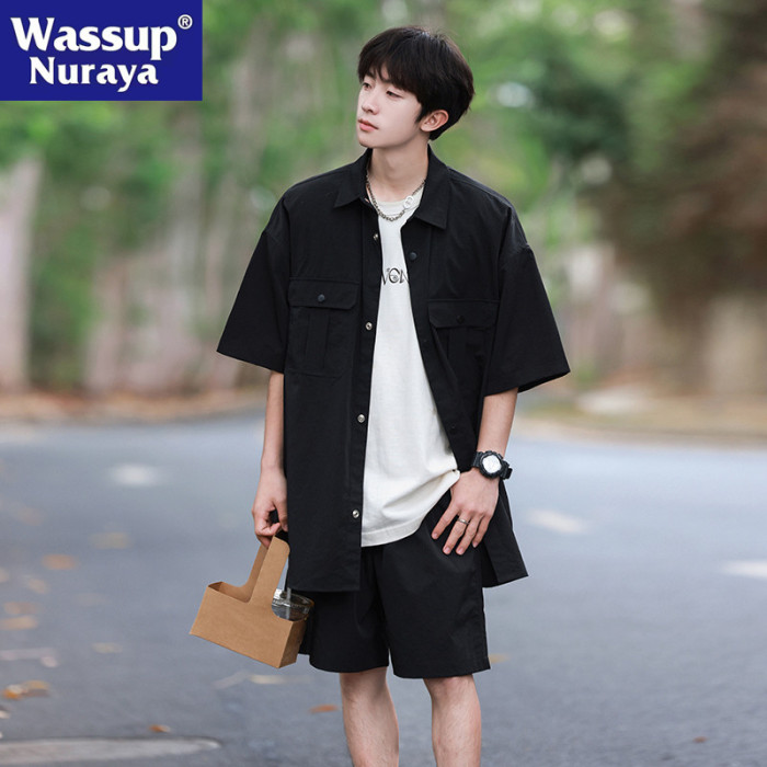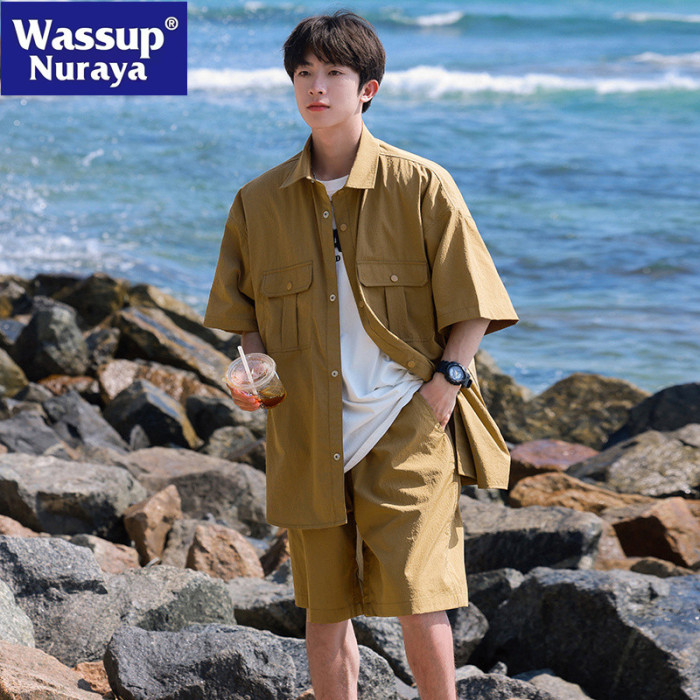 WASSUP NURAYA日系工裝短袖襯衫套裝男士夏季休閒短褲襯衣兩件套