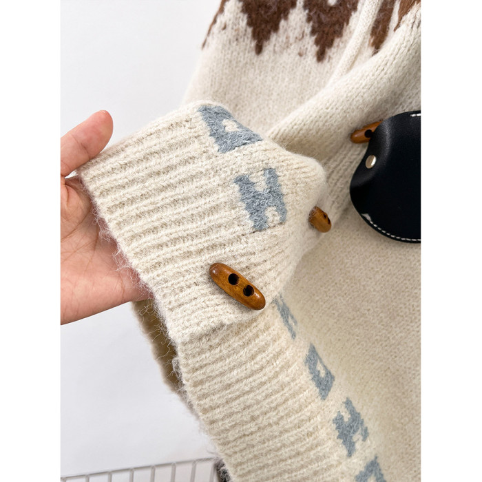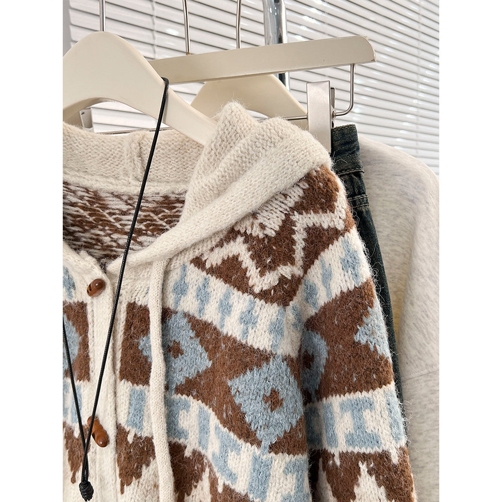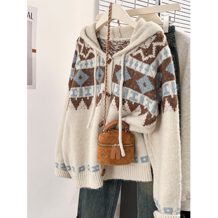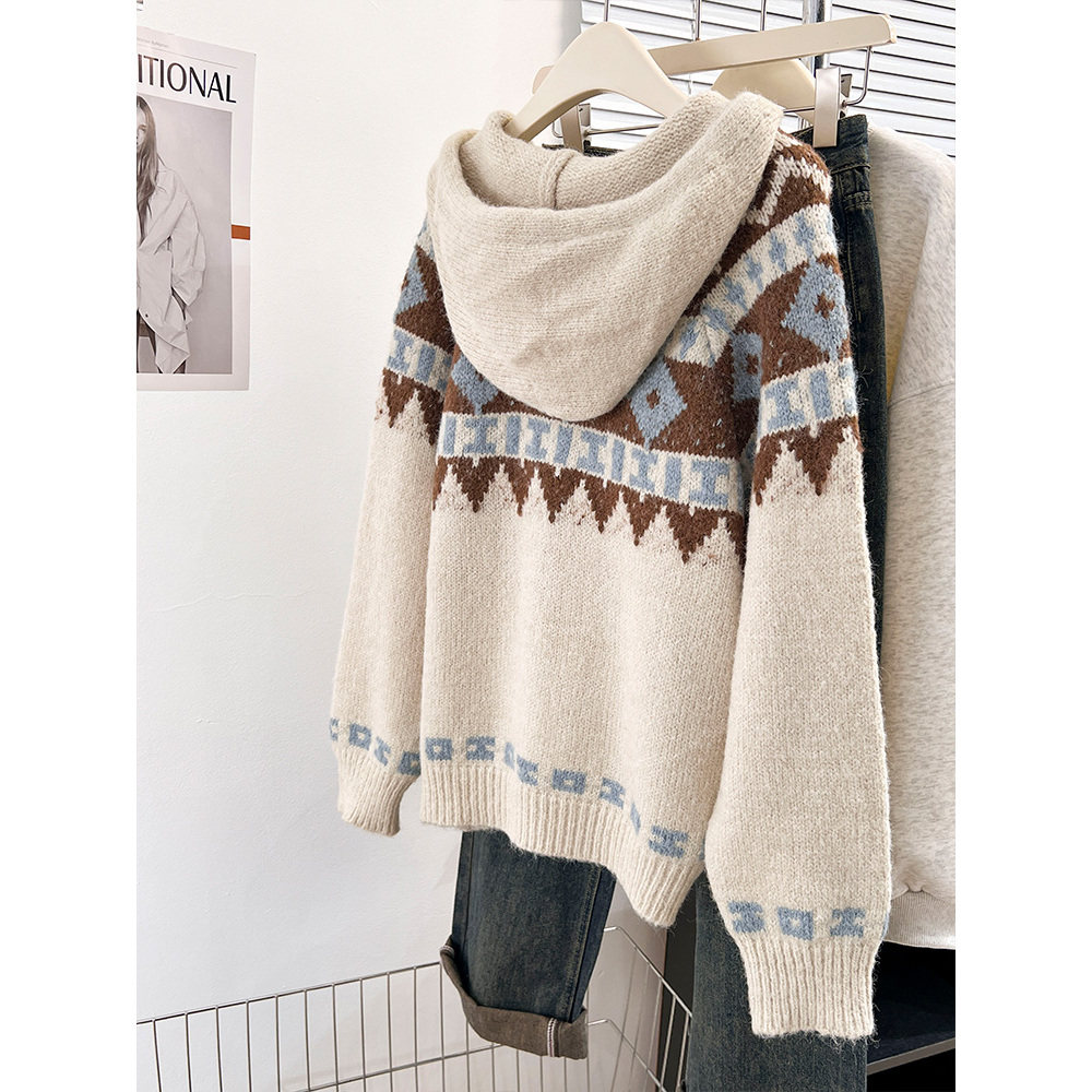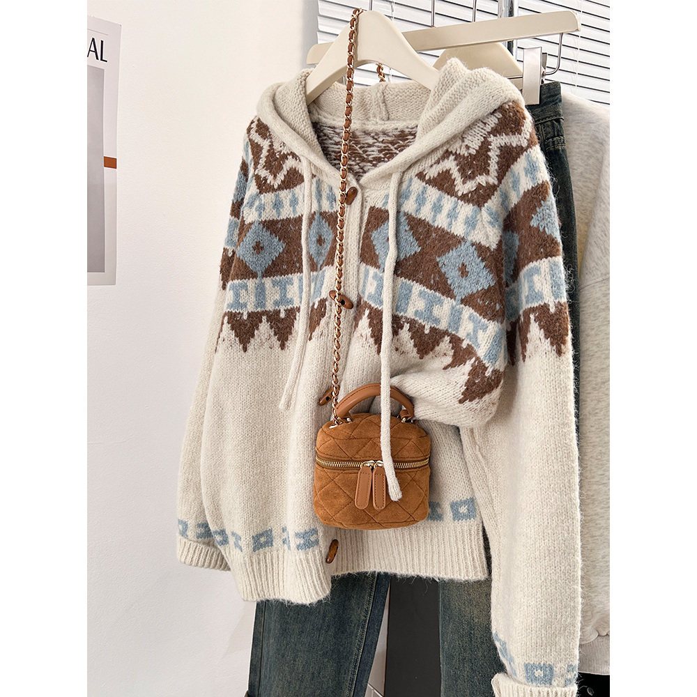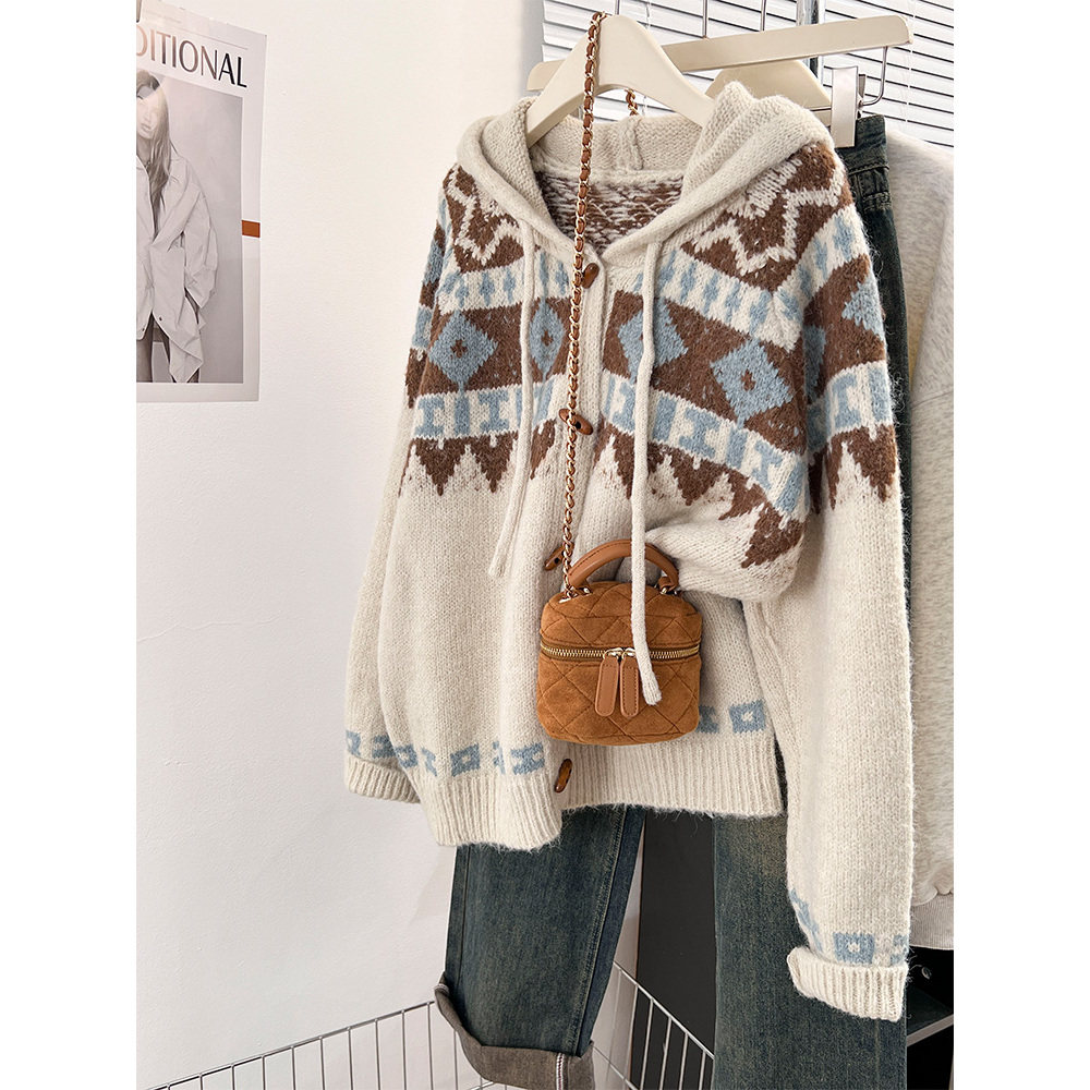 費爾島連帽毛衣外套開衫女秋冬復古外穿加厚寬松慵懶風針織衫上衣