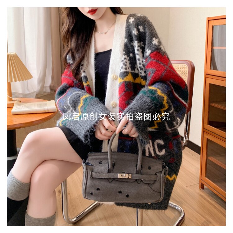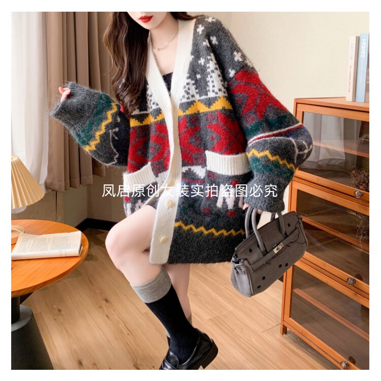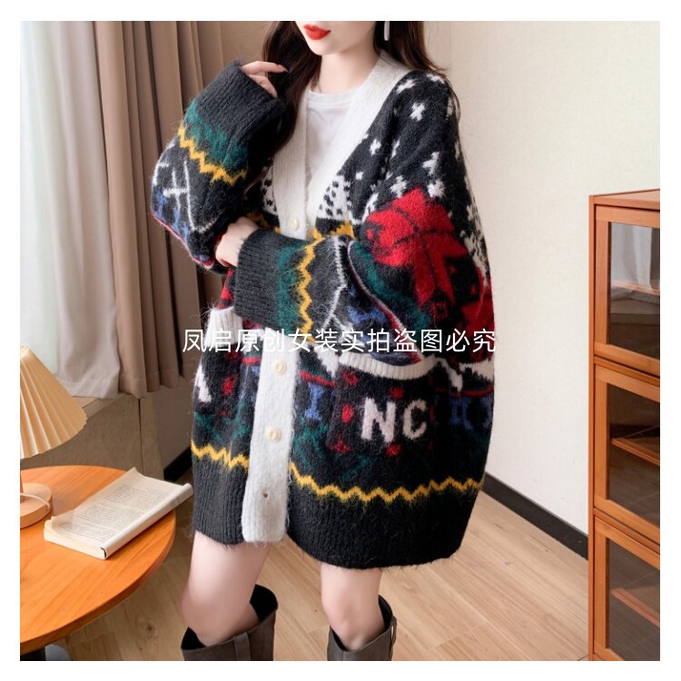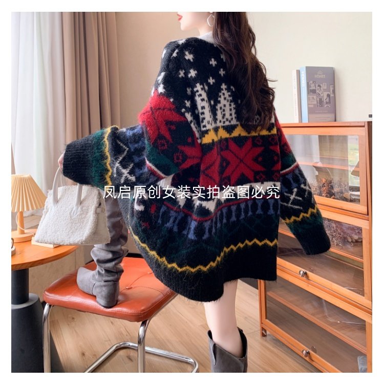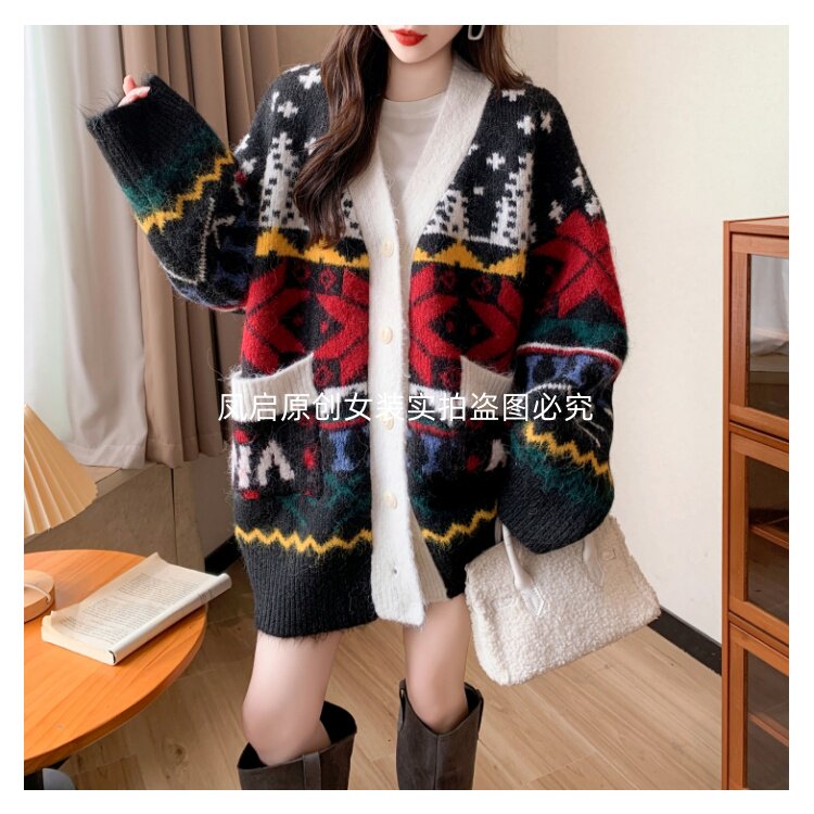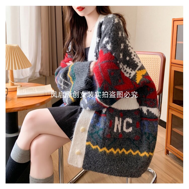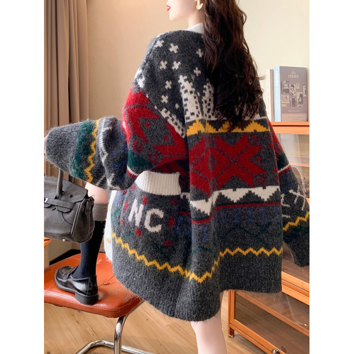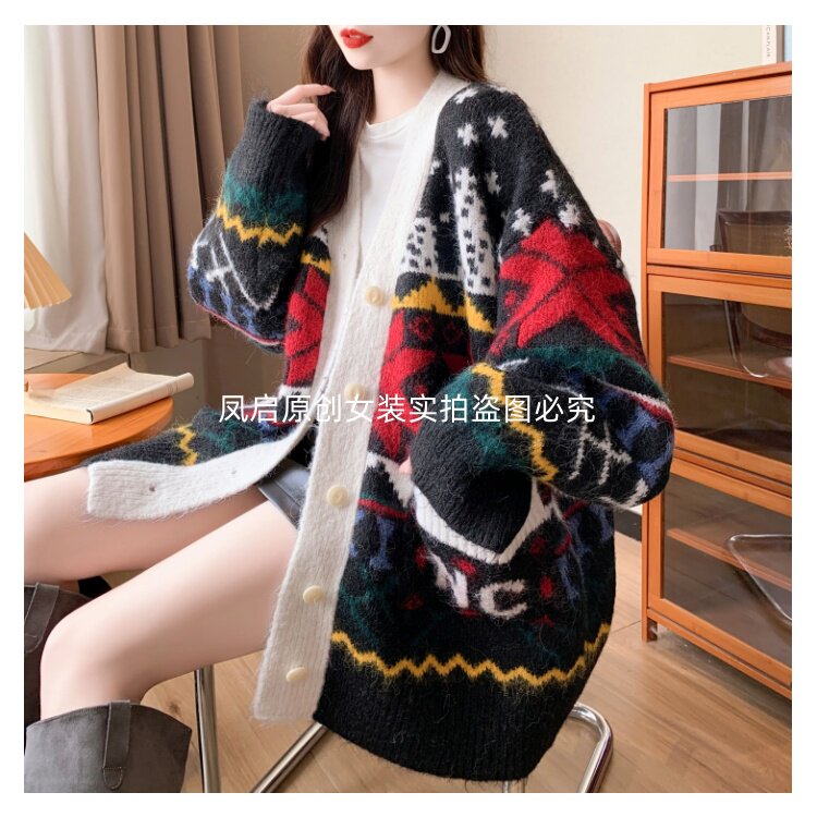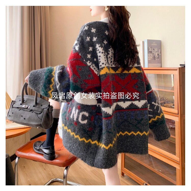 秋冬費爾島提花巨好看針織毛衣開衫女慵懶風高級感中長款大碼外套
