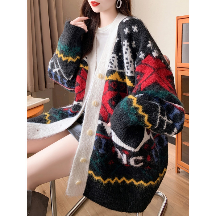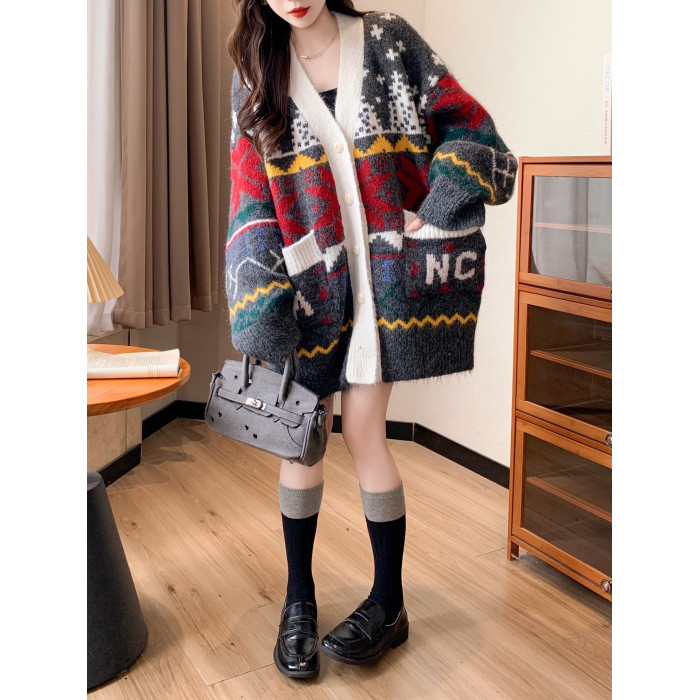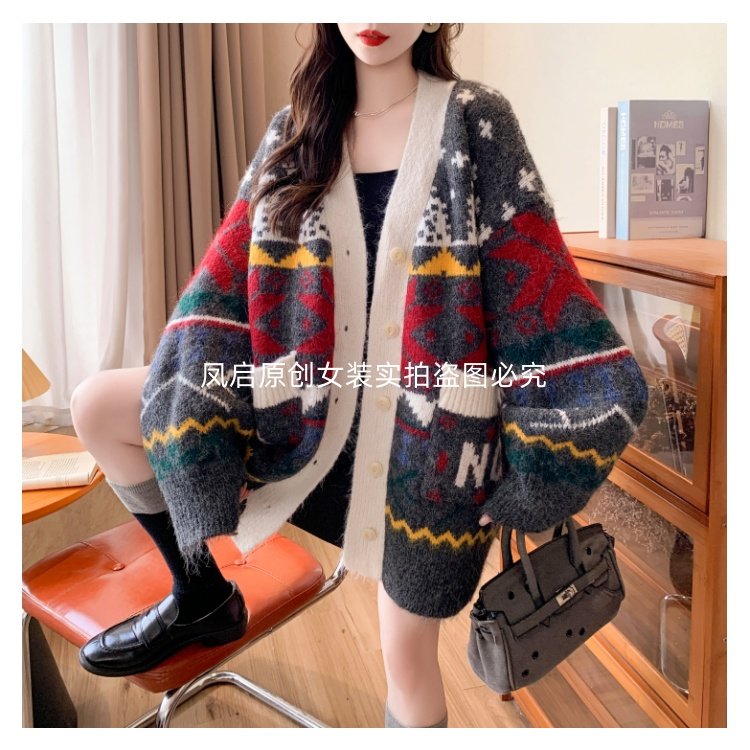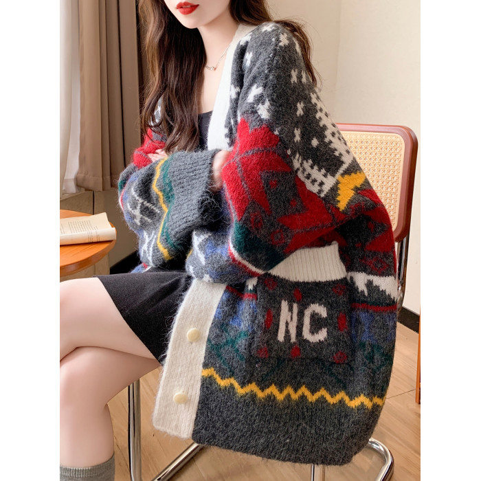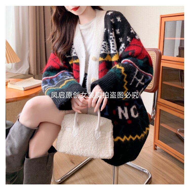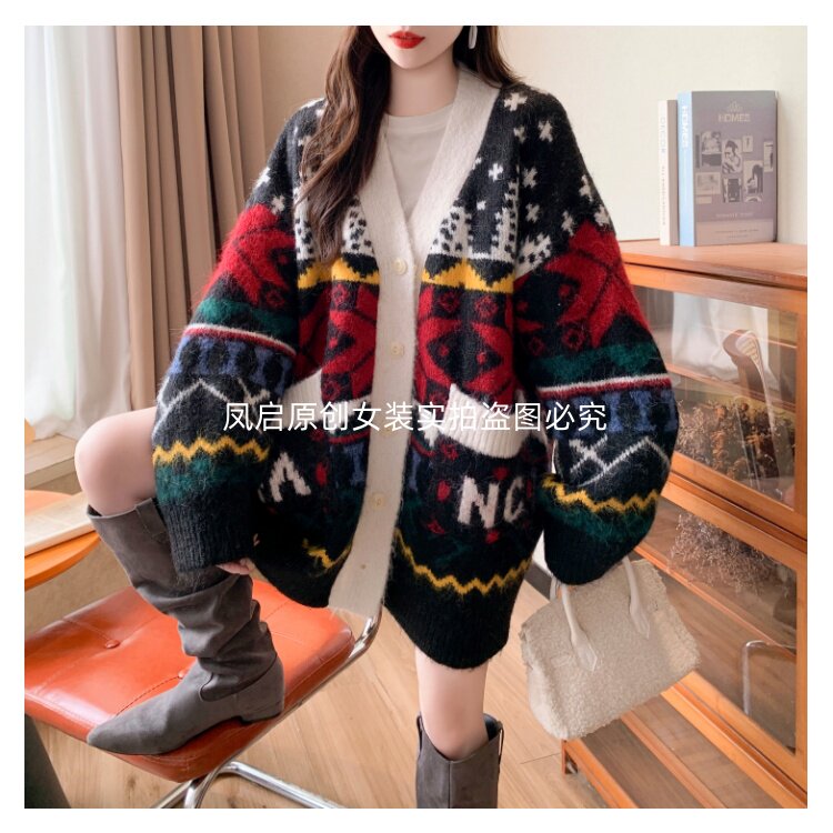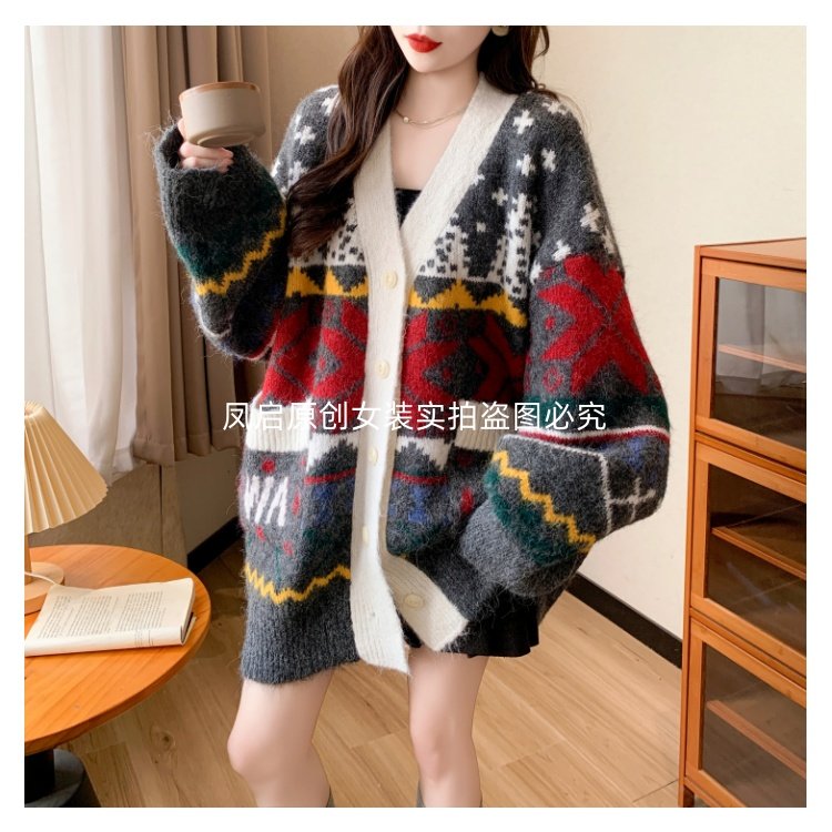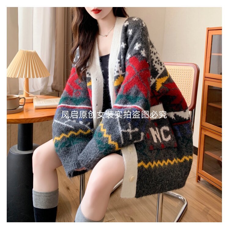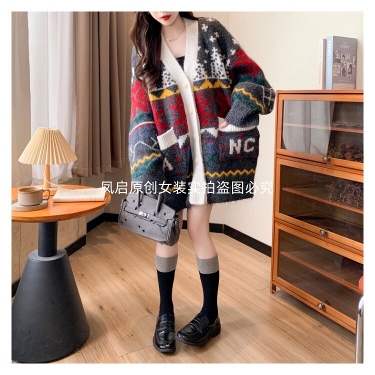 秋冬費爾島提花巨好看針織毛衣開衫女慵懶風高級感中長款大碼外套