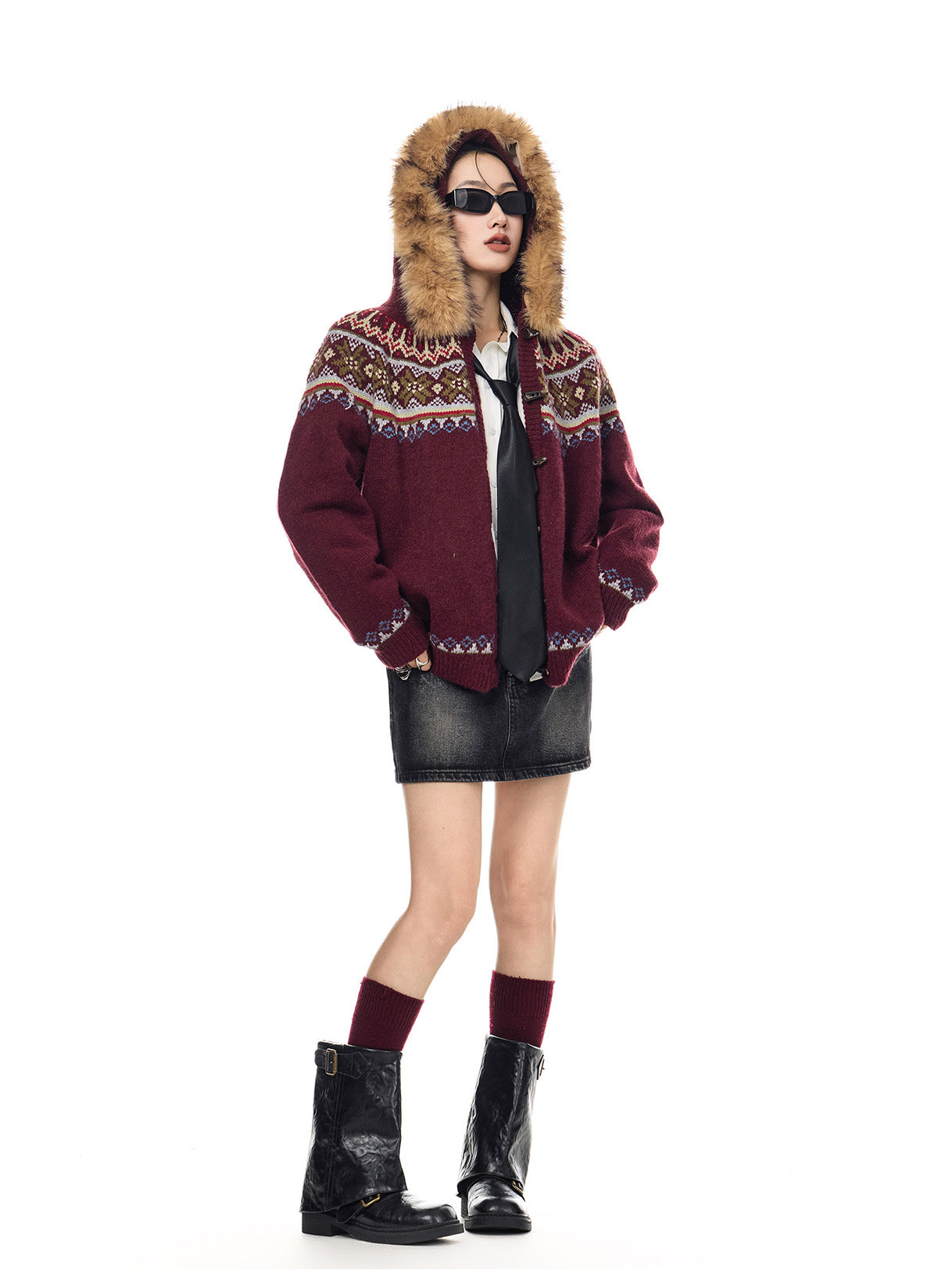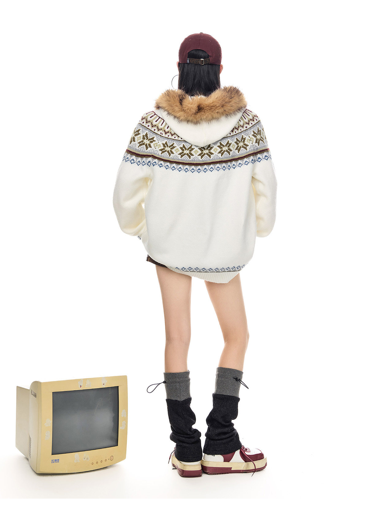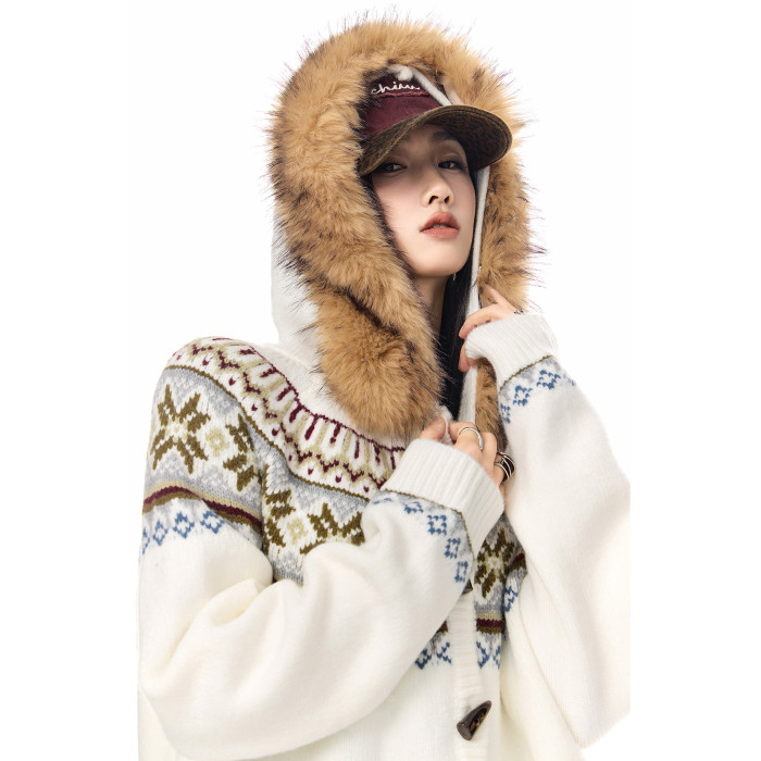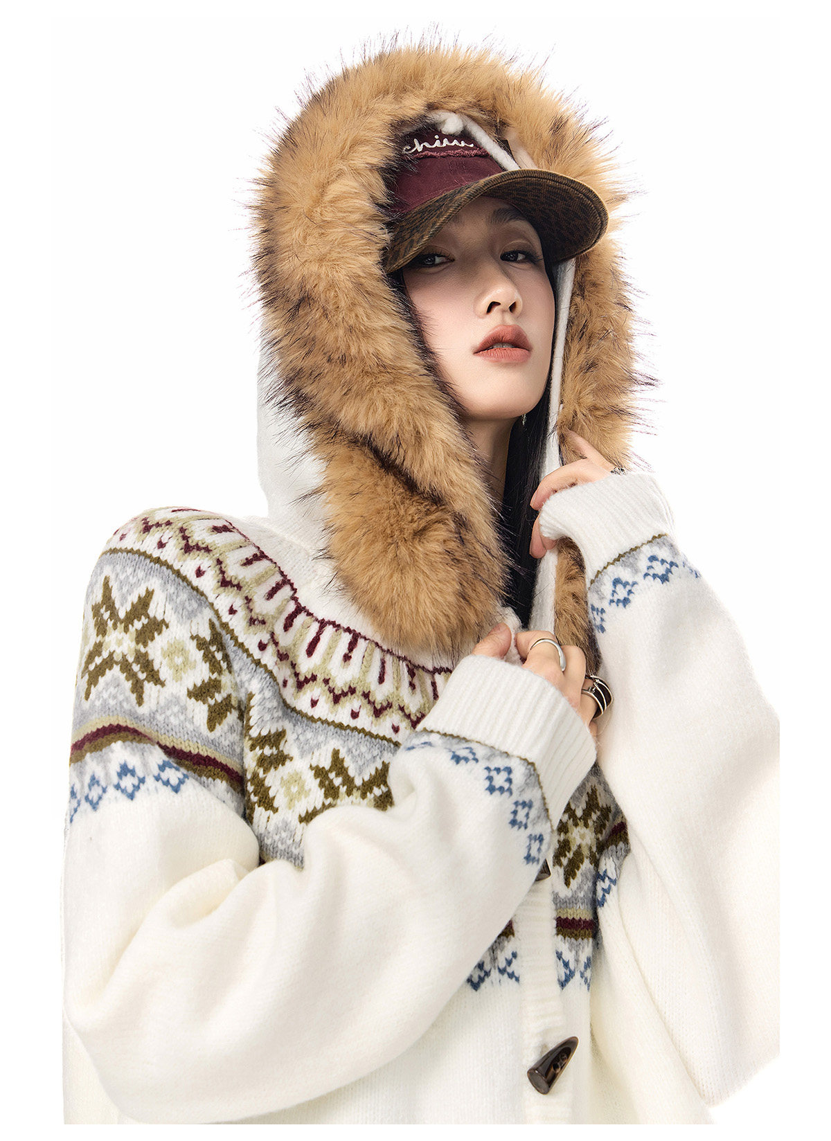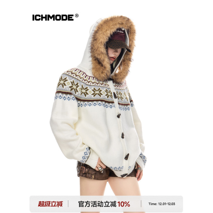 ICH MODE 美式復古費爾島毛領連帽針織開衫女春秋季慵懶毛衣外套