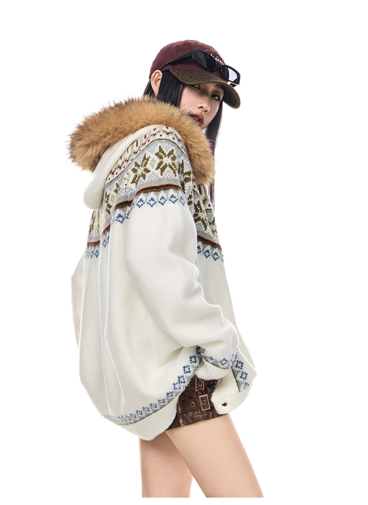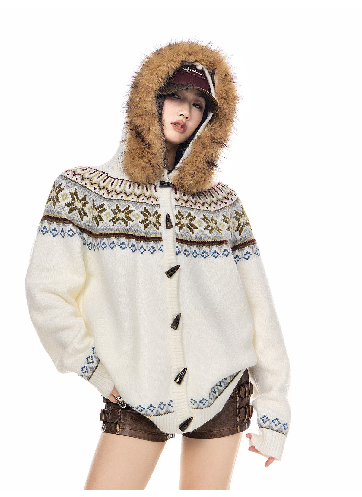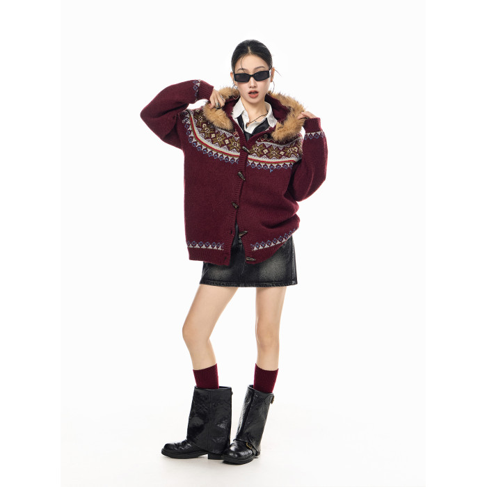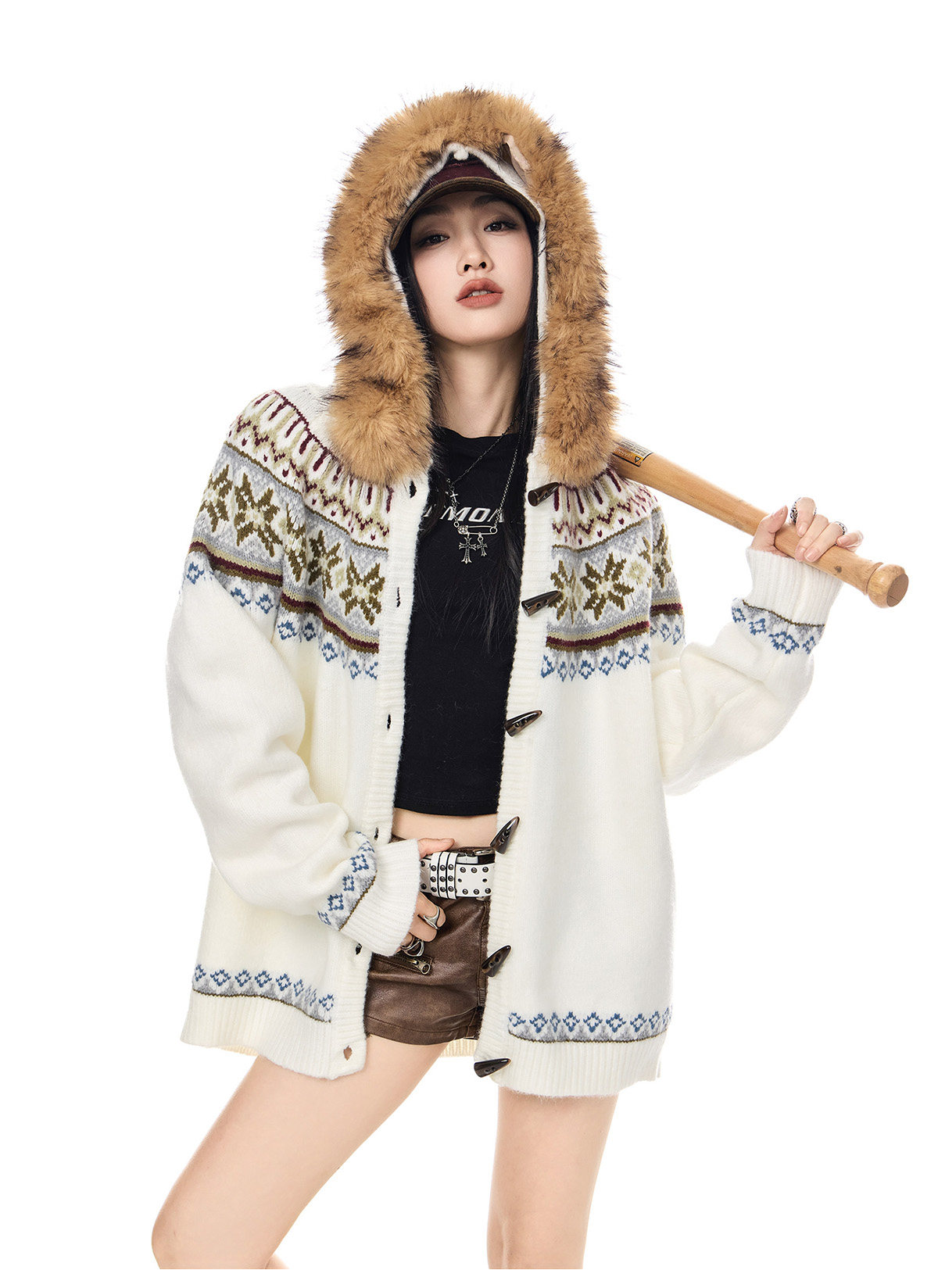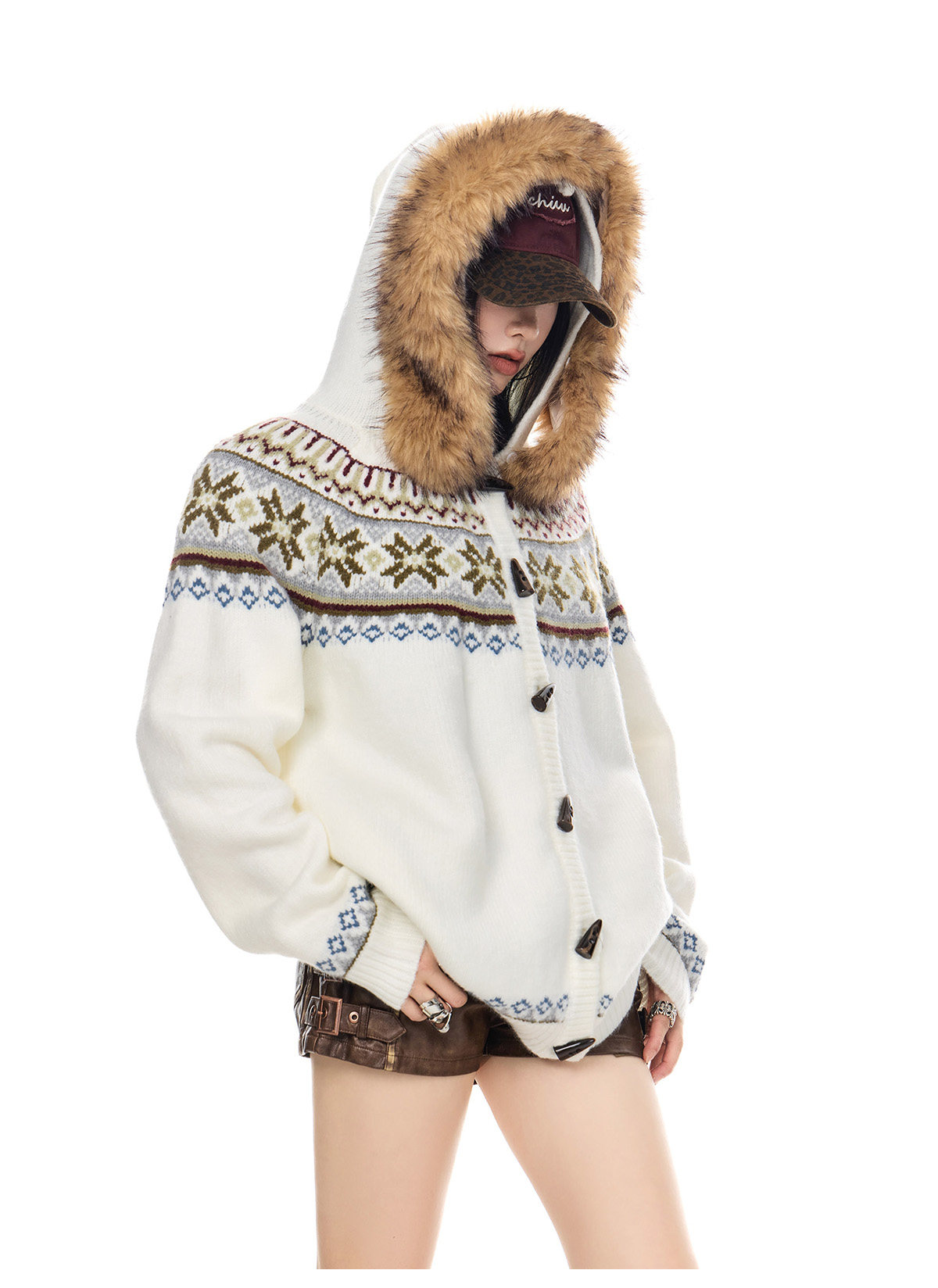 ICH MODE 美式復古費爾島毛領連帽針織開衫女春秋季慵懶毛衣外套