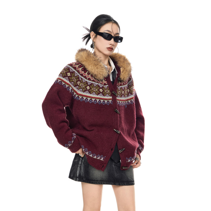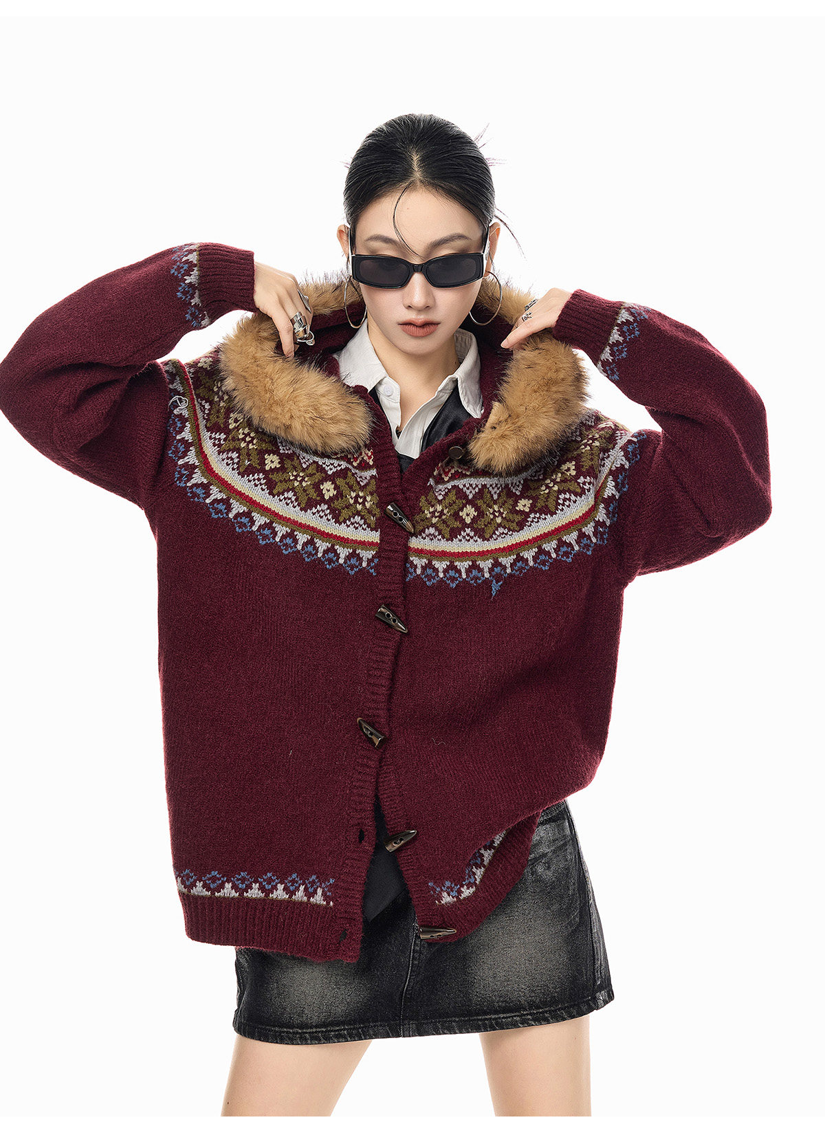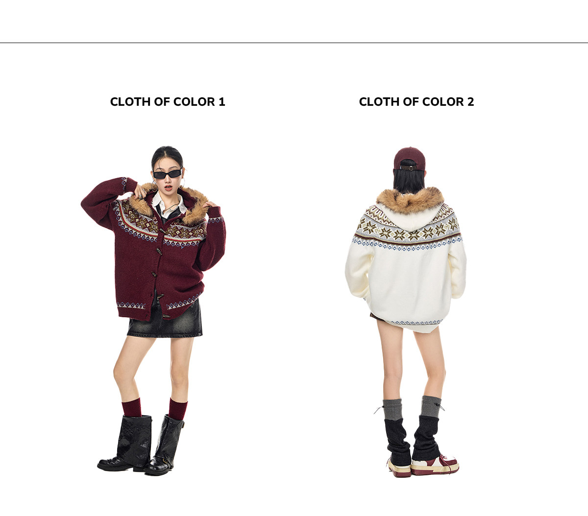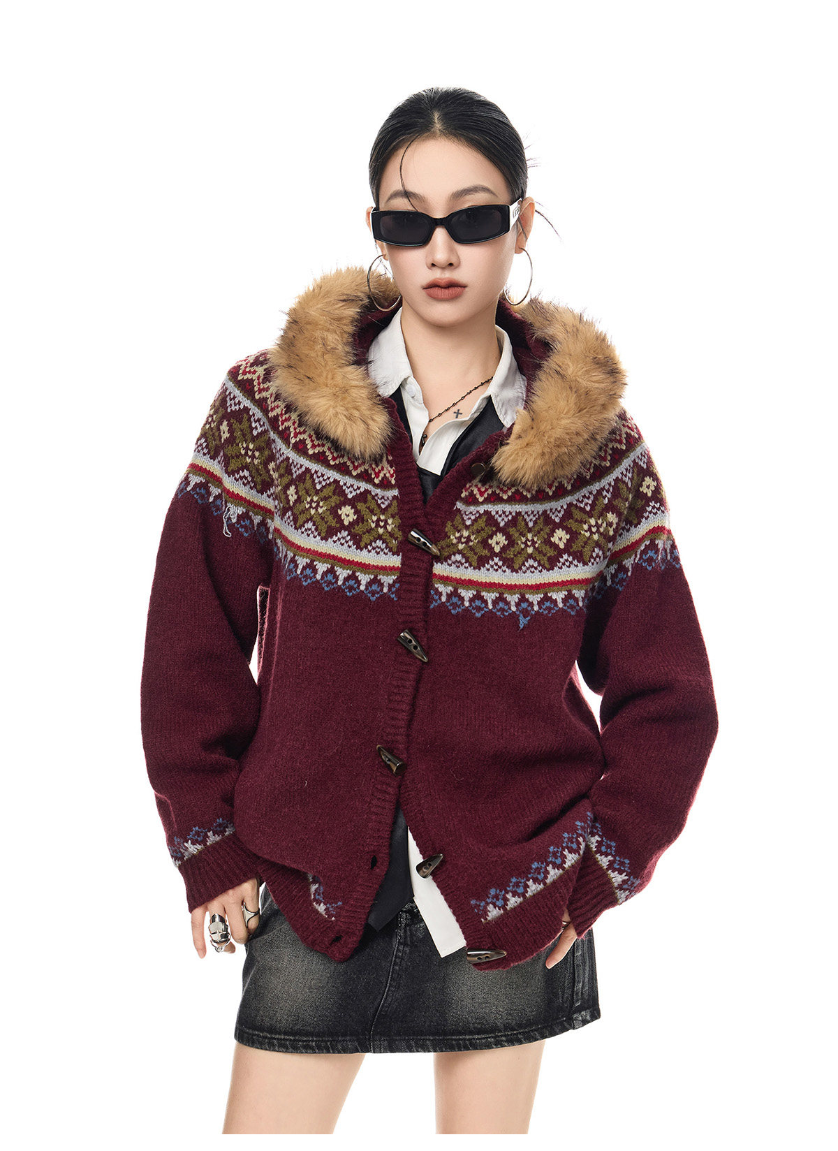 ICH MODE 美式復古費爾島毛領連帽針織開衫女春秋季慵懶毛衣外套