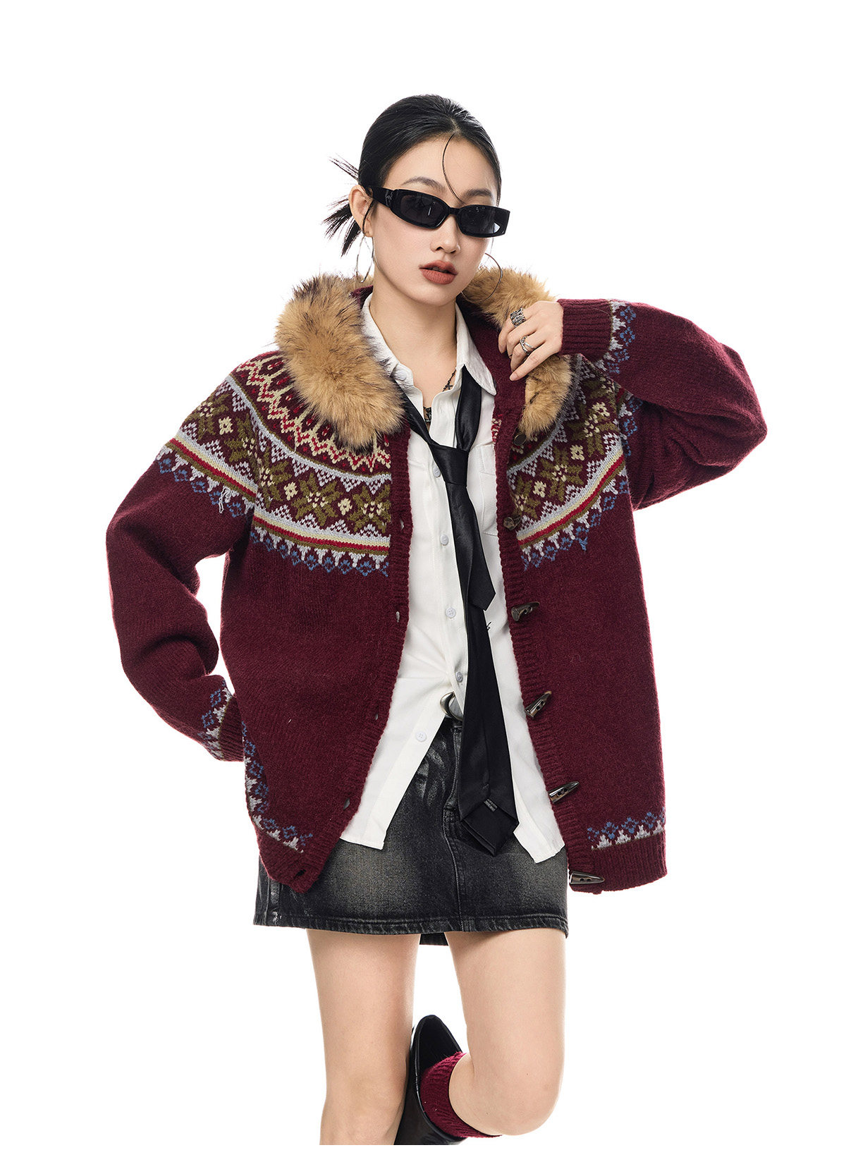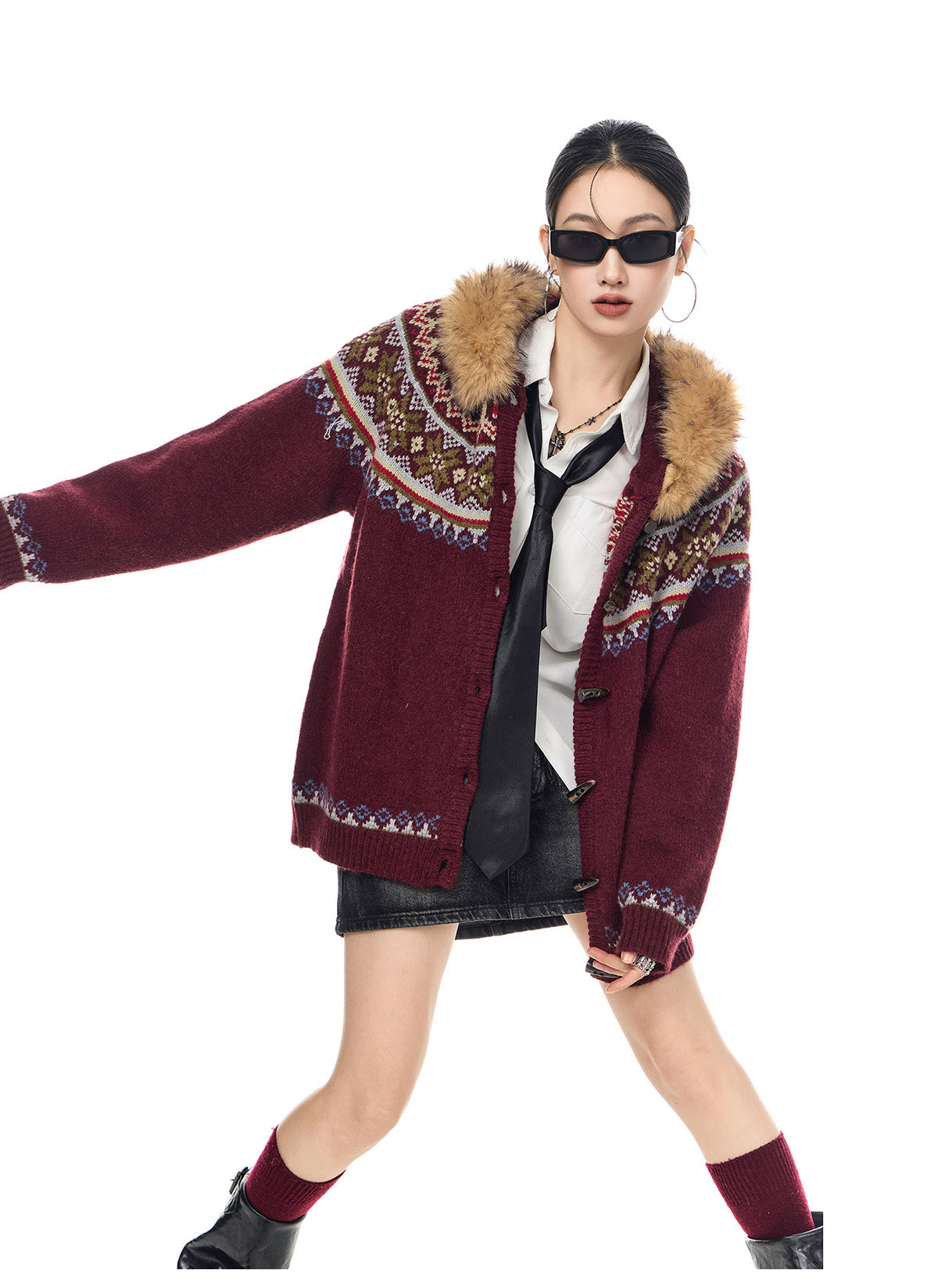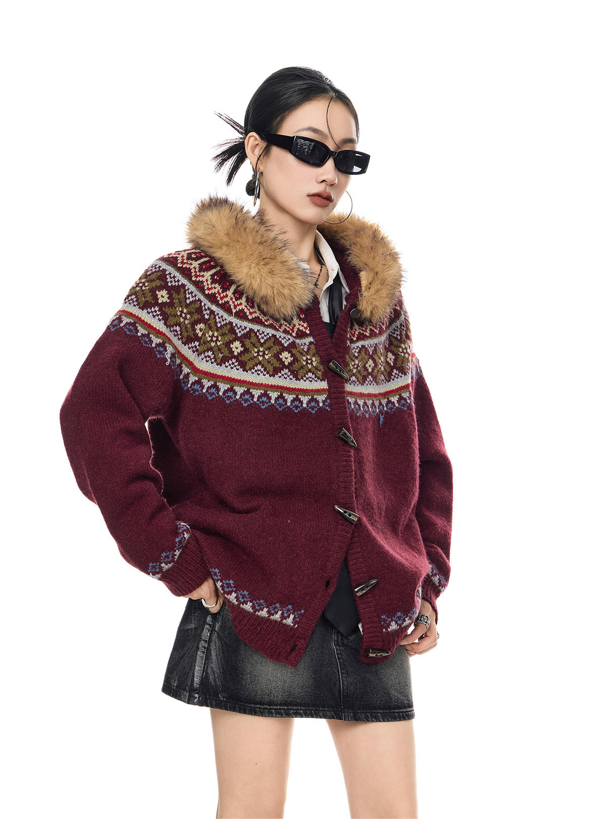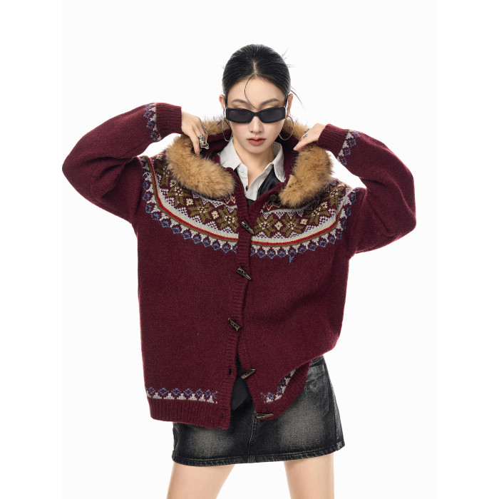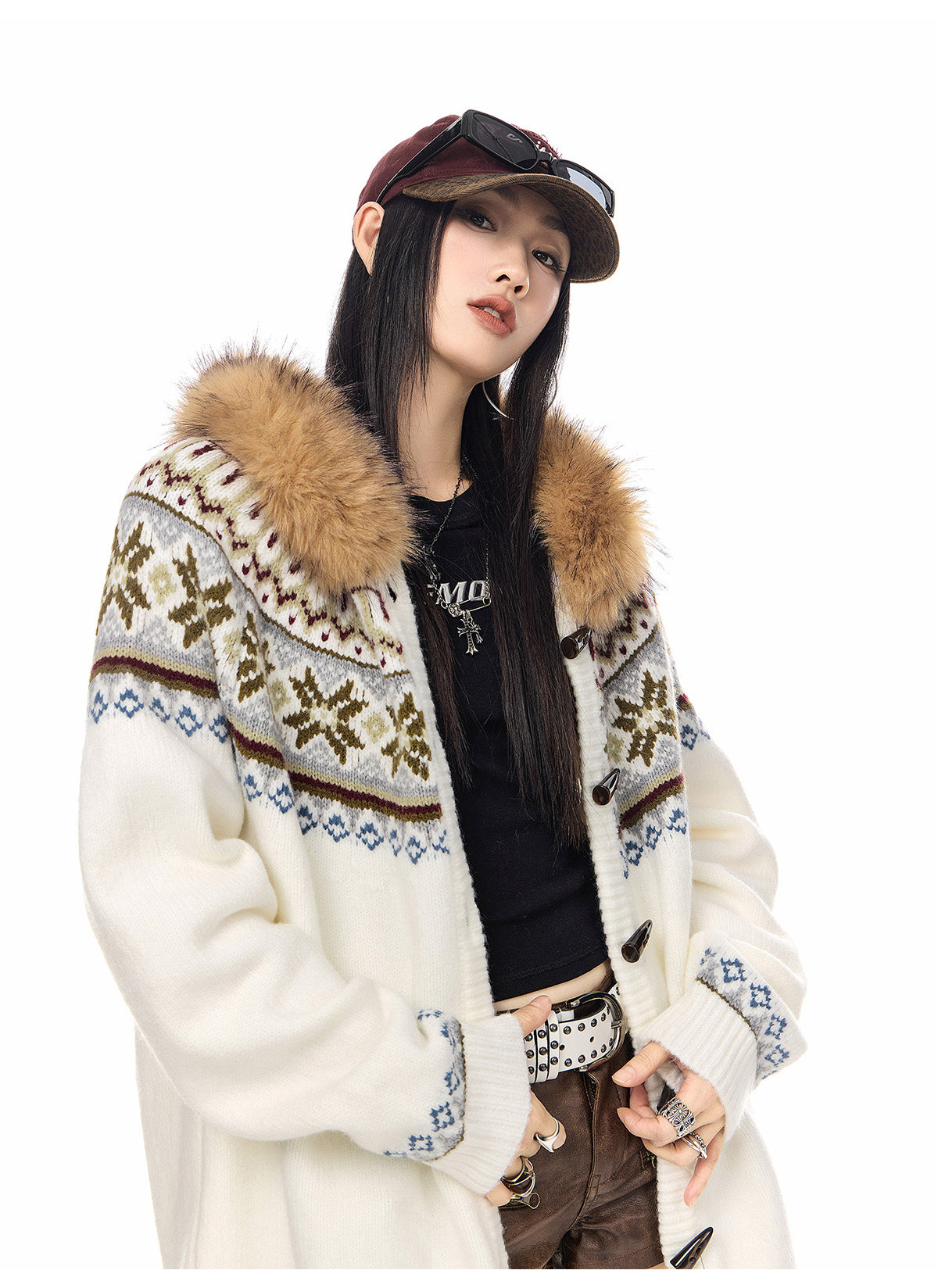ICH MODE 美式復古費爾島毛領連帽針織開衫女春秋季慵懶毛衣外套