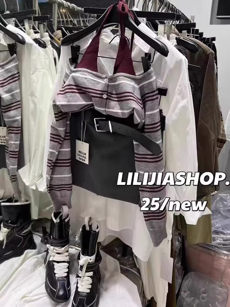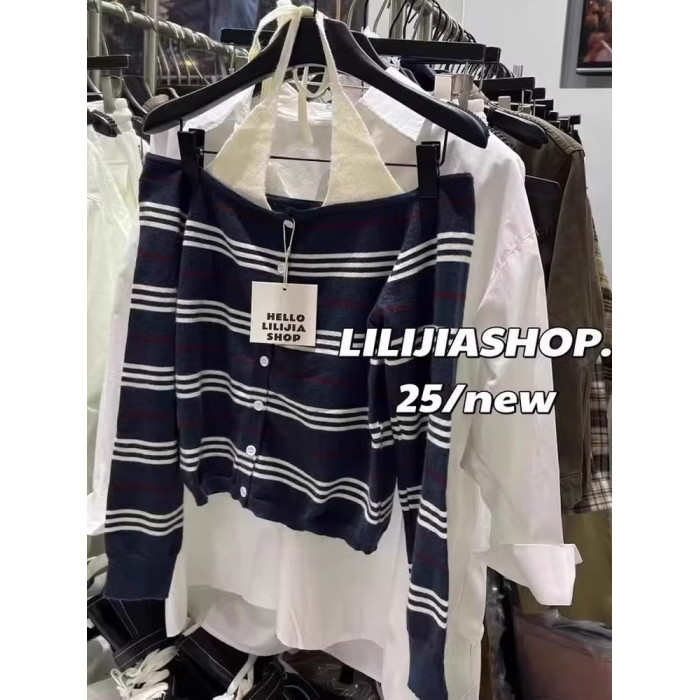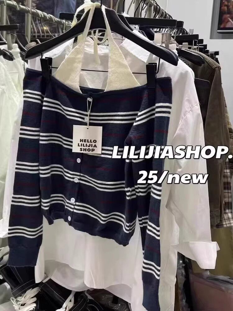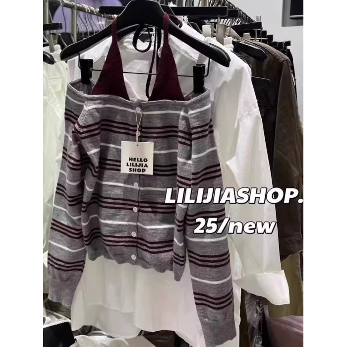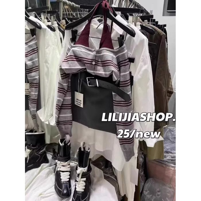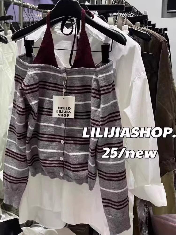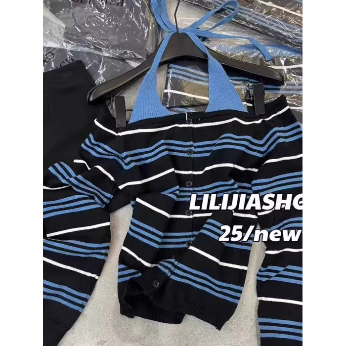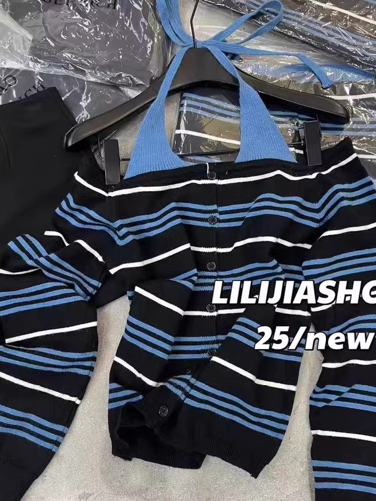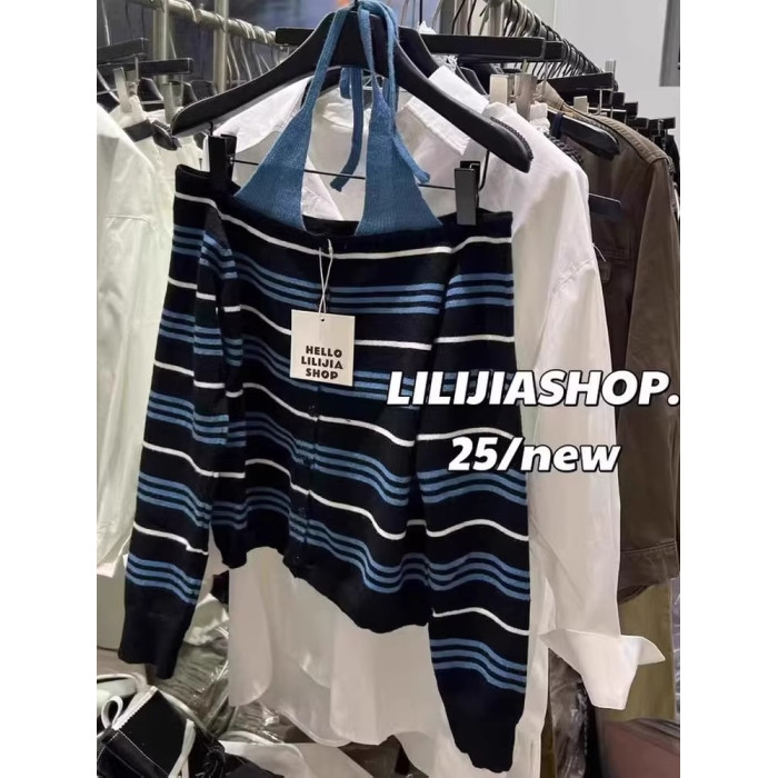 韓國東大門秋季新款洋氣時尚顯瘦百搭條紋掛脖露肩長袖針織上衣女