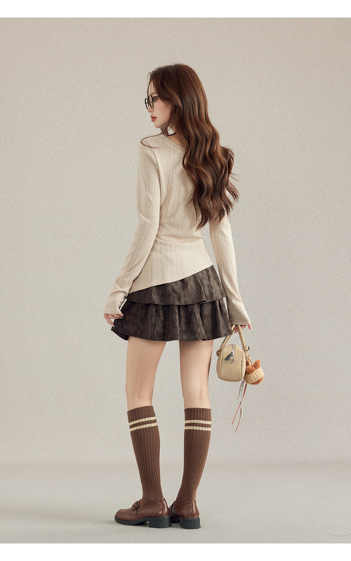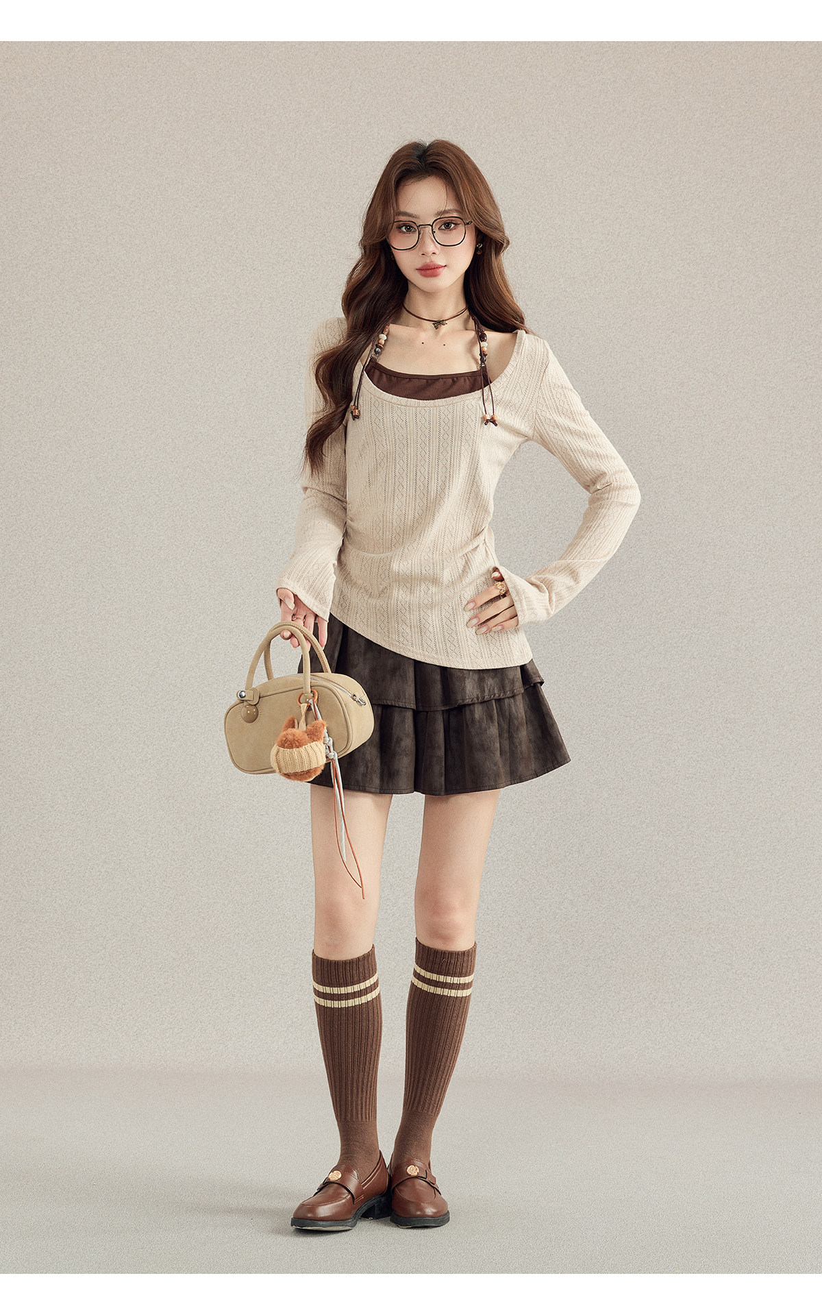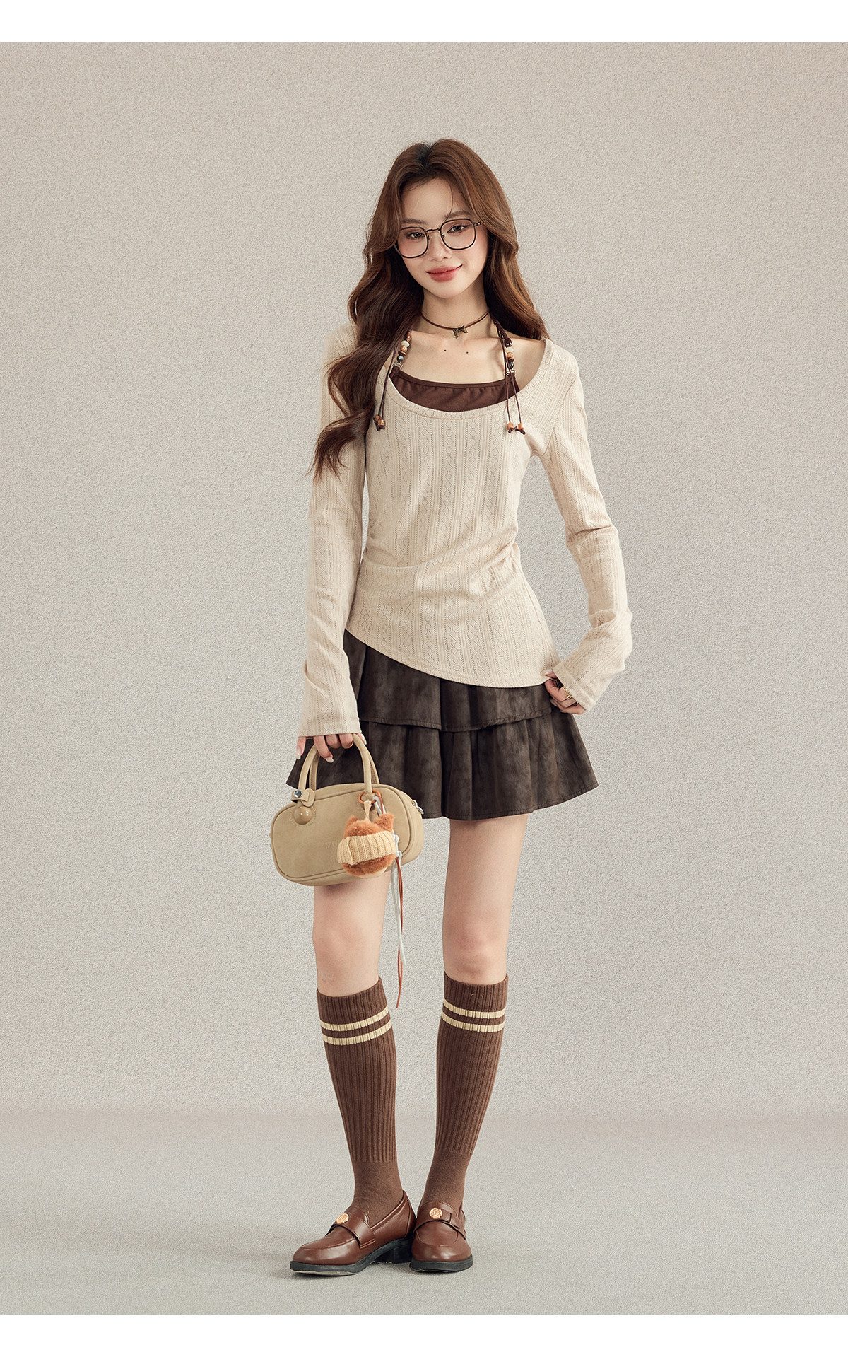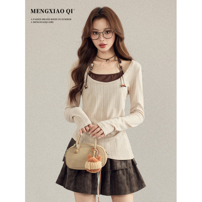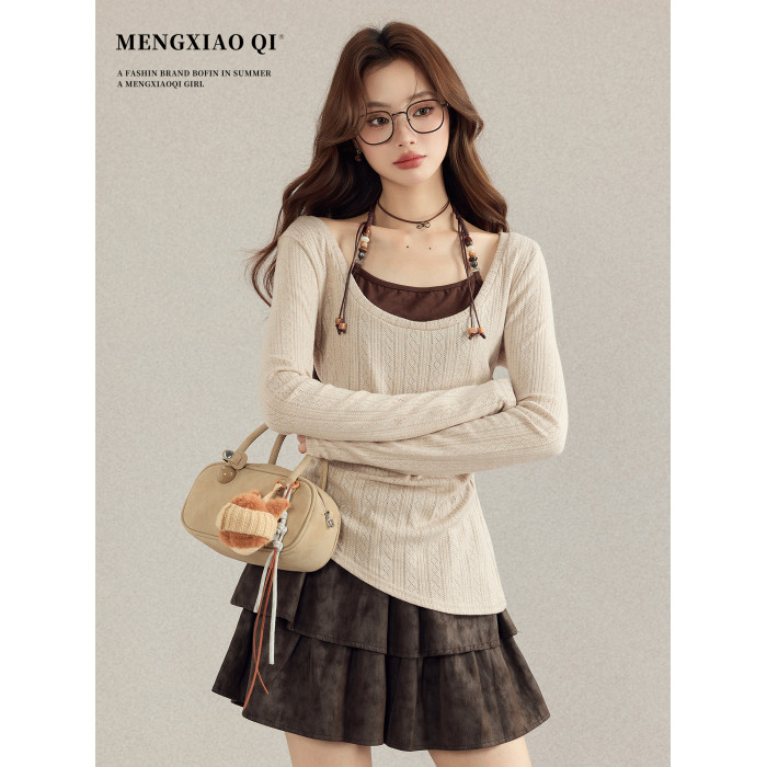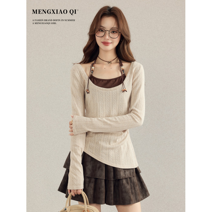 矇小柒美式掛脖假兩件長袖t恤女秋季設計感美拉德復古針織衫上衣
