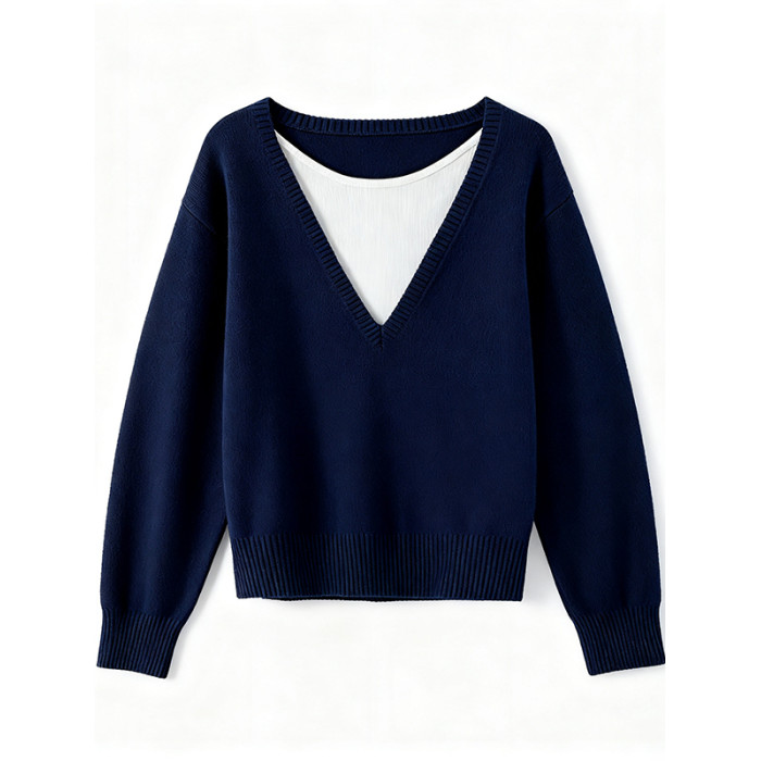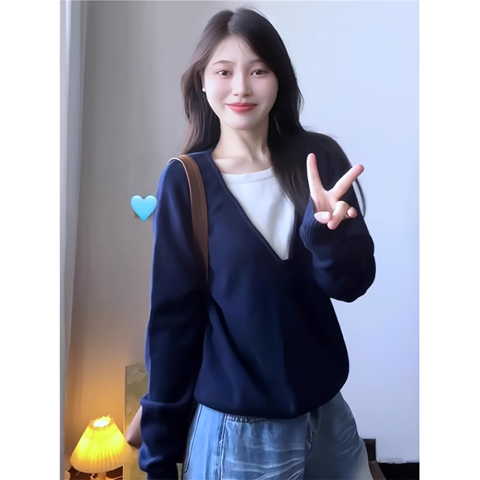 大碼假兩件長袖針織衫女秋冬藏藍色軟糯毛衣胖MM遮肉顯瘦打底上衣