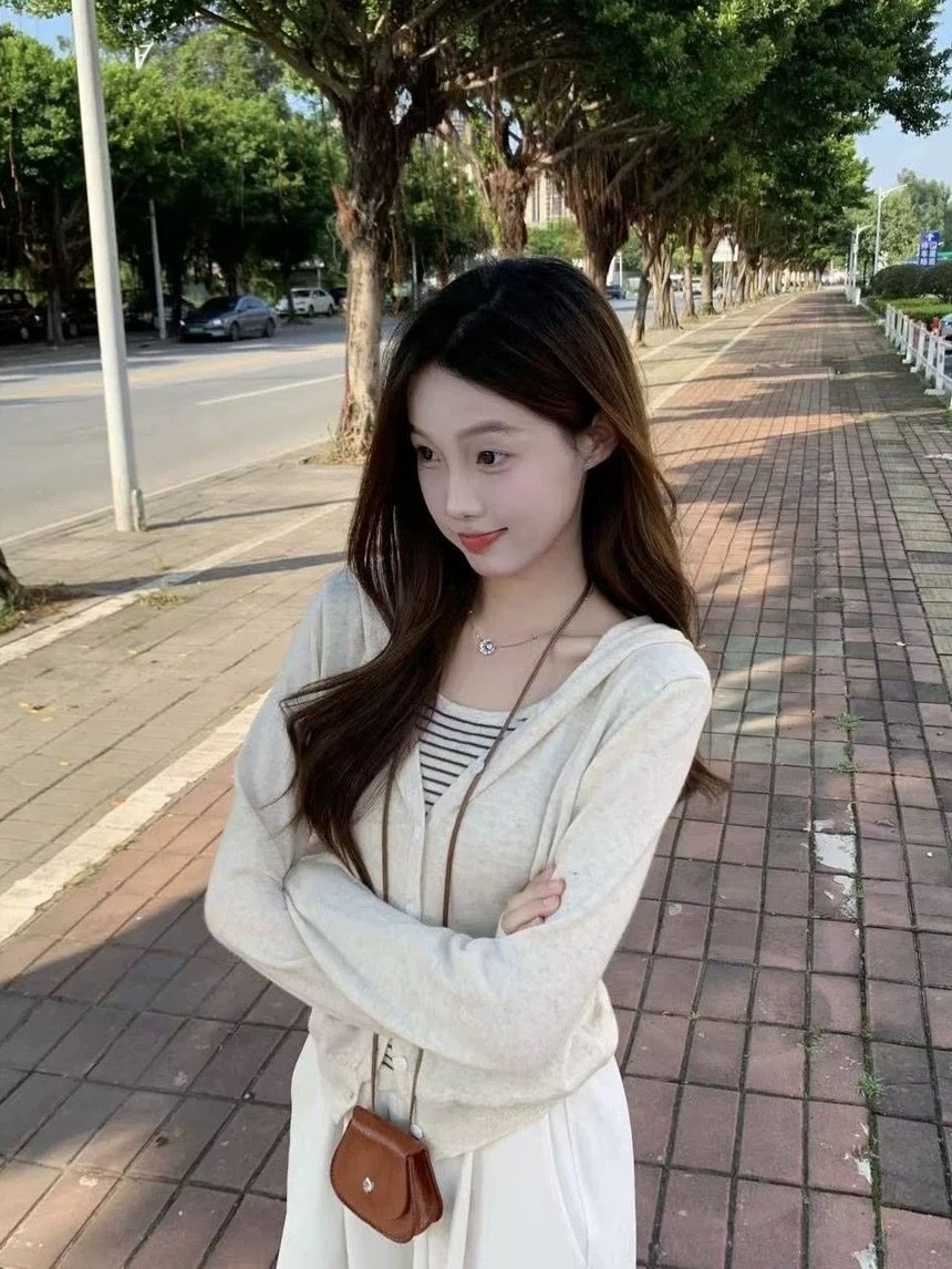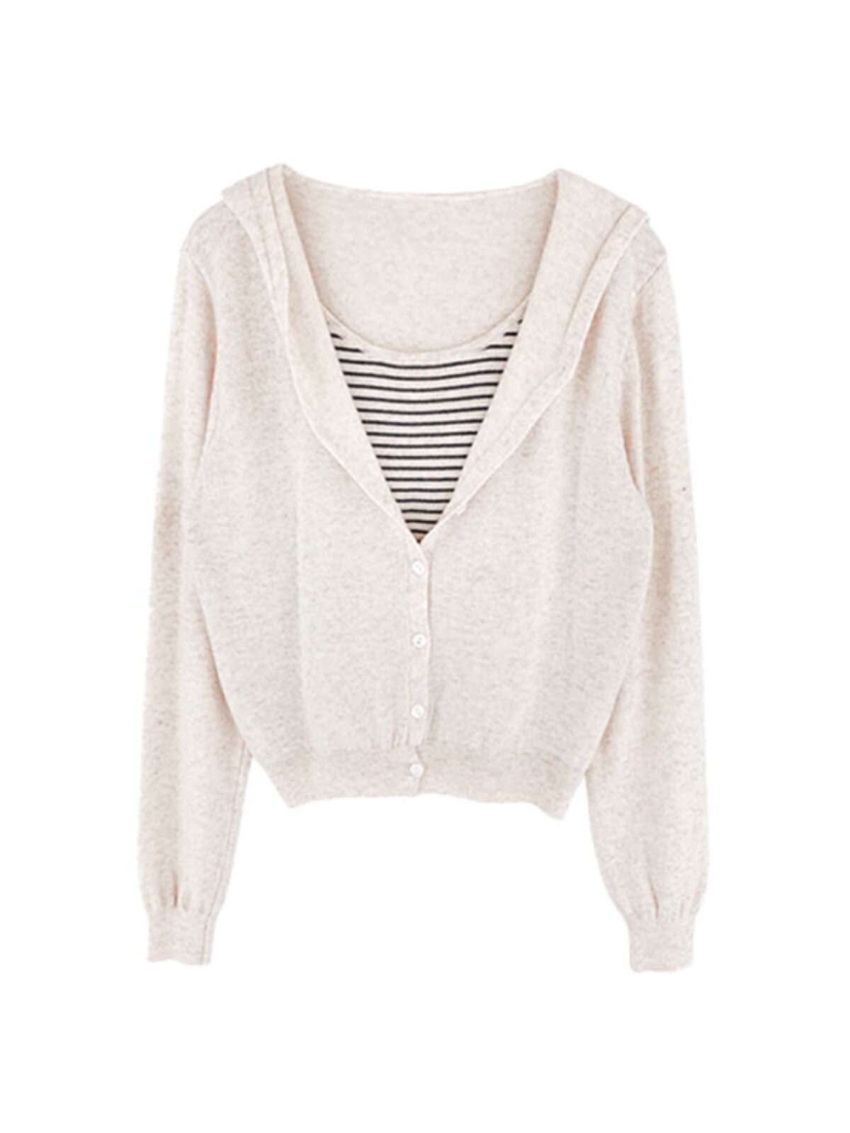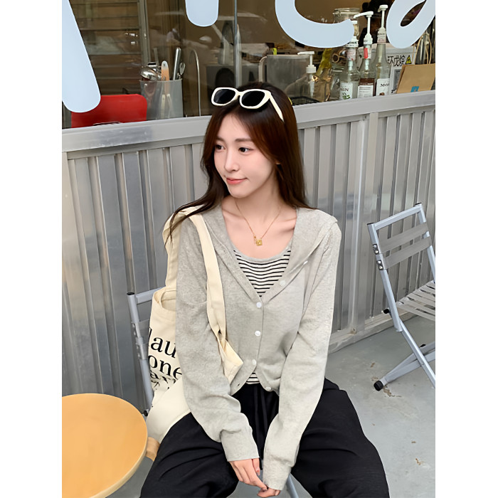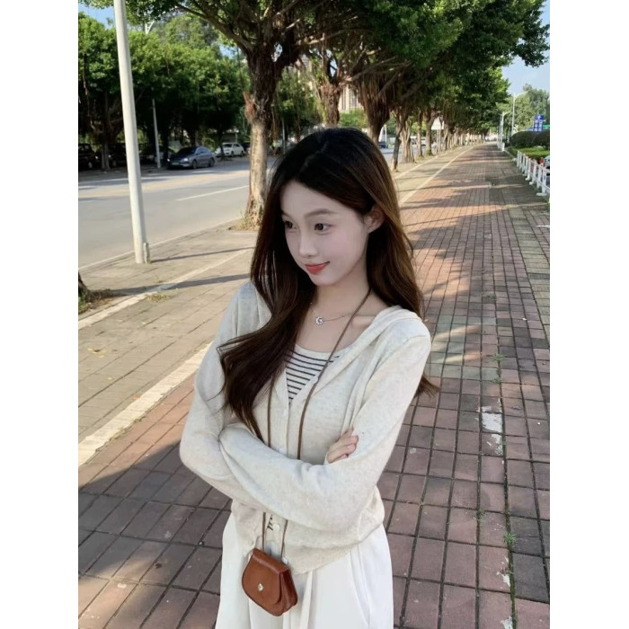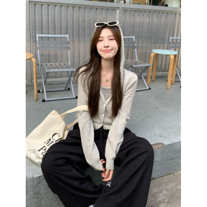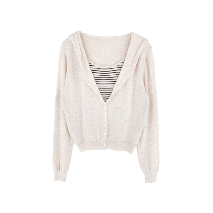 撞色條紋連帽假兩件長袖針織衫女2025早秋新款設計感曡穿毛衣上衣