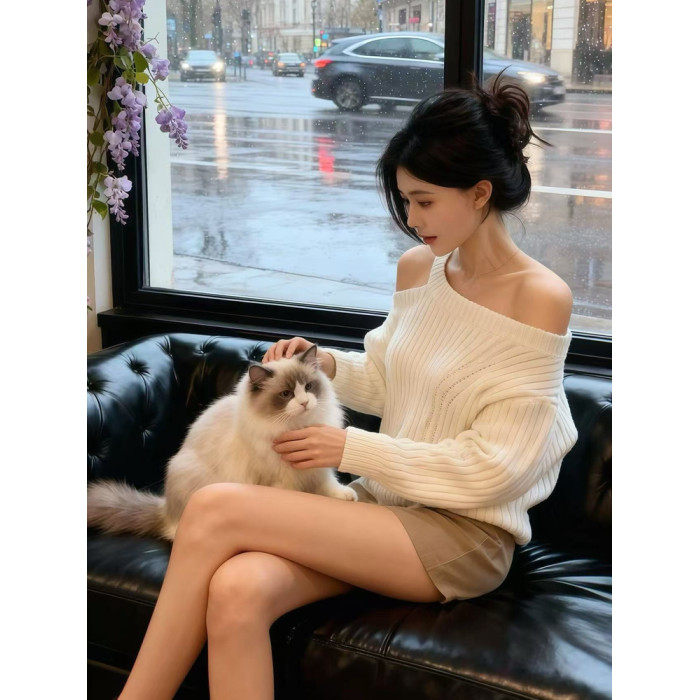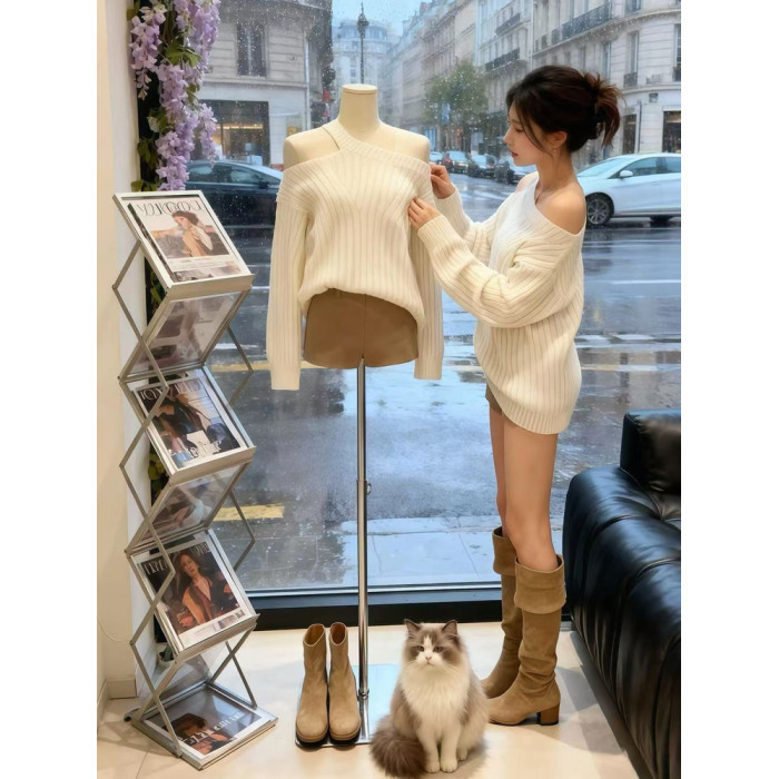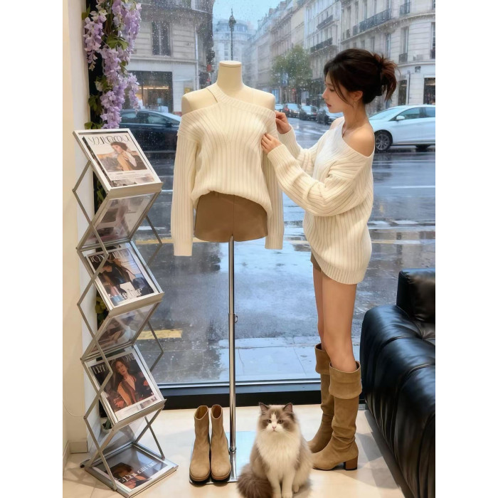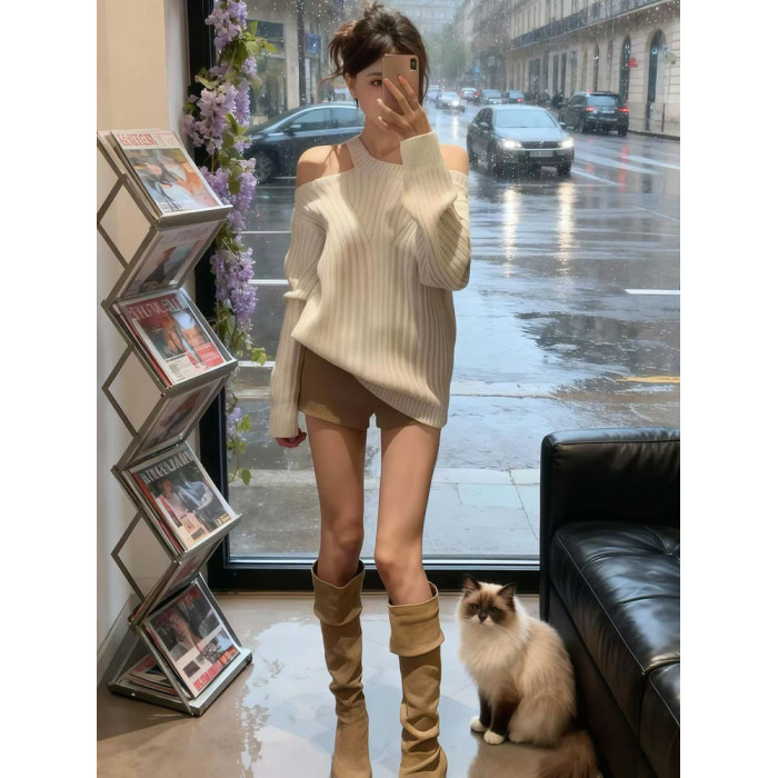 設計感針織衫女秋冬氣質高級感毛衣女巨好看掛脖斜肩寬松慵懶上衣