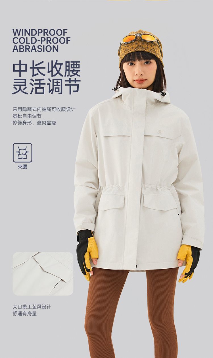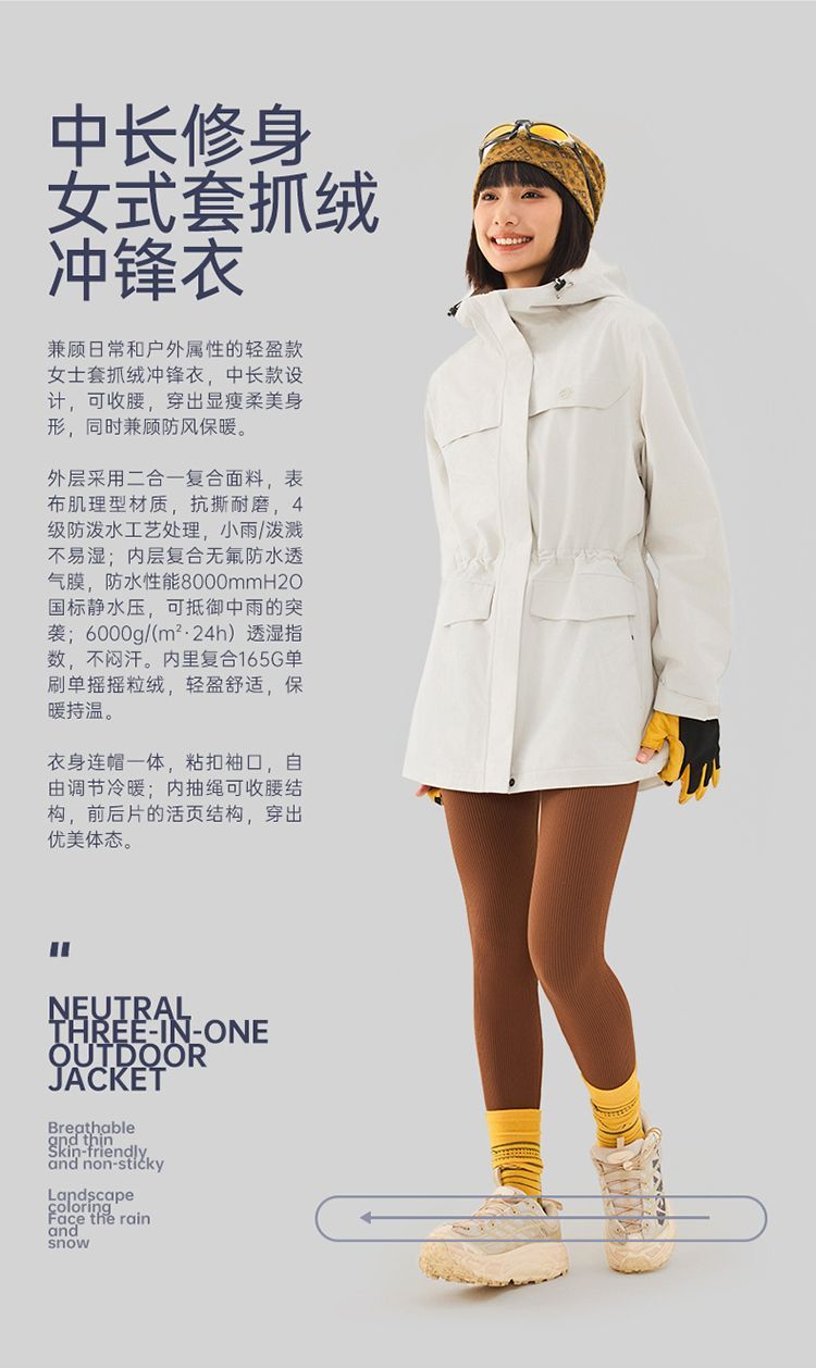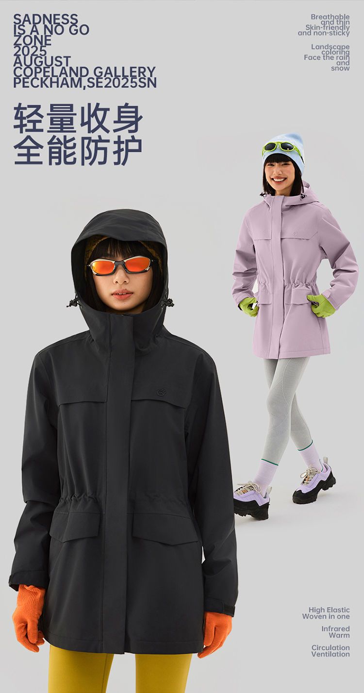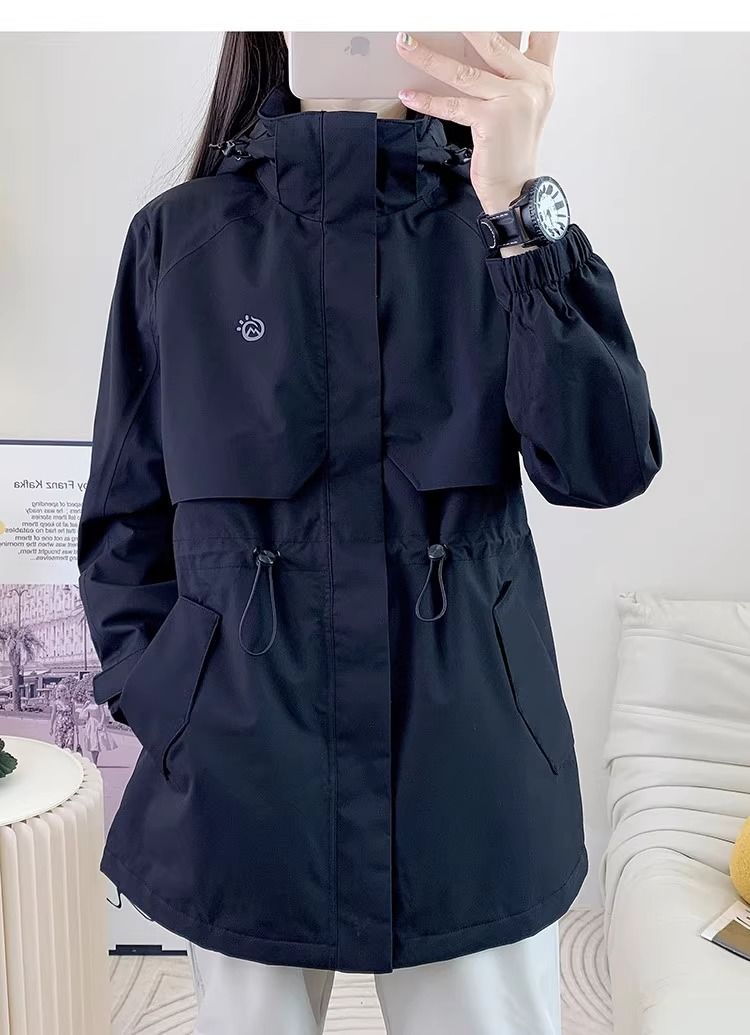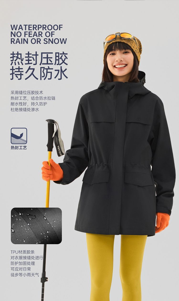 探拓戶外沖鋒衣外套女中長款收腰顯瘦秋冬防風防水保暖加絨登山服
