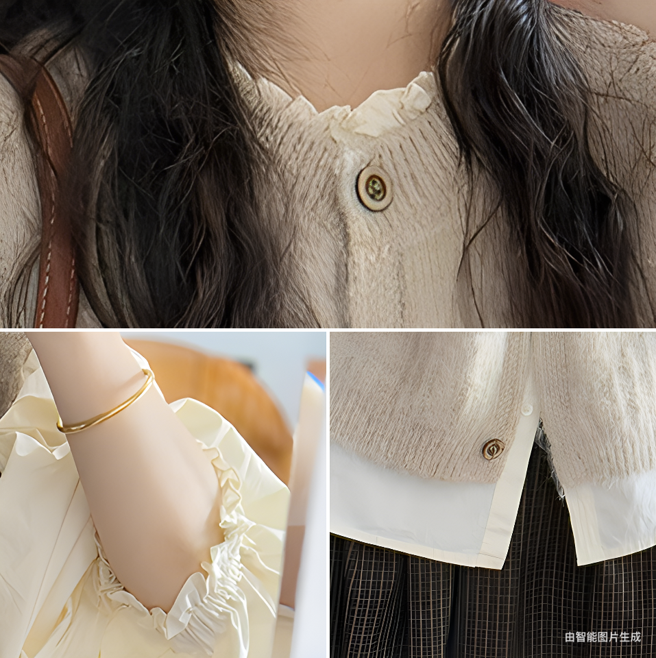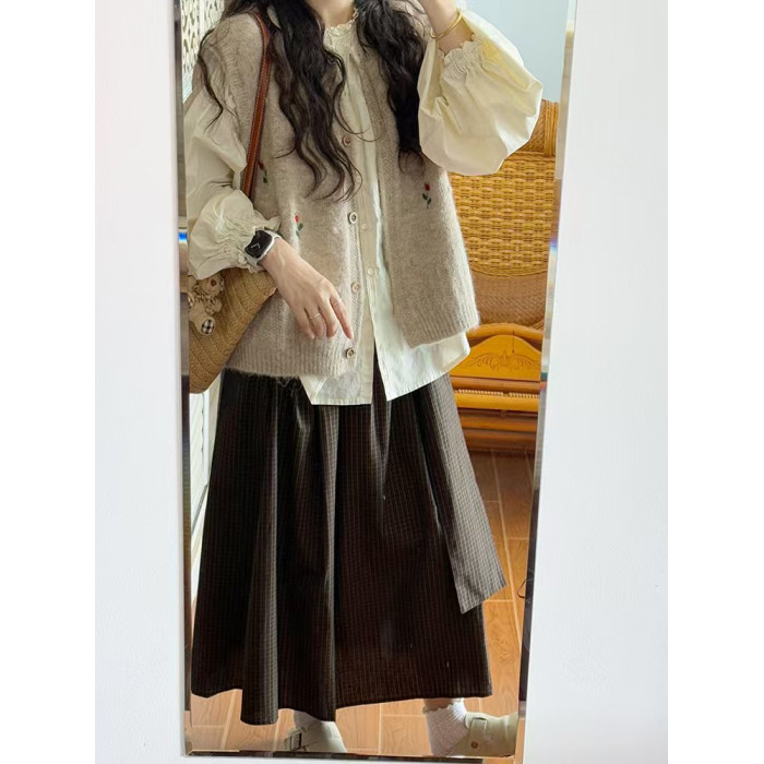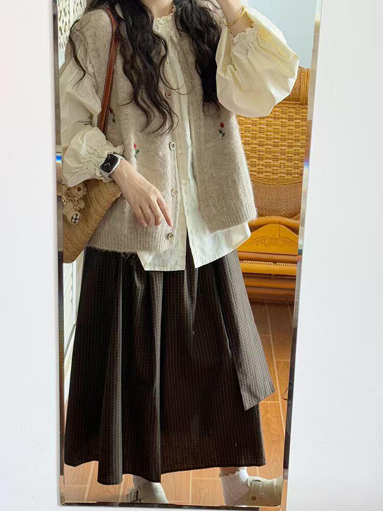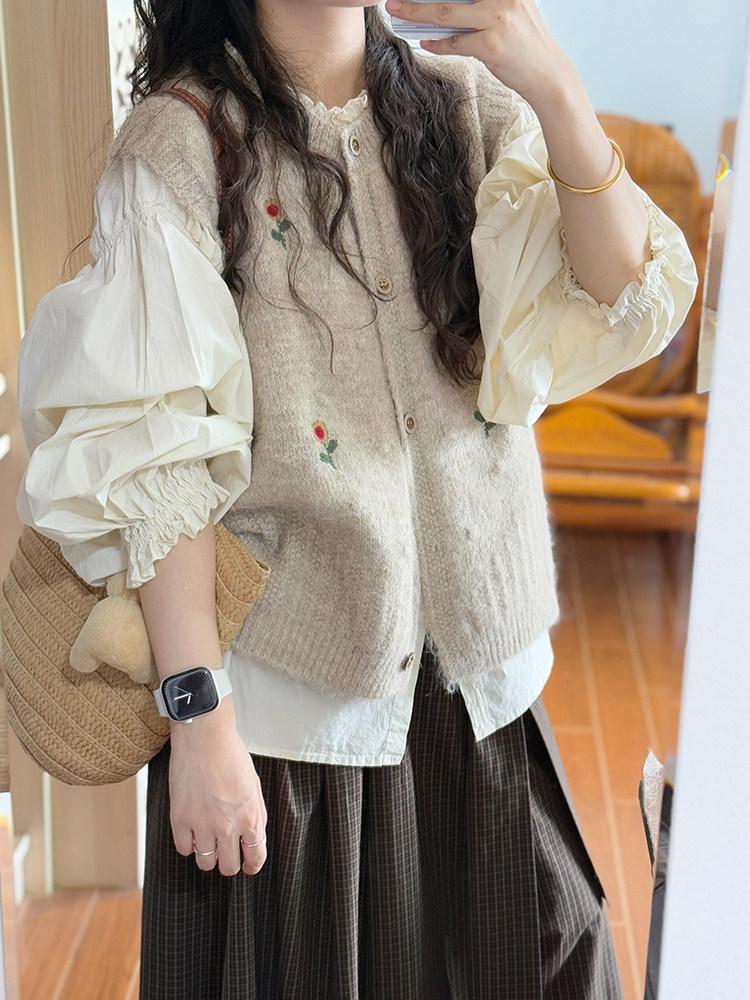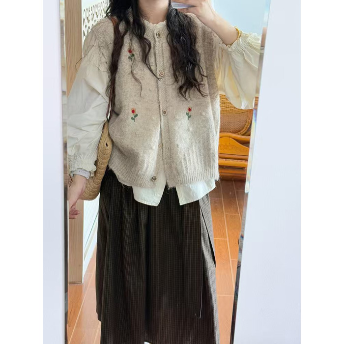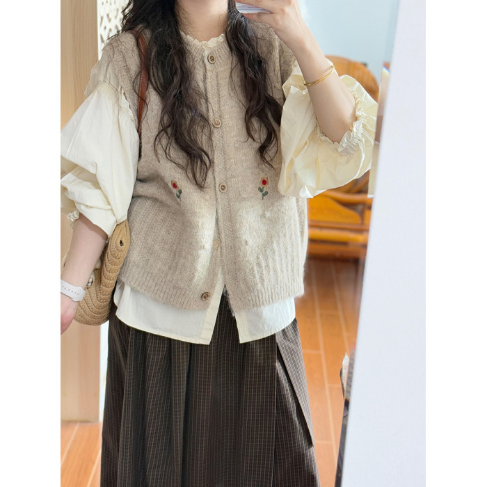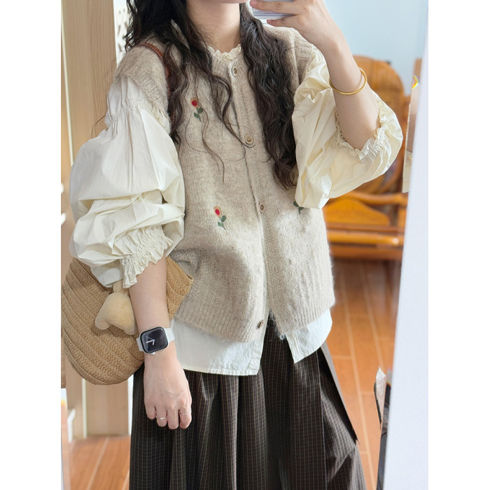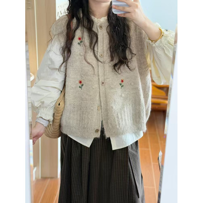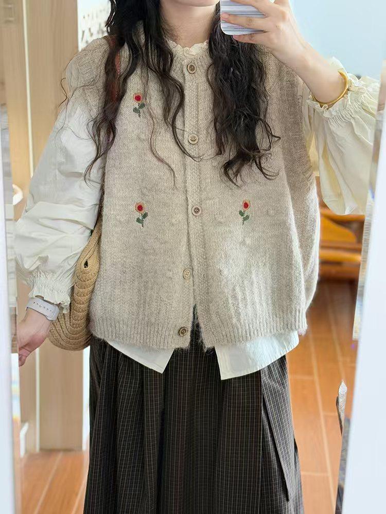 小香風燕麥色花朵刺綉針織開衫曡穿背心馬甲女秋冬外搭小個子上衣