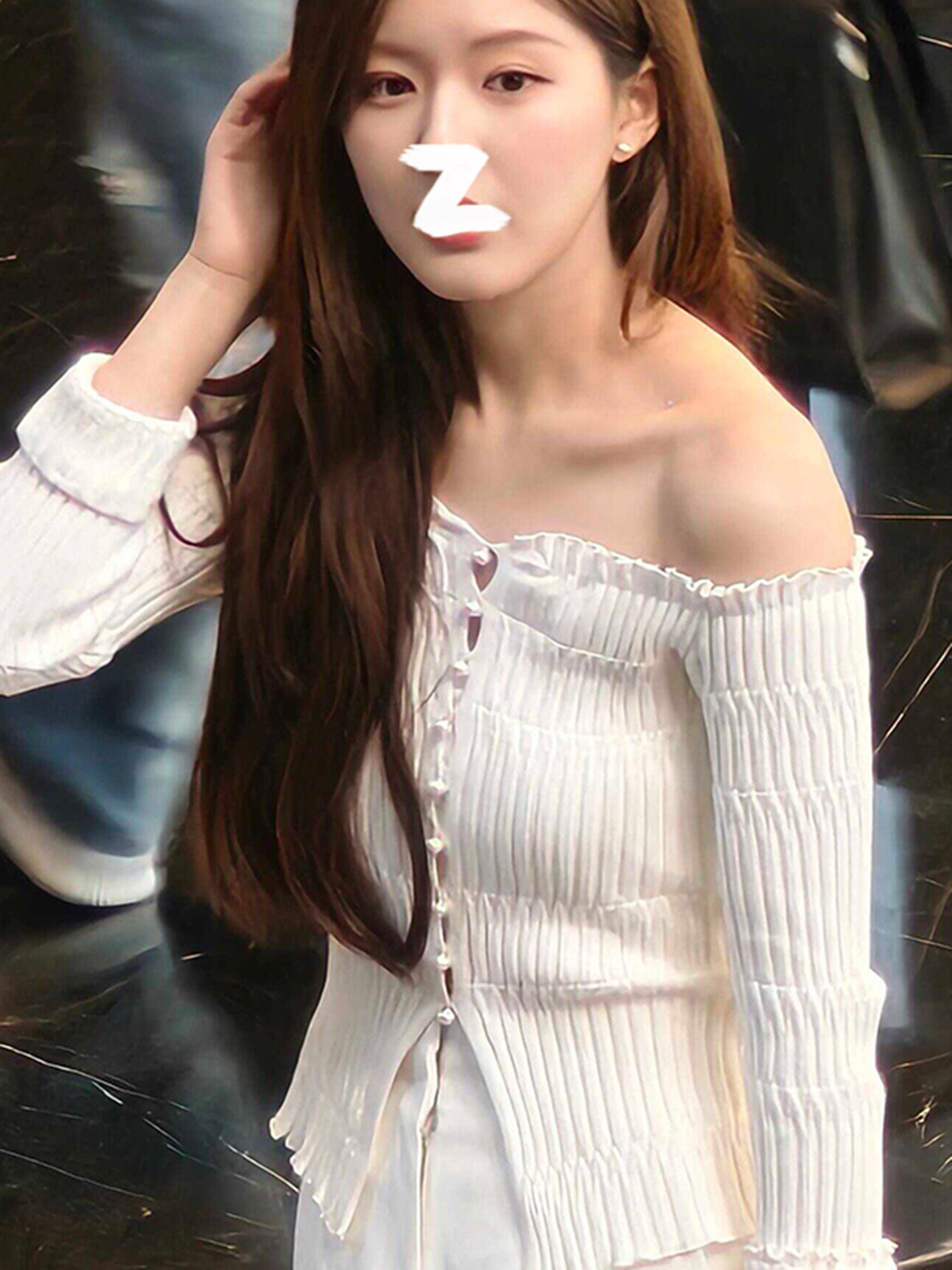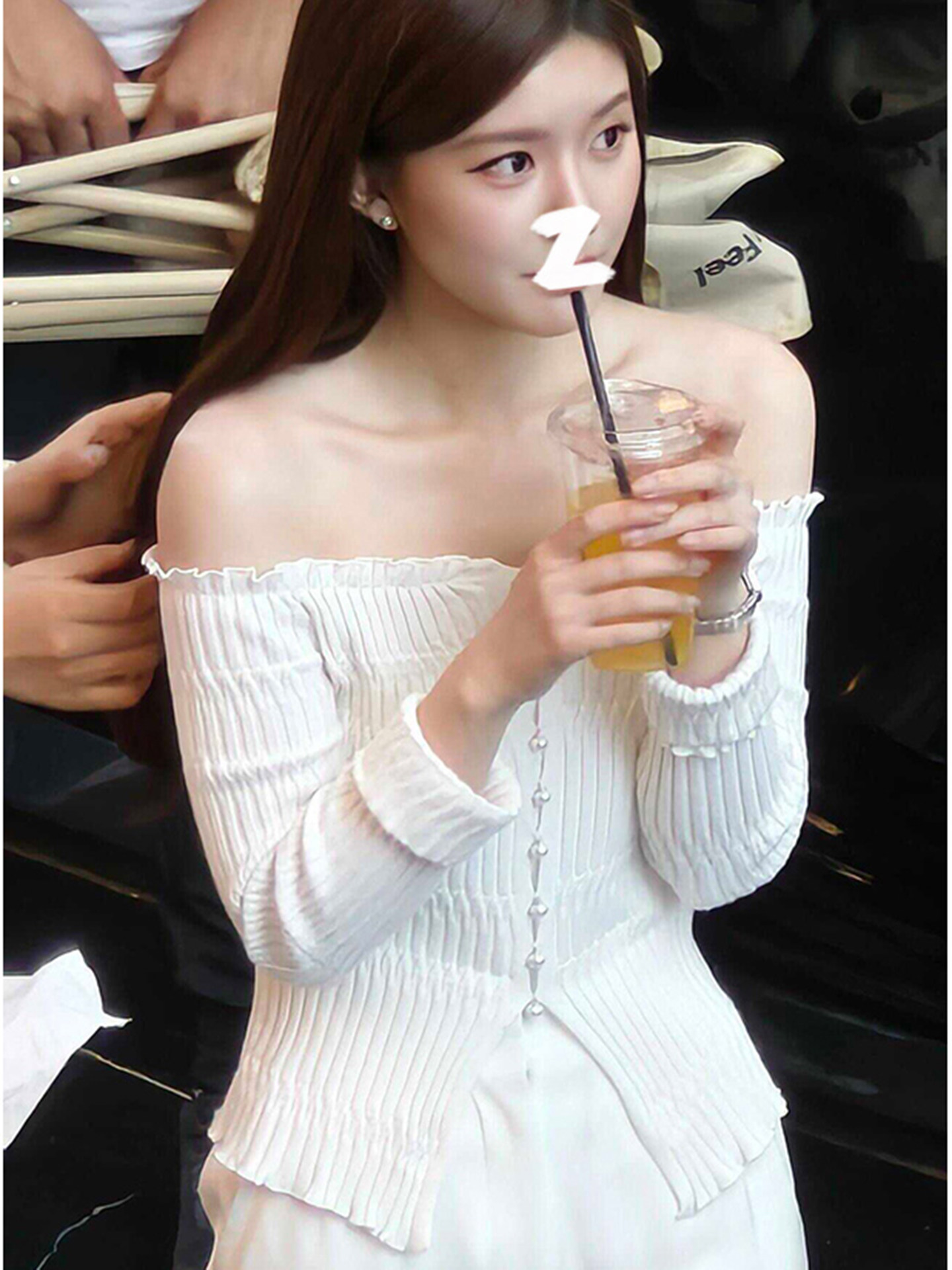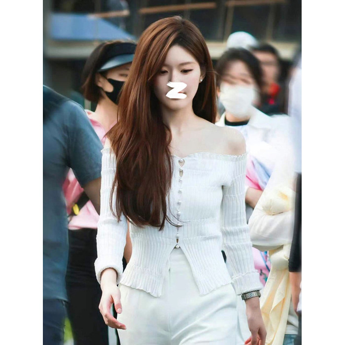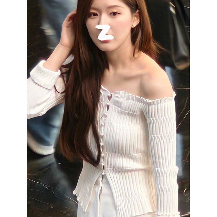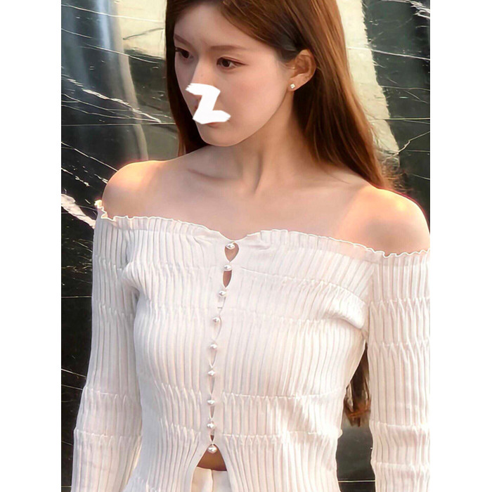 許我耀眼趙露思許妍同款白色一字肩長袖薄款針織衫女法式露肩上衣