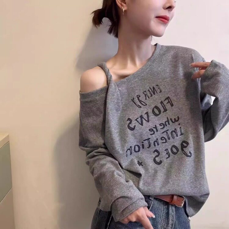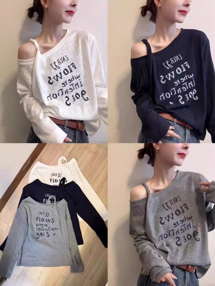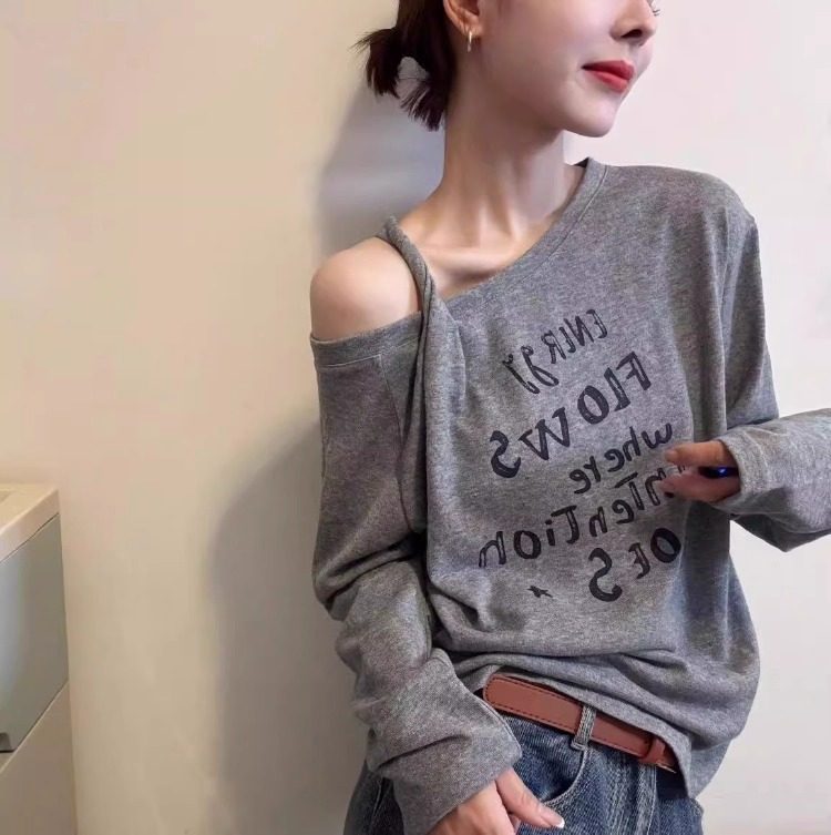 韓系字母印花斜領露肩長袖T恤2025秋季新款女設計感寬松百搭上衣